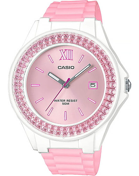Корпус аккуратных и ярких наручных часов от Casio сделан из пластика. Яркий безельБезельВнешний ободок, закрепляющий стекло. В спортивных часах так называется поворотное кольцо с делениями на циферблате, выполняет роль таймера – замеряет отрезки времени на шкале. Неподвижный безель – элемент декора. Однонаправленно вращающийся безель на дайверских часах позволяет фиксировать моменты погружения и выныривания на поверхность. вокруг циферблата отражает падающий свет и добавляет аксессуару привлекательности. На круглом циферблате серебристого цвета расположены аккуратные римские цифры и штрихи. Благодаря кварцевому механизму отсутствует необходимость каждый раз заводить часы. Благодаря подсветке NeobriteПодсветка NeobriteИспользование светонакопительных составов на основе сульфида цинка или алюмината стронция, яркий свет можно наблюдать на протяжении 6-10 часов после «зарядки» часов около источника света. узнать информацию на циферблате легко даже в темное время суток. Водонепроницаемость составляет 50 WR.