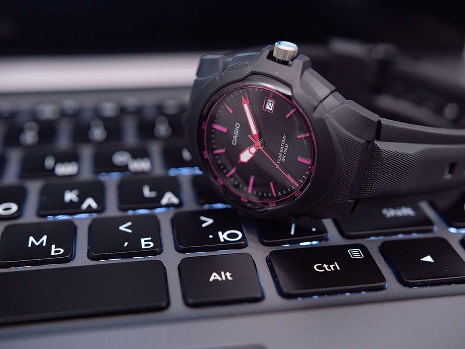 Эффектный дизайн выдержан в темных цветах и призван подчеркнуть мужественность обладателя аксессуара. Прочные корпус и браслет сделаны из пластика. Благодаря подсветке NeobriteПодсветка NeobriteИспользование светонакопительных составов на основе сульфида цинка или алюмината стронция, яркий свет можно наблюдать на протяжении 6-10 часов после «зарядки» часов около источника света. информация на циферблате будет четко видна даже в темное время суток. Минеральное выпуклое стекло надежно защищает часы от повреждений. Есть календарь. Водонепроницаемость часов равна 100 WR. Срок службы батареи составляет 3 года. Вес аксессуара - 35 грамм.