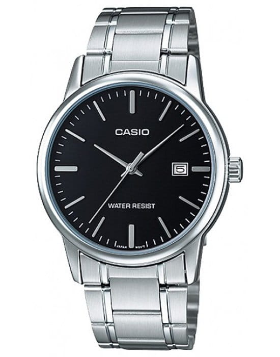 У мужских часов Casio MTP-V002D-1A [MTP-V002D-1AVEF] браслет у модели из долговечной нержавеющей стали, у часов кварцевый механизм, точность хода +/- 20 с/мес, у модели прочное минеральное (кварцевое) стекло, поцарапать такое стекло очень не просто (оно имеет показатель 7 по шкале минералогической твёрдости Мооса), вторым достоинством минеральных стёкол является прочность, разбить такое стекло сложнее чем сапфировое, по этим причинам этот вид стёкол наиболее популярен в часовой индустрии, часы обладают классом водозащиты 30 метров (или 3 атмосферы), поэтому они не испортятся от водных брызг, однако, для плавания не годятся.