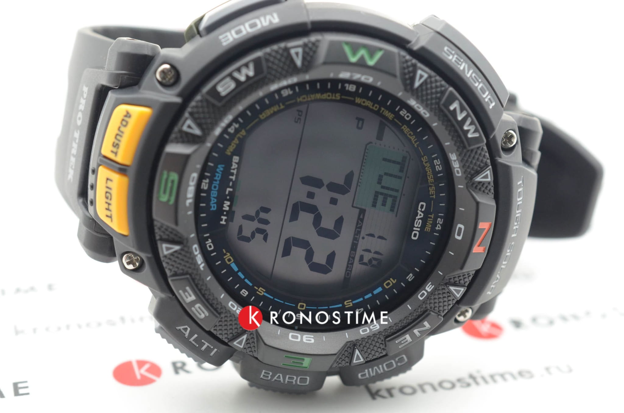 Функциональная модель с зелёными и оранжевыми акцентами обладает расширенными возможностями. Каждое усложнение направляет усилия на то, чтобы ваше путешествие прошло легко и насыщенно. Среди функций компас, барометр, индикатор температуры, мировое времяМировое время Полезное часовое усложнение, отображающее время в основных городах и известных областях по всему миру, оно связано с часовыми поясами, удобно для путешественников и бизнесменов. , график восхода и заката солнца, высотомер, таймер. Японский кварцевый механизм. Технология . Индикатор состояния заряда батареи. Электролюминесцентная подсветкаЭлектролюминесцентная подсветкаЭлектролюминесцентная панель устанавливается под ЖК-экраном часов, при нажатии кнопки электричество преобразуется в свет за счёт подачи напряжения на атомы фосфора, такой тип подсветки позволяет освещать весь циферблат. циферблата. Ударопрочный корпусУдаропрочный корпусМеханизм заключён в корпус, выполненный из современных материалов, устойчивых к ударам, механическим повреждениям и падению с высоты: инновационный пластик, карбон, нержавеющая сталь, титан. и ремешок из полимерного материала. Вращающийся безельБезельВнешний ободок, закрепляющий стекло. В спортивных часах так называется поворотное кольцо с делениями на циферблате, выполняет роль таймера – замеряет отрезки времени на шкале. Неподвижный безель – элемент декора. Однонаправленно вращающийся безель на дайверских часах позволяет фиксировать моменты погружения и выныривания на поверхность.. Минеральное стекло. Водостойкость до 10 бар. Устойчивость к температуре ниже -10°C. Габариты: 57,3 x 50,9 x 15,3 мм.
