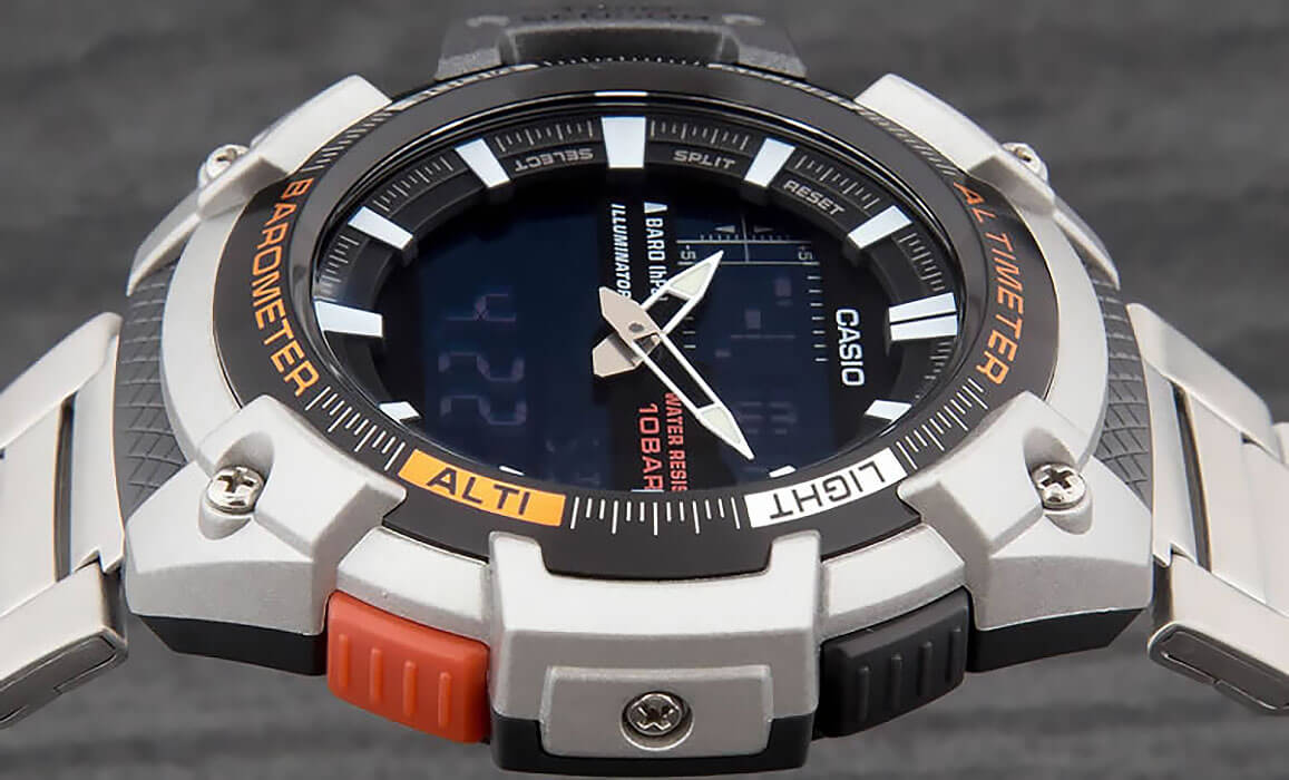 Аналоговый и цифровой вариант отображения времени, летнее/зимнее время, мировое время (есть Москва), секундомер (с возможностью учета времени круга и финиша двух спортсменов), таймер (без автоповтора), 5 будильников, сигнал начала часа, электролюминесцентная подсветка, барометр (погрешность 1-2 мм. рт. ст.), термометр (нужно снимать часы с руки, чтоб остывали), альтиметр (погрешность +/-20м), пластиковый корпус, металлический безель, пластиковое стекло, металлический браслет.