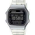 Винтажные японские часы Casio Vintage A168XES-1BDF. Корпус часов выполнен из пластика. Прозрачный силиконовый ремешок на стандартной застёжке. Автоматический вечный календарьВечный календарьКлассическое часовое усложнение, представляющее собой календарь, рассчитанный на несколько лет вперёд (стандартно – до 2099 года). Определяет текущую дату, день недели, месяц.. 12 и 24-часовой формат времени. Акриловое стекло. БудильникБудильникБуди́льник — часы, в заданный момент времени подающие звуковой, световой и/или в редких случаях другой сигнал., таймерТаймерОтсчитывает секунды в обратном направлении в заданном интервале времени., секундомерСекундомерСекундоме́р — прибор, способный измерять интервалы времени с точностью до долей секунды.. Электролюминесцентная подсветкаЭлектролюминесцентная подсветкаЭлектролюминесцентная панель устанавливается под ЖК-экраном часов, при нажатии кнопки электричество преобразуется в свет за счёт подачи напряжения на атомы фосфора, такой тип подсветки позволяет освещать весь циферблат. циферблата. Класс водозащиты: 30 метров, позволит защитить корпус от случайных брызг или капель дождя.