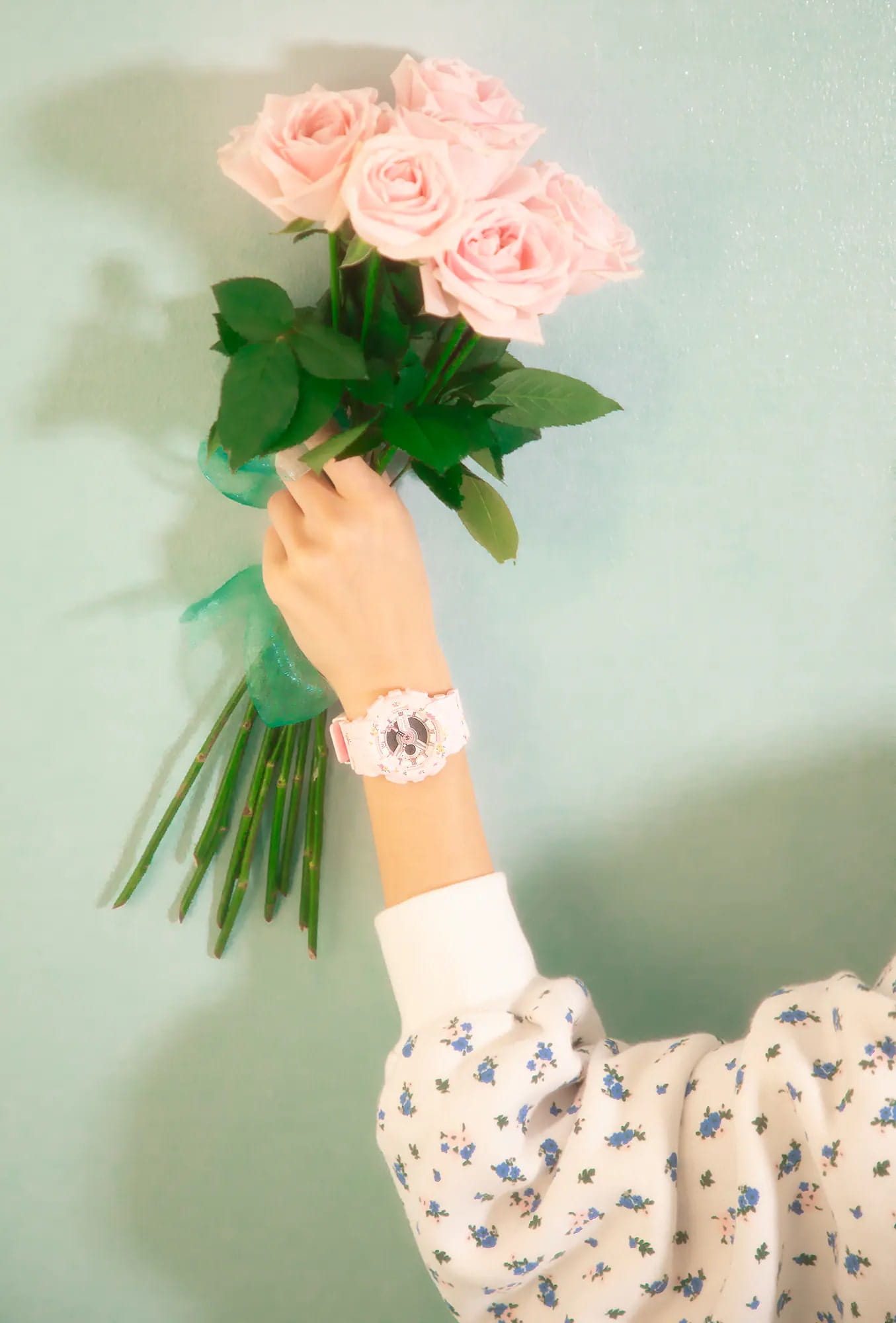 Японские женские многофункциональные часы BA-110LSB-4A из коллекции Baby-G созданные в сотрудничестве с производителем женской одежды Little Sunny Bite. Отличительная черта - рисунки цветов на корпусе и ремешке. Функции: автоматическая светодиодная подсветка, ударопрочный корпусУдаропрочный корпусМеханизм заключён в корпус, выполненный из современных материалов, устойчивых к ударам, механическим повреждениям и падению с высоты: инновационный пластик, карбон, нержавеющая сталь, титан., функция Мирового времениМировое время Полезное часовое усложнение, отображающее время в основных городах и известных областях по всему миру, оно связано с часовыми поясами, удобно для путешественников и бизнесменов. , GMTGMTОтображение времени второго часового пояса.Такая функция особенно актуальна для путешественников и бизнесменов,которые общаются с людьми из разных стран,теперь вы всегда будете знать,какой час у вашего партнёра или близкого человека., секундомерСекундомерСекундоме́р — прибор, способный измерять интервалы времени с точностью до долей секунды., таймерТаймерОтсчитывает секунды в обратном направлении в заданном интервале времени., 5 будильниковБудильникБуди́льник — часы, в заданный момент времени подающие звуковой, световой и/или в редких случаях другой сигнал., автоматический календарь, 12/24 отображение времени. Минеральное стекло, корпус из полимерного пластика и нержавеющей стали, ремешок из полимерного материала, стандартная застежка, водонепроницаемость (10 бар). Габариты (Ш x В x Г) 43,4 х 46,3 х 15,8. Вес 45 г.