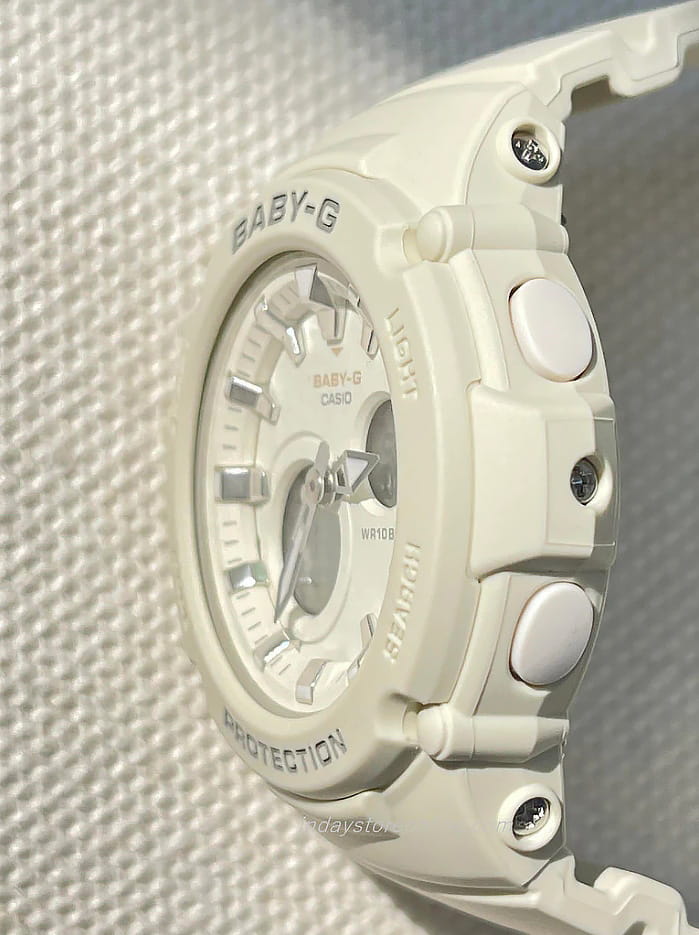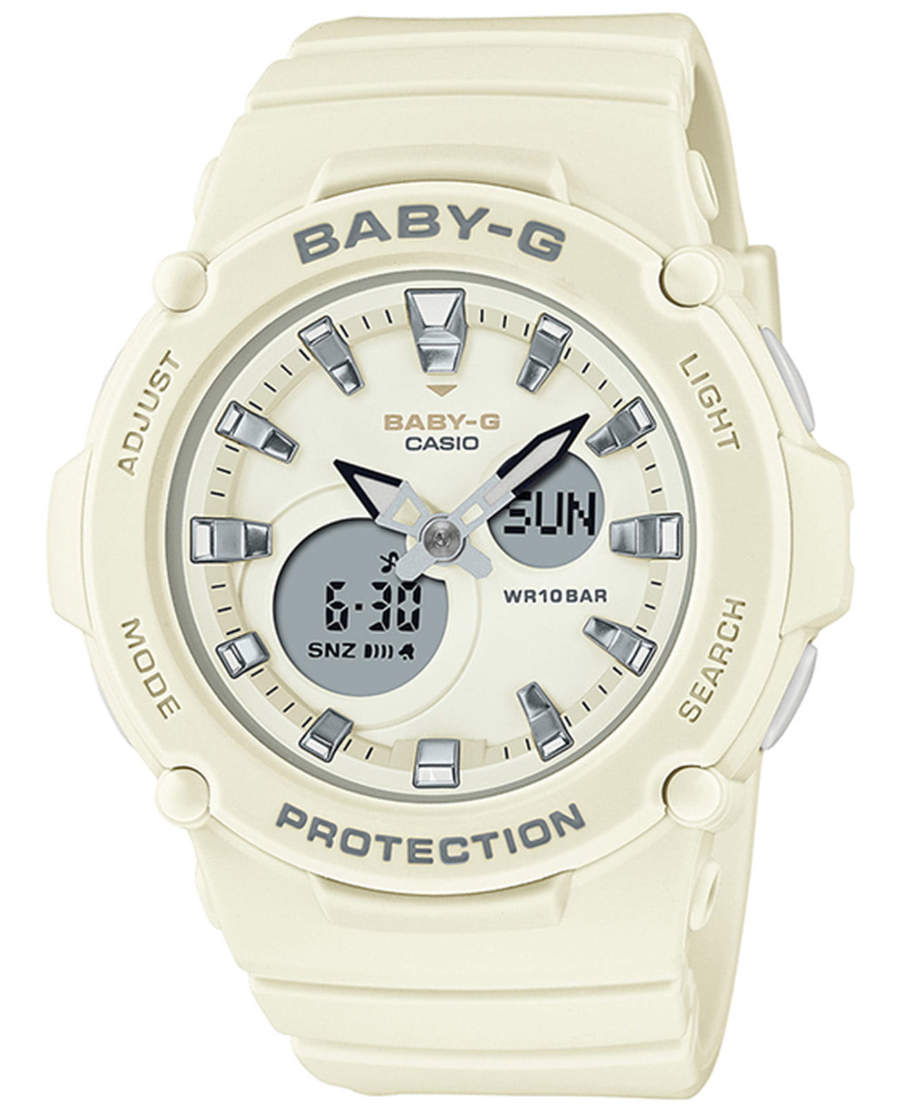 Женские японские наручные часы с противоударнымУдаропрочный корпусМеханизм заключён в корпус, выполненный из современных материалов, устойчивых к ударам, механическим повреждениям и падению с высоты: инновационный пластик, карбон, нержавеющая сталь, титан. корпусом Casio Baby-G BGA-275-7A. Функциональность данной модели: формат времени 12/24, мировое времяМировое время Полезное часовое усложнение, отображающее время в основных городах и известных областях по всему миру, оно связано с часовыми поясами, удобно для путешественников и бизнесменов. 48 городов (29 часовых поясов), вечный календарьВечный календарьКлассическое часовое усложнение, представляющее собой календарь, рассчитанный на несколько лет вперёд (стандартно – до 2099 года). Определяет текущую дату, день недели, месяц. до 2099 года, функция летнего времени, 5 независимых будильниковБудильникБуди́льник — часы, в заданный момент времени подающие звуковой, световой и/или в редких случаях другой сигнал., сигнал начала часа, секундомерСекундомерСекундоме́р — прибор, способный измерять интервалы времени с точностью до долей секунды. с точностью 1/100 секунды и измерением до 23 часов 59 минут 59,99 cек., таймер обратного отсчета (диапазон времени 24 часа), светодиодная подсветкаСветодиодная подсветкаСветодиодная или LED-подсветка обеспечивает появление яркого холодного свечения за счёт LED-элементов - маленьких лампочек. Они потребляют минимальное количество энергии, чаще всего можно встретить 1 светодиод, в нижней части циферблата. циферблата с функцией послесвечения, функция выключения звука нажатия кнопок. Стрелки покрыты необритовым (NeobriteПодсветка NeobriteИспользование светонакопительных составов на основе сульфида цинка или алюмината стронция, яркий свет можно наблюдать на протяжении 6-10 часов после «зарядки» часов около источника света.) люминесцентнымЛюминесцентное покрытиеПозволяет считывать показания времени в темноте. Производители наносят на стрелки, часовые индексы, безель или поверхность циферблата светонакопительный состав, дающий холодное свечение. напылением (светятся в темноте).