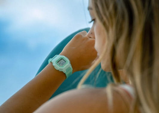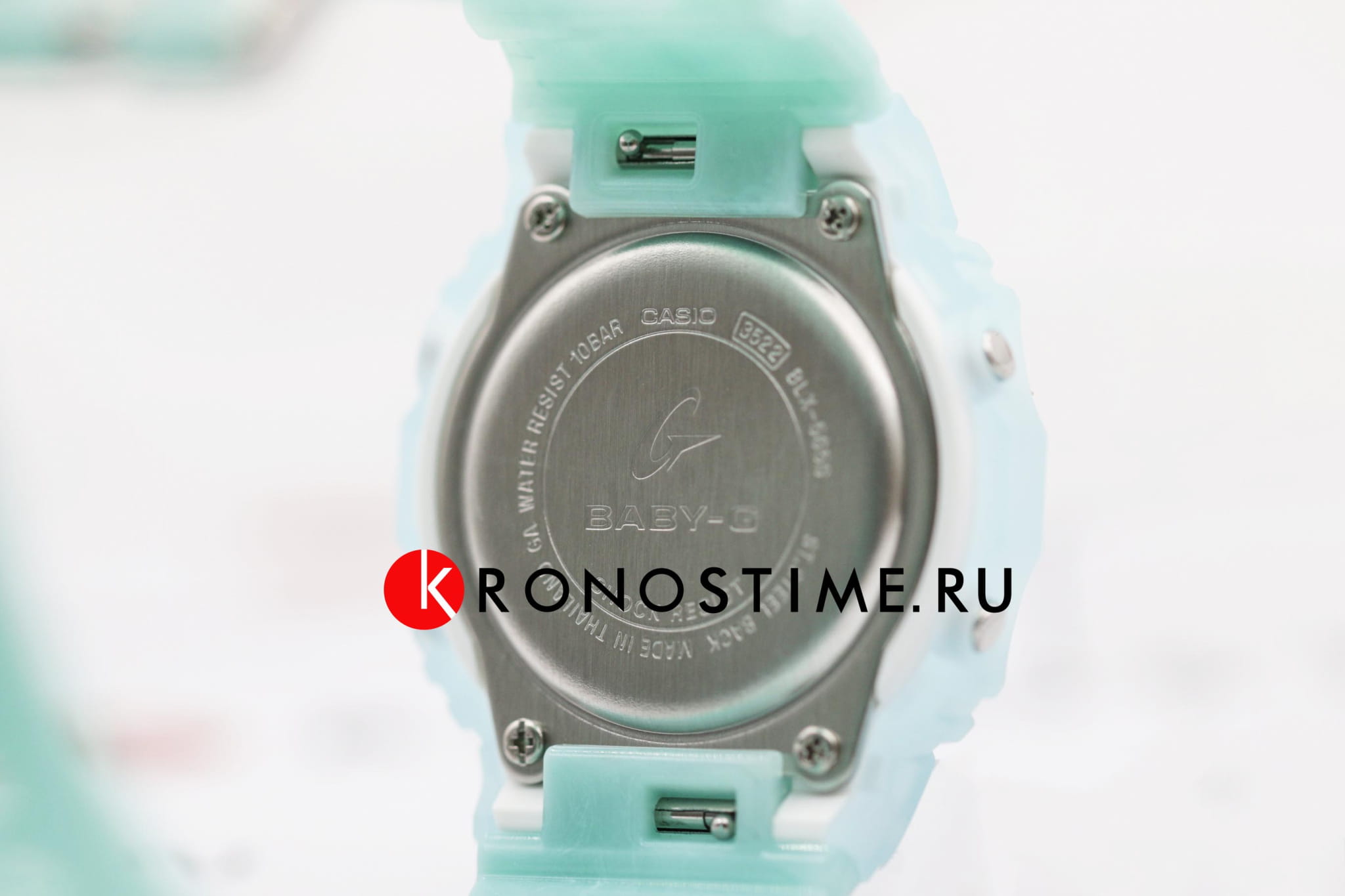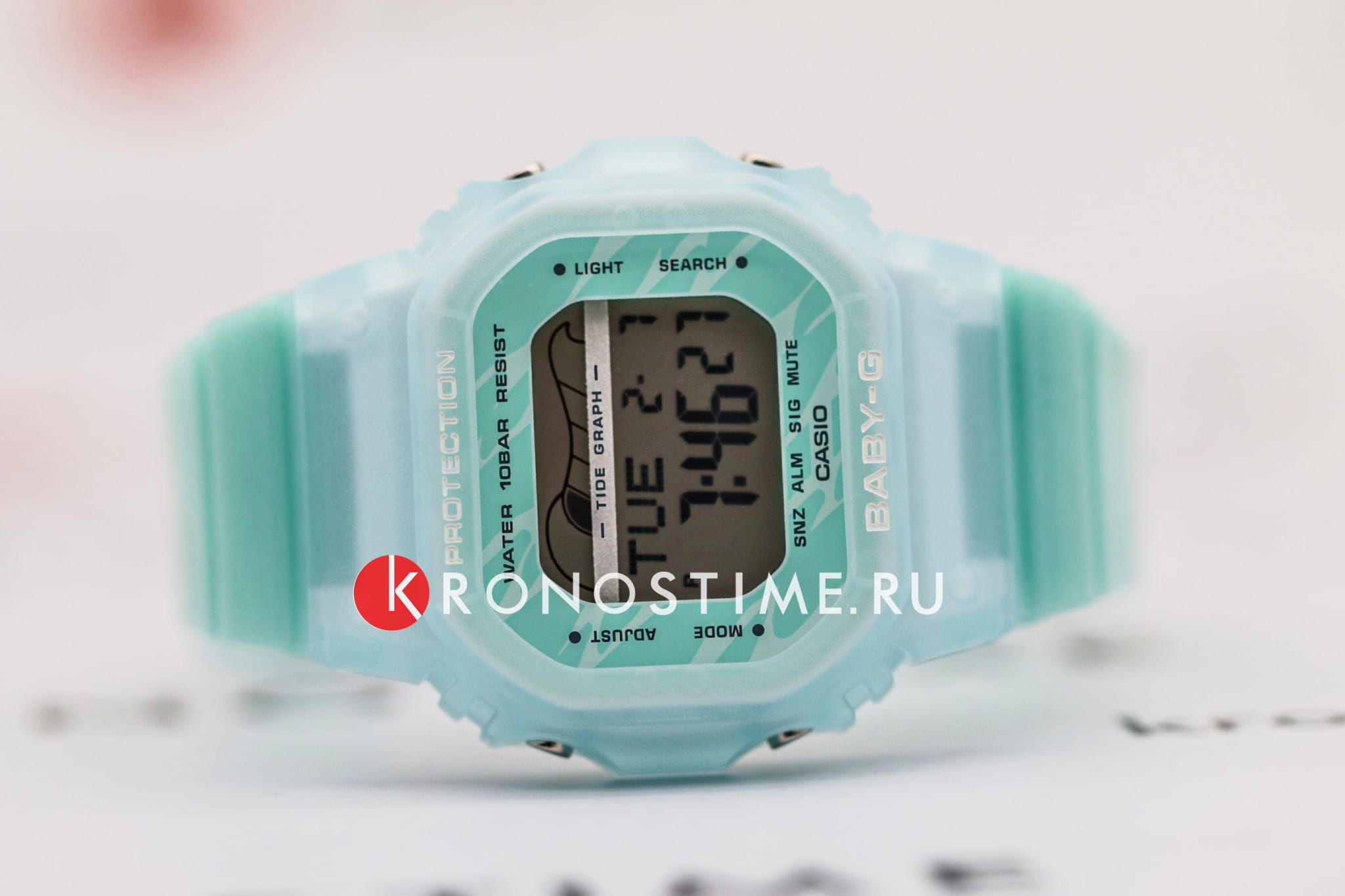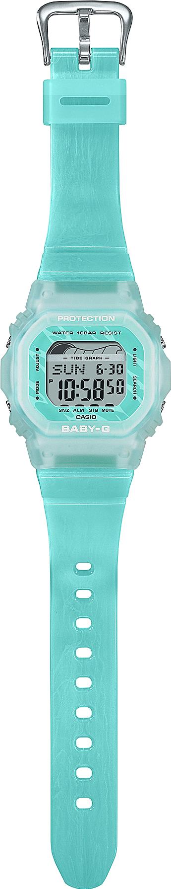 Женские противоударные японские часы с лунным календарем Casio Baby-G BLX-565S-2, кварцевый механизм с высокой точностью. Класс водозащиты: 100 метров, позволит плавать, нырять и заниматься другими водными видами спорта. Корпус часов изготовлен из пластика бирюзовацвета. Ударопрочный корпусУдаропрочный корпусМеханизм заключён в корпус, выполненный из современных материалов, устойчивых к ударам, механическим повреждениям и падению с высоты: инновационный пластик, карбон, нержавеющая сталь, титан. защищает механизм от ударов и вибрации. Светодиодная подсветкаСветодиодная подсветкаСветодиодная или LED-подсветка обеспечивает появление яркого холодного свечения за счёт LED-элементов - маленьких лампочек. Они потребляют минимальное количество энергии, чаще всего можно встретить 1 светодиод, в нижней части циферблата. освещает весь циферблат, после отпускания кнопки свечение продолжается еще некоторое время. Особенность модели в функциях будильникаБудильникБуди́льник — часы, в заданный момент времени подающие звуковой, световой и/или в редких случаях другой сигнал., секундомераСекундомерСекундоме́р — прибор, способный измерять интервалы времени с точностью до долей секунды., таймера и мирового времениМировое время Полезное часовое усложнение, отображающее время в основных городах и известных областях по всему миру, оно связано с часовыми поясами, удобно для путешественников и бизнесменов. .