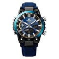 Супер редкий лимитированный релиз в коллекции Edifice 2024 года из топовой аналого-цифровой серии ECB-2000 в усиленном карбоном корпусе с глубоким синим циферблатом и деталями золотого оттенка. Модель посвящена 50-летнему юбилею часового сегмента Casio, о чем указывает гравировка на стальной задней крышке часов, а также стилистика цифр на безеле — именно такой шрифт имела самая первая цифровая модель Casio QW02, выпущенная пол века назад. Фактурное кольцо золотого цвета между безелем и циферблатом модели также унаследовано от прародителя всех часов Casio.