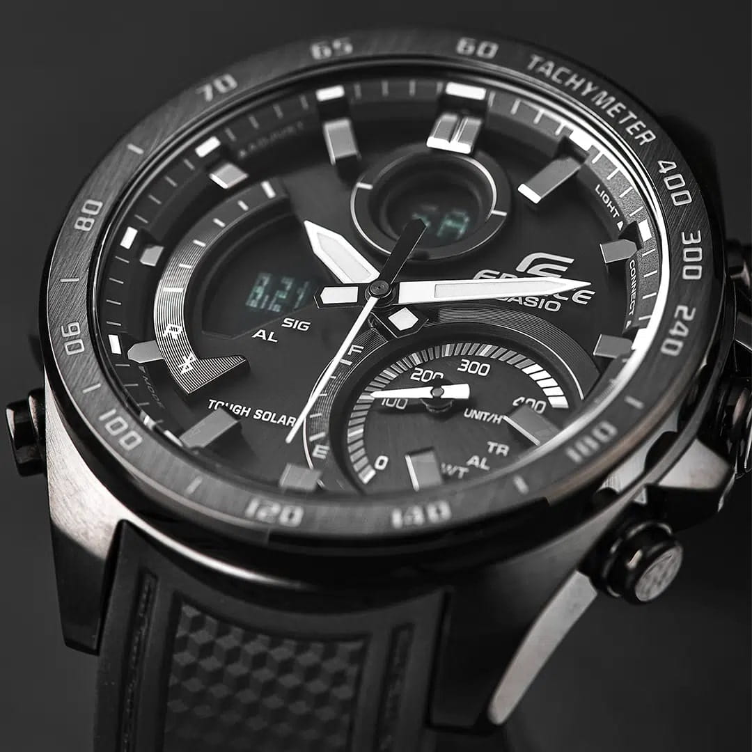 Многофункциональные мужские часы с с минеральным стекломМинеральное стеклоМинеральное стекло представляет собой искусственно выращенный минерал кварца. Такое стекло отличается особой устойчивостью к повреждениям и царапинам. Уступает по некоторым качествам сапфировому стеклу. Casio Edifice ECB-900PB-1A, кварцевый механизм с высокой точностью. Класс водозащиты: 100 метров, позволит плавать, нырять и заниматься другими водными видами спорта. Корпус часов изготовлен из стали с IP-покрытиемIP-покрытиеМетод ионного напыления. Демонстрирует повышенную устойчивость к истиранию, окислению и химическим веществам. Под воздействием высокого давления и температуры около 1500°C молекулы металла надёжно соединяются с частицами корпуса часов.. Питание от солнечной энергии Tough SolarTough SolarТехнология основана на подзарядке аккумулятора от источника солнечного света, специальная панель улавливает солнечные лучи и преобразует их в энергию для работы часов. Достаточно пары минут нахождения на солнце для функционирования часов в течении суток. - высокоэффективная солнечная батарея, аккумулятор, индикатор низкого заряда батареи. Функция автоматического сохранения энергии. Время работы аккумулятора без подзарядки приблизительно 6 месяцев, при включенной функции сохранения энергии приблизительно 19 месяцев. Двойная подсветка Super Illuminator с функцией Afterglow (для подсветки не нужно удерживать кнопку, время послесвечения настраивается 1,5 или 3 сек): одновременно подсвечивается аналоговый циферблат и цифровой дисплей. Цвет подсветки: белый. Подсветка NeobriteПодсветка NeobriteИспользование светонакопительных составов на основе сульфида цинка или алюмината стронция, яркий свет можно наблюдать на протяжении 6-10 часов после «зарядки» часов около источника света. обеспечивает длительное послесвечение в темноте даже после кратковременного нахождения на свету. Сплит-хронографСплит-хронографИспользуется для измерения продолжительности нескольких временных отрезков, начинающихся одновременно, а заканчивающихся в разное время. с тахиметромТахиметрРазмеченная шкала, располагается на ободке или безеле часов. Тахиметр позволяет рассчитать скорость на определённом участке пути, расстояние измеряется в километрах или милях.. Мировое время Мировое время Полезное часовое усложнение, отображающее время в основных городах и известных областях по всему миру, оно связано с часовыми поясами, удобно для путешественников и бизнесменов. – 39 городов (39 часовых поясов). Функция включения/отключения летнего времени. СекундомерСекундомерСекундоме́р — прибор, способный измерять интервалы времени с точностью до долей секунды. с разрешениями показаний: 1/1000 сек (до 1 ч) и 1/10 сек (после 1 ч) и временем измерения 24 ч. ТаймерТаймерОтсчитывает секунды в обратном направлении в заданном интервале времени. обратного отсчета от 1 сек до 24 ч. 12-ти и 24-х часовой формат времени. Беспроводная технология Bluetooth со сверхнизким потреблением энергии для синхронизации со смартфоном. При подключении к смартфону часы автоматически корректируют текущее время, в том числе переход на зимнее/летнее время, копируют настройки мирового времени более чем для 300 городов, оповещают при поступлении звонка на мобильный телефон. Функция поиска телефона, настройка таймера и будильника. Приложение EDIFICE Connected позвол