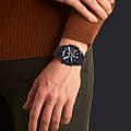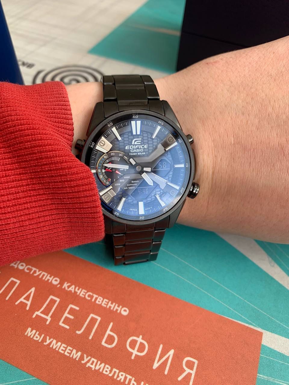 Достаточно внушительный черно-синий циферблат с оригинальным расположением счётчиков. Многофункциональная модель пригодится на любой случай жизни, ведь она оснащена Bluetooth 4.0BluetoothСовременная технология, позволяющая синхронизировать часы с телефоном и переносить данные. Часы с Bluetooth расширяют возможности вашего смартфона и делают его использование ещё более удобным., хронографомХронографФункция позволяет измерять отрезки времени с особой точностью: часы, минуты, секунды. Верным признаком хронографа является наличие на циферблате 3 дополнительных окошек-счётчиков., секундомером, тахиметромТахиметрРазмеченная шкала, располагается на ободке или безеле часов. Тахиметр позволяет рассчитать скорость на определённом участке пути, расстояние измеряется в километрах или милях., таймером, будильником, календарём, есть мировое времяМировое время Полезное часовое усложнение, отображающее время в основных городах и известных областях по всему миру, оно связано с часовыми поясами, удобно для путешественников и бизнесменов. и функция поиска телефона. Питание поступает от солнечной энергии - . Водонепроницаемость до 10 бар. Корпус, браслет, безельБезельВнешний ободок, закрепляющий стекло. В спортивных часах так называется поворотное кольцо с делениями на циферблате, выполняет роль таймера – замеряет отрезки времени на шкале. Неподвижный безель – элемент декора. Однонаправленно вращающийся безель на дайверских часах позволяет фиксировать моменты погружения и выныривания на поверхность. из нержавеющей стали. Минеральное стекло. Двойная светодиодная подсветкаСветодиодная подсветкаСветодиодная или LED-подсветка обеспечивает появление яркого холодного свечения за счёт LED-элементов - маленьких лампочек. Они потребляют минимальное количество энергии, чаще всего можно встретить 1 светодиод, в нижней части циферблата.. Габариты: 50 x 46 x 9,8 мм.