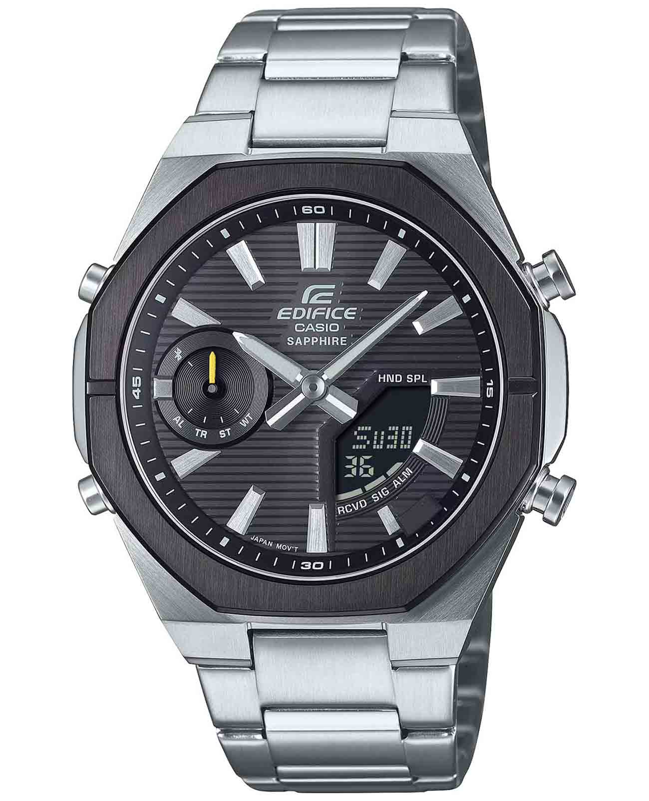 Японские мужские наручные часы Casio Edifice ECB-S10DB-1A — это высокотехнологичный аксессуар для тех, кто ценит точность, стиль и современные инновации. Модель из коллекции Edifice , оснащённая технологией Bluetooth®, объединяет в себе классический дизайн и цифровые функции, делая каждое использование по-настоящему удобным. Корпус диаметром 43 мм выполнен из прочной нержавеющей стали , что придаёт модели благородства и долговечности. Циферблат синего цвета изготовлен по технологии Sunray (солнечные лучи) , обеспечивая глубину и игру света. Защиту механизму обеспечивает сапфировое стеклоСапфировое стеклоПрочный и надёжный материал из кристалла сапфира синтетического происхождения, характеризующийся особой твёрдостью и устойчивостью к царапинам и повреждениям., устойчивое к царапинам и с антибликовым покрытием для лучшей читаемости. БезельБезельВнешний ободок, закрепляющий стекло. В спортивных часах так называется поворотное кольцо с делениями на циферблате, выполняет роль таймера – замеряет отрезки времени на шкале. Неподвижный безель – элемент декора. Однонаправленно вращающийся безель на дайверских часах позволяет фиксировать моменты погружения и выныривания на поверхность. с IP-покрытиемIP-покрытиеМетод ионного напыления. Демонстрирует повышенную устойчивость к истиранию, окислению и химическим веществам. Под воздействием высокого давления и температуры около 1500°C молекулы металла надёжно соединяются с частицами корпуса часов.. Часы работают на кварцевом механизме с поддержкой BluetoothBluetoothСовременная технология, позволяющая синхронизировать часы с телефоном и переносить данные. Часы с Bluetooth расширяют возможности вашего смартфона и делают его использование ещё более удобным. , что позволяет синхронизировать их со смартфоном через специальное приложение CASIO WATCHES . Это даёт возможность автоматически корректировать время, устанавливать будильники, отслеживать дни недели на 6 языках , включая русский, а также выбирать время в до 300 городов мира . Также реализована функция перемещения стрелок , которая открывает обзор цифровых окон, и функция поиска телефона. Модель предлагает широкий набор функций: — Секундомер с точностью 1/100 секунды и временем измерения до 24 часов ; — SPLIT-хронографСплит-хронографИспользуется для измерения продолжительности нескольких временных отрезков, начинающихся одновременно, а заканчивающихся в разное время.; — ТаймерТаймерОтсчитывает секунды в обратном направлении в заданном интервале времени. обратного отсчёта от 1 секунды до 24 часов ; — 5 независимых будильников и ежечасный сигнал ; — отображение времени в формате 12/24 часа ; — автоматический календарь с возможностью отображения дня недели до 2099 года; — включение/выключение звука кнопок и авиарежим . Для комфортного использования в темное время стрелки покрыты люминесцентным составом NeobriteПодсветка NeobriteИспользование светонакопительных составов на основе сульфида цинка или алюмината стронция, яркий свет можно наблюдать на протяжении 6-10 часов после «зарядки» часов около источника света., который заряжается на свету и долго светится в темноте. Часы также имеют двойную светодиодную подсветку циферблата , с регулировкой длительности свечения (1.5 или 3 секунды), что делает их особенно удобными в условиях слабого освещения. Часы обладают водозащитой 