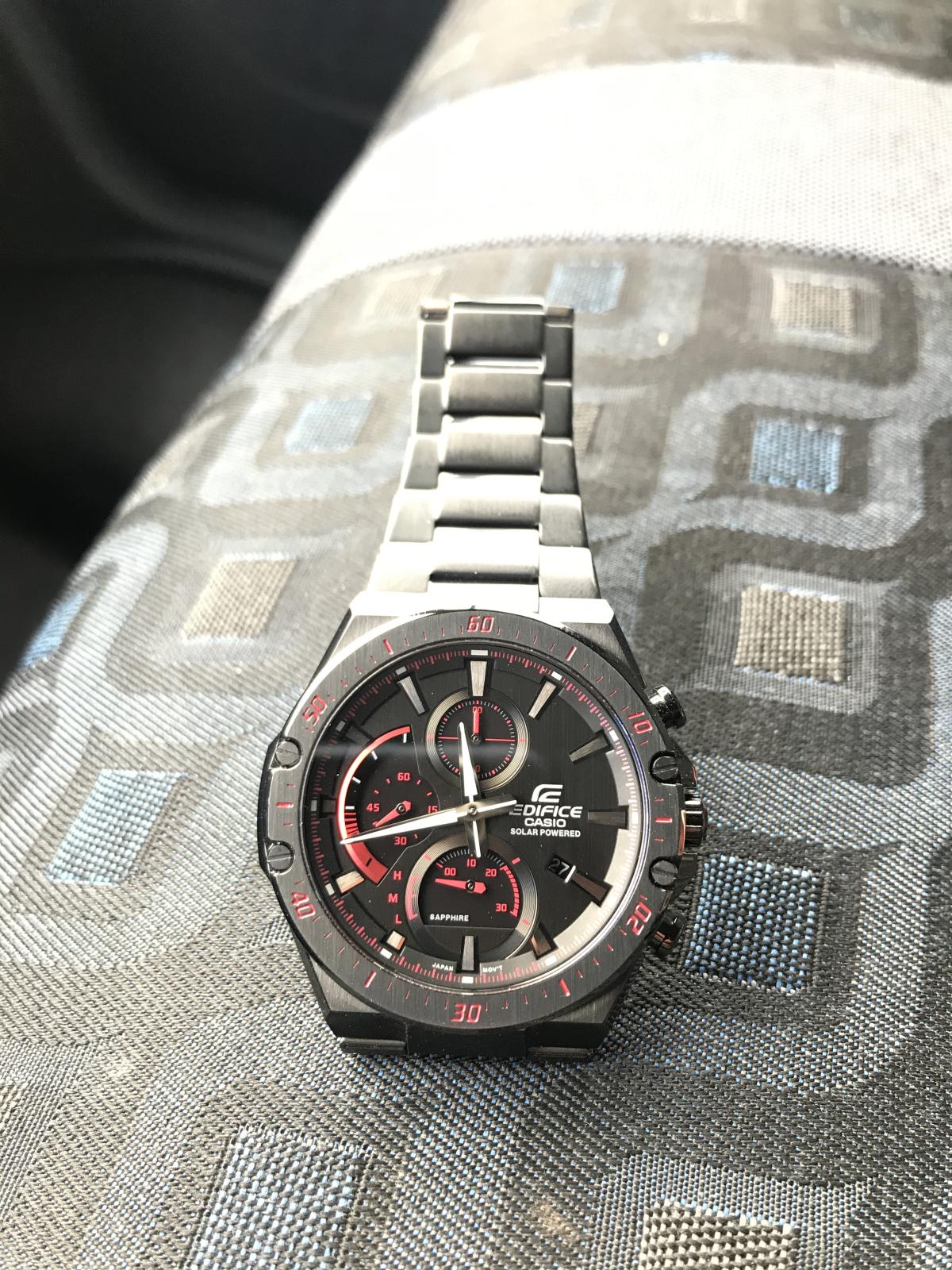 Наручные часы в чёрном исполнении привлекают красными деталями и лаконичным оформлением. Помогут идеально дополнить образ на каждый день. Аксессуар стал обладателем ультратонкого корпуса, по сравнению с большинством представителей Edifice – 9,9 мм. Модель изготовлена из стали 316L с ионным IP-покрытиемIP-покрытиеМетод ионного напыления. Демонстрирует повышенную устойчивость к истиранию, окислению и химическим веществам. Под воздействием высокого давления и температуры около 1500°C молекулы металла надёжно соединяются с частицами корпуса часов., материал устойчив к коррозии и механическим воздействиям. Японский кварцевый механизм обеспечивает питанием солнечная батарейка . Указатель минутной стрелки хронографаХронографФункция позволяет измерять отрезки времени с особой точностью: часы, минуты, секунды. Верным признаком хронографа является наличие на циферблате 3 дополнительных окошек-счётчиков. на секторной части циферблата. Сапфировое стекло с антибликовым покрытием. Водостойкость 100 метров. Люминесцентная подсветкаЛюминесцентное покрытиеПозволяет считывать показания времени в темноте. Производители наносят на стрелки, часовые индексы, безель или поверхность циферблата светонакопительный состав, дающий холодное свечение.. Застёжка с системой блокировки. Секундомер, отображение числа. Габариты: 50,2 x 45,4 x 9,9 мм.