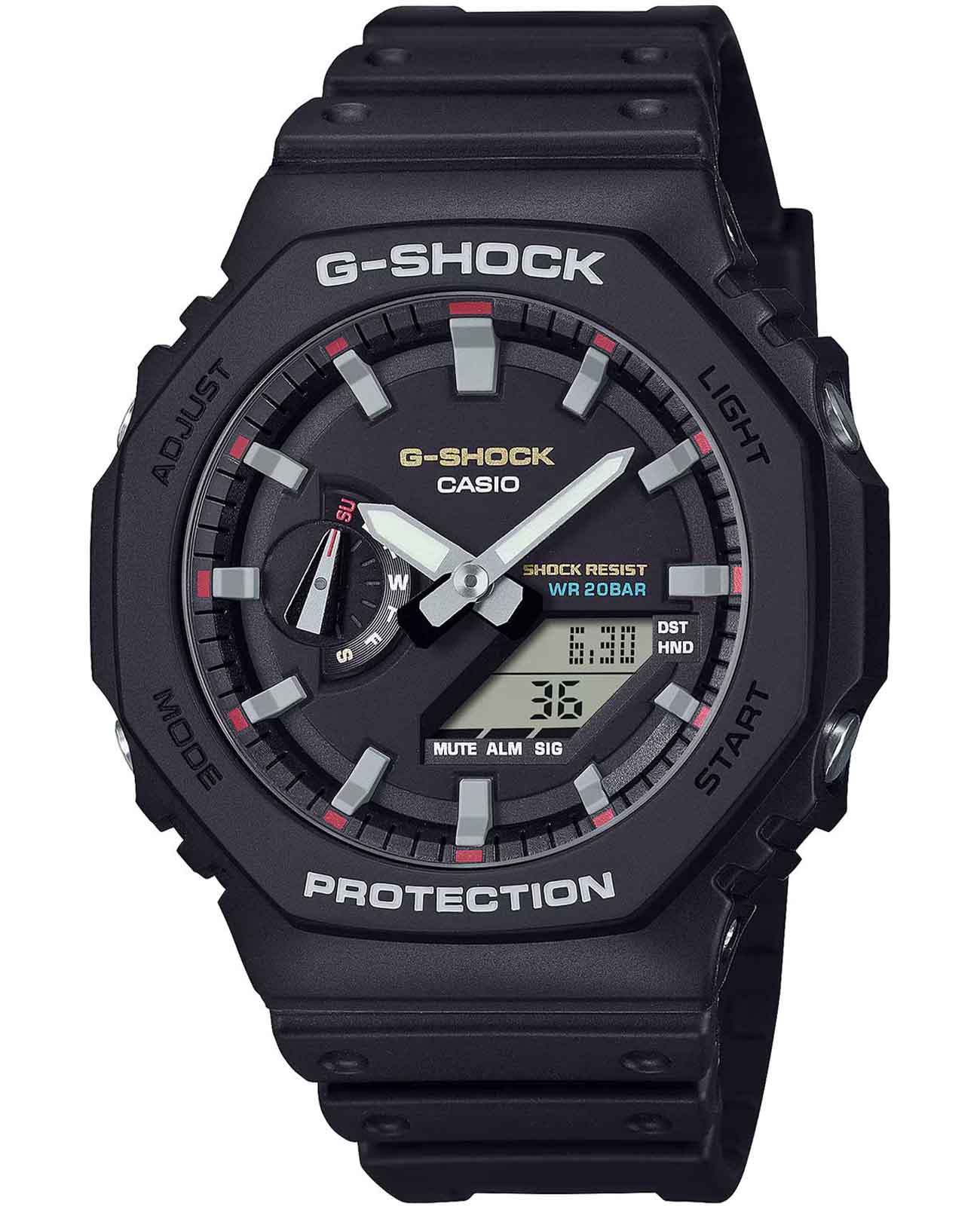Японские мужские противоударныеУдаропрочный корпусМеханизм заключён в корпус, выполненный из современных материалов, устойчивых к ударам, механическим повреждениям и падению с высоты: инновационный пластик, карбон, нержавеющая сталь, титан. часы Casio G-Shock GA-2100RL-1A с функциональной начинкой прекрасно подойдут для любителей активного образа жизни. Противоударный пластиковый корпус с карбоновыми волокнами более прочный и, в то же время, более легкий. Этот же материал защищает внутренний модуль от повреждений и деформаций при ударах. Минеральное стеклоМинеральное стеклоМинеральное стекло представляет собой искусственно выращенный минерал кварца. Такое стекло отличается особой устойчивостью к повреждениям и царапинам. Уступает по некоторым качествам сапфировому стеклу. устойчивое к мелким механическим повреждениям. Полностью автоматическая светодиодная подсветкаСветодиодная подсветкаСветодиодная или LED-подсветка обеспечивает появление яркого холодного свечения за счёт LED-элементов - маленьких лампочек. Они потребляют минимальное количество энергии, чаще всего можно встретить 1 светодиод, в нижней части циферблата., выбираемая продолжительность подсветки (2 секунды или 4 секунды), послесвечение. 12-ти и 24-х часовой формат времени. СекундомерСекундомерСекундоме́р — прибор, способный измерять интервалы времени с точностью до долей секунды. с двумя точностями показаний: 1/100с (до 1ч) и 1с (после 1ч) и временем измерения 24ч. ТаймерТаймерОтсчитывает секунды в обратном направлении в заданном интервале времени. обратного отсчета от 1c до 24ч с автоповтором. Мировое время Мировое время Полезное часовое усложнение, отображающее время в основных городах и известных областях по всему миру, оно связано с часовыми поясами, удобно для путешественников и бизнесменов. – 31 часовой пояс (48 городов + всемирное координированное время (UTCUTCВсемирное кординационное время, не имеющее привязки к географическому положению Гринвича, основывается на атомном отсчёте времени. Регулировка времени осуществляется более точно, чем устаревшее GMT.