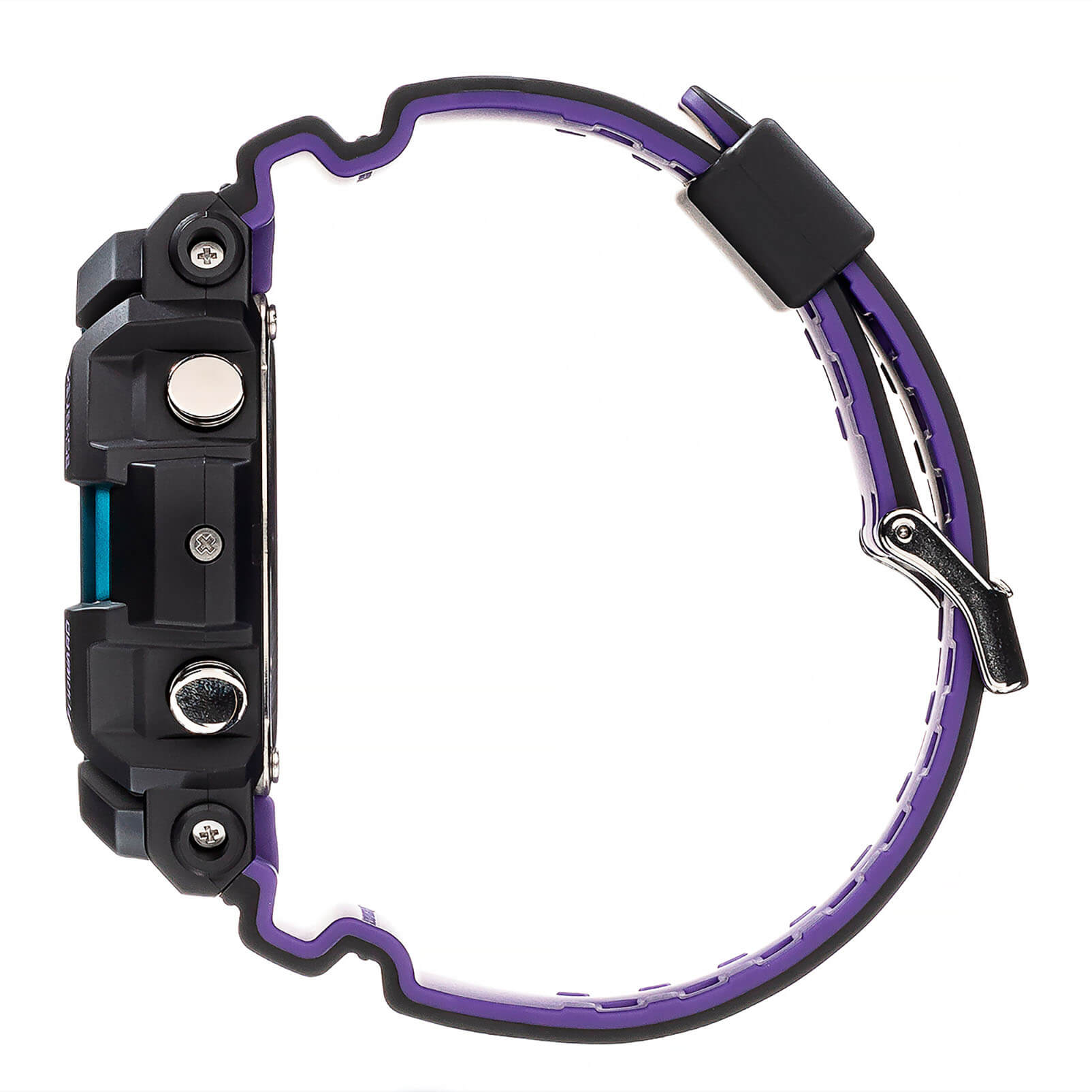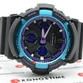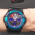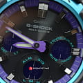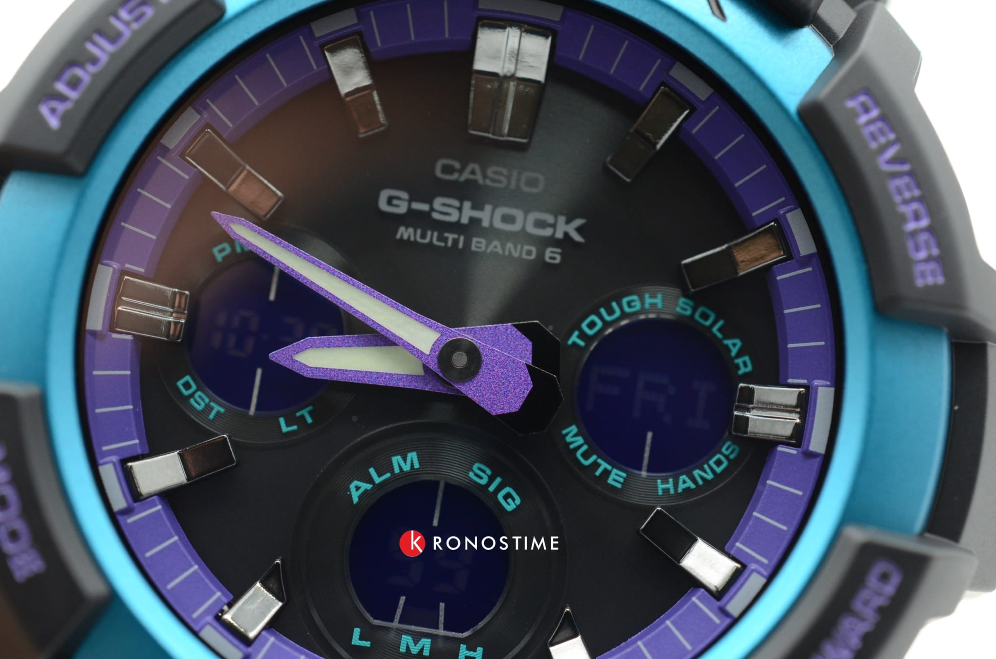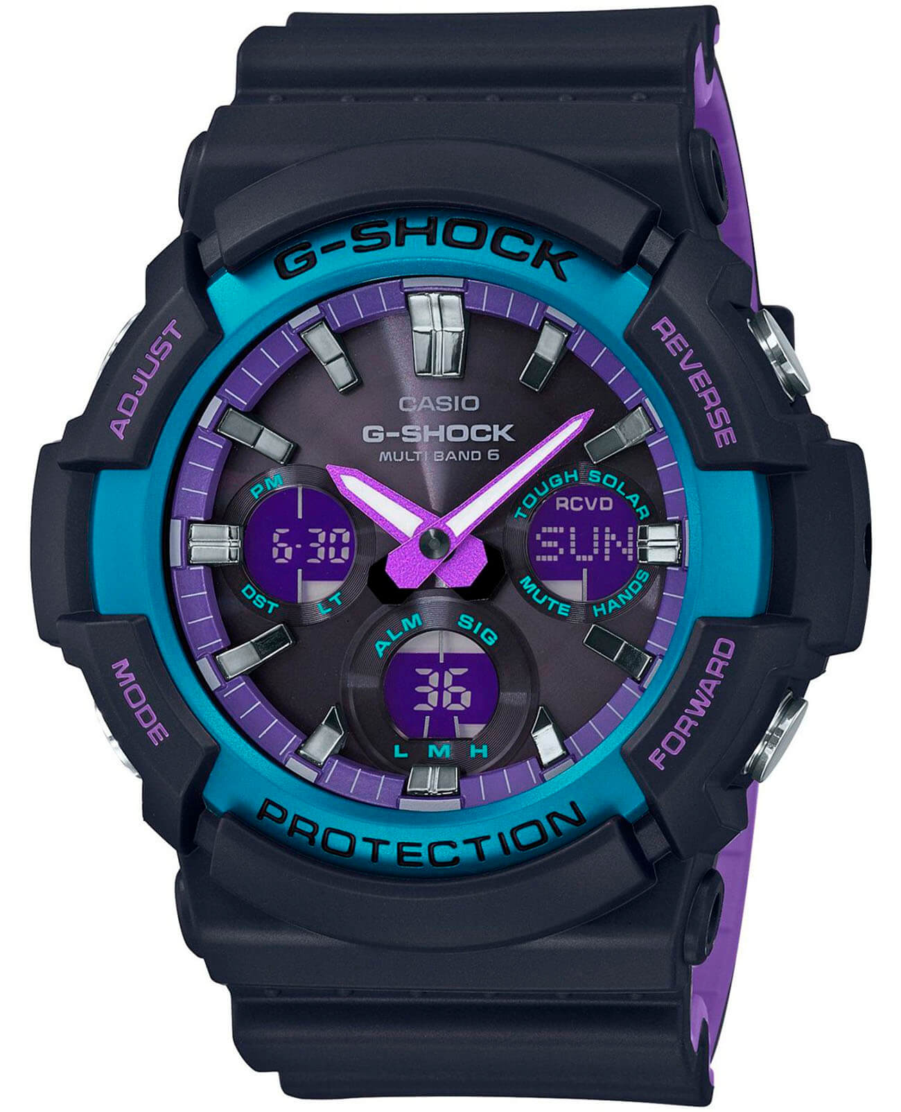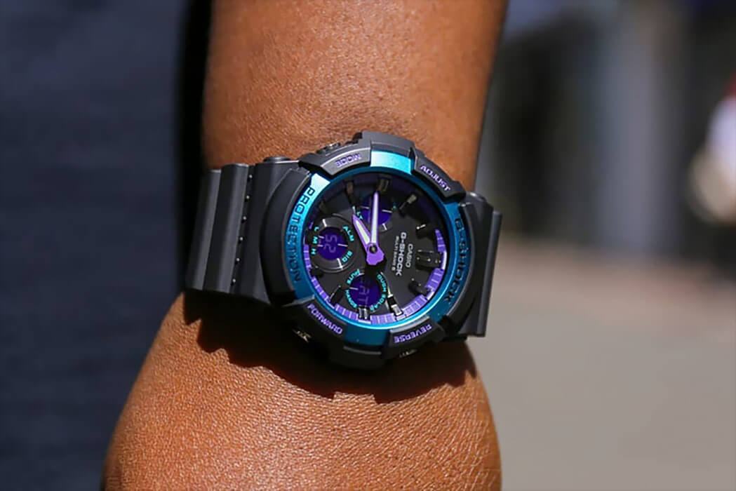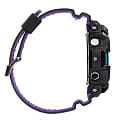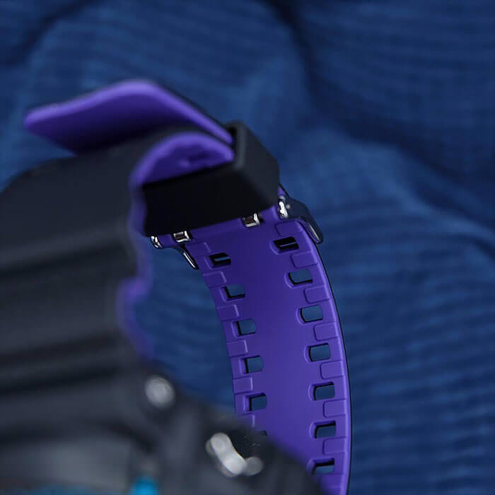Основным цветом стал чёрный, на тёмном фоне отлично смотрятся фиолетовые и голубые детали. При создании модели дизайнеры вдохновлялись атмосферой ночных клубов, где часто проводят время молодые люди. Аксессуар имеет противоударный корпусУдаропрочный корпусМеханизм заключён в корпус, выполненный из современных материалов, устойчивых к ударам, механическим повреждениям и падению с высоты: инновационный пластик, карбон, нержавеющая сталь, титан., устойчивый к ударам и вибрации. Он надёжно защищает японский кварцевый механизм с точностью хода -/+ 15 секунд в месяц. БезельБезельВнешний ободок, закрепляющий стекло. В спортивных часах так называется поворотное кольцо с делениями на циферблате, выполняет роль таймера – замеряет отрезки времени на шкале. Неподвижный безель – элемент декора. Однонаправленно вращающийся безель на дайверских часах позволяет фиксировать моменты погружения и выныривания на поверхность. с цветным IP-покрытиемIP-покрытиеМетод ионного напыления. Демонстрирует повышенную устойчивость к истиранию, окислению и химическим веществам. Под воздействием высокого давления и температуры около 1500°C молекулы металла надёжно соединяются с частицами корпуса часов.. Прочное минеральное стекло. Технология . Автоматическая светодиодная подсветкаСветодиодная подсветкаСветодиодная или LED-подсветка обеспечивает появление яркого холодного свечения за счёт LED-элементов - маленьких лампочек. Они потребляют минимальное количество энергии, чаще всего можно встретить 1 светодиод, в нижней части циферблата., стрелки с люминесцентным покрытиемЛюминесцентное покрытиеПозволяет считывать показания времени в темноте. Производители наносят на стрелки, часовые индексы, безель или поверхность циферблата светонакопительный состав, дающий холодное свечение.. Минеральное стекло. Водозащита до 200 метров. Браслет из полимерного материала. Функция перемещения стрелок для лёгкого доступа к показаниям с цифровых мини-дисплеев. ХронографХронографФункция позволяет измерять отрезки времени с особой точностью: часы, минуты, секунды. Верным признаком хронографа является наличие на циферблате 3 дополнительных окошек-счётчиков., таймер обратного отсчёта, мировое времяМировое время Полезное часовое усложнение, отображающее время в основных городах и известных областях по всему миру, оно связано с часовыми поясами, удобно для путешественников и бизнесменов. , будильник, приём радиосигнала для калибровки времени, календарь, секундомер. Габариты: 55,1 x 52,5 x 16,7 мм.