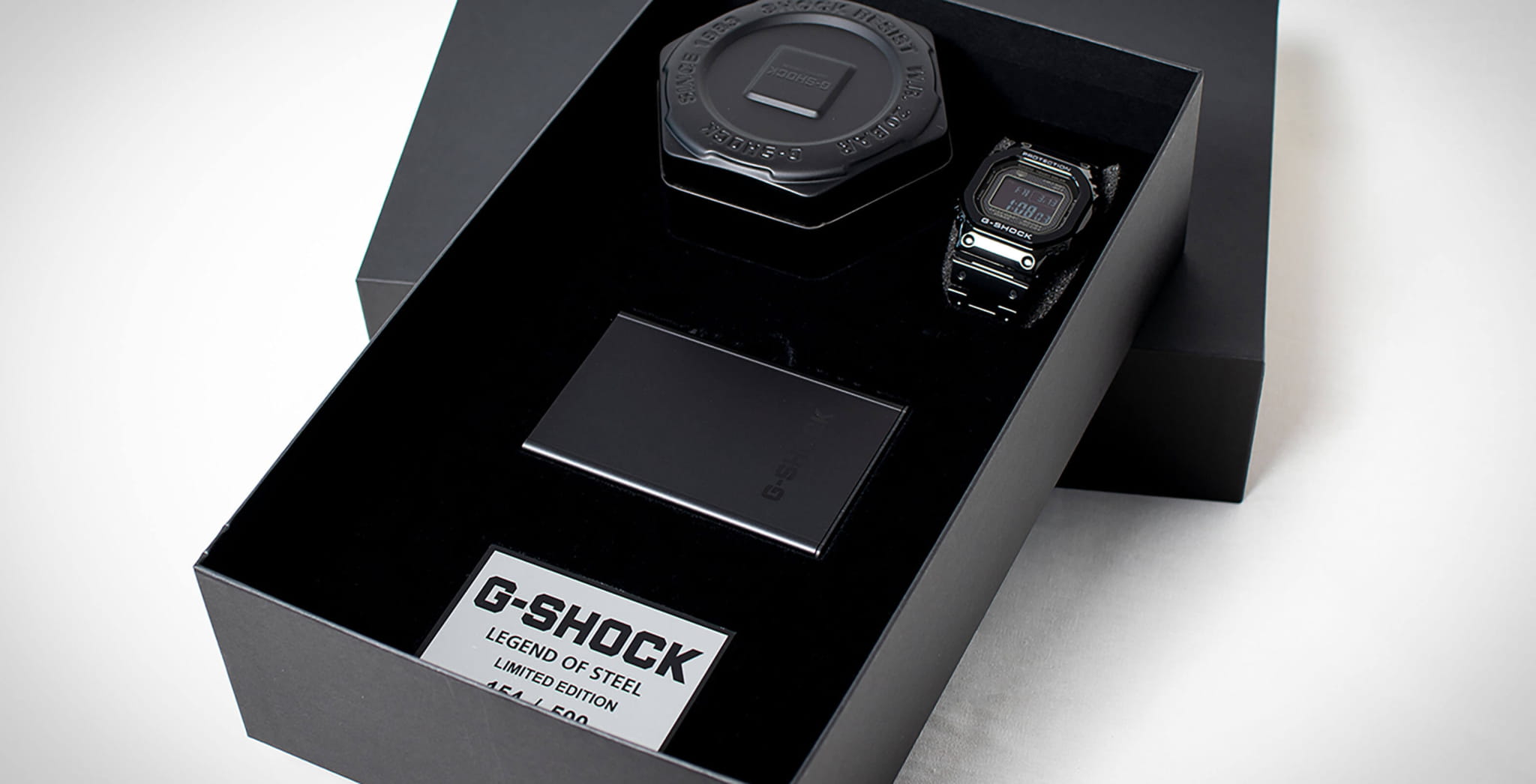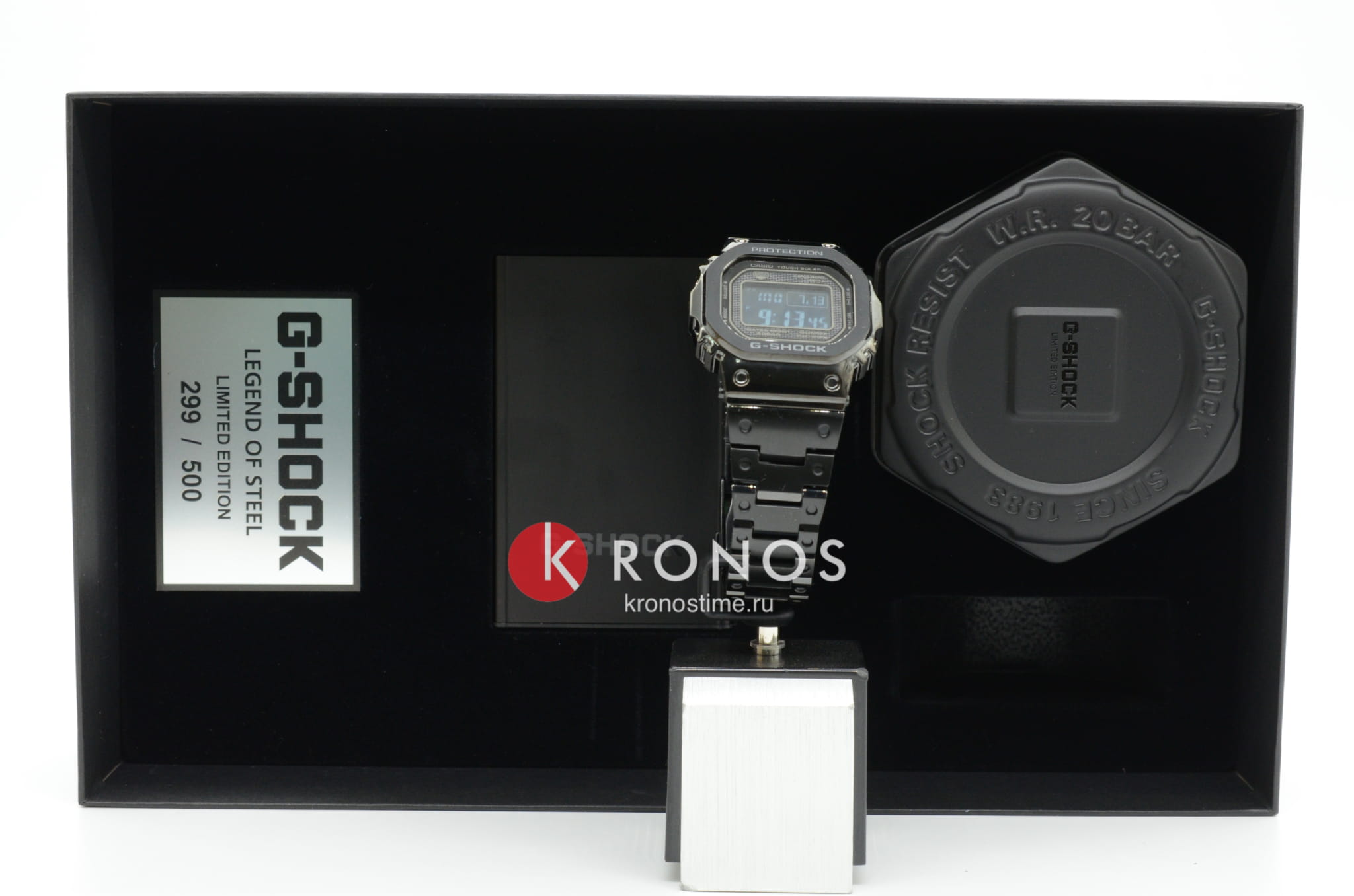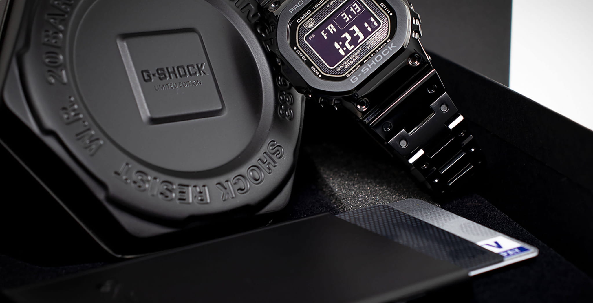 Олдскульная модель Limited Edition комплектуется набором сопутствующих предметов. В матовый черный кейс вложен лимитированный кардхолдер с логотипом Casio G-Shock. Он разрабатывался совместно с немецкой компанией Tru Virtu, производящей аксессуары, защищающие личные данные владельца электронных и пластиковых карт. Металл препятствует снятию данных сторонними устройствами, устойчив к размагничиванию, деформации, воздействию песка и жидкости. Каждый экземпляр сопровождается номерным удостоверением, выполненным в виде металлической карточки. Противоударный корпусУдаропрочный корпусМеханизм заключён в корпус, выполненный из современных материалов, устойчивых к ударам, механическим повреждениям и падению с высоты: инновационный пластик, карбон, нержавеющая сталь, титан. защищает японский кварцевый механизм, слой материала Alpha Gel® обеспечивает дополнительное усиление конструкции. Энергия для работы образуется за счёт источников света – технология . STN-дисплей отличается высокой контрастностью и расширенным углом обзора. Усложнения: светодиодная подсветкаСветодиодная подсветкаСветодиодная или LED-подсветка обеспечивает появление яркого холодного свечения за счёт LED-элементов - маленьких лампочек. Они потребляют минимальное количество энергии, чаще всего можно встретить 1 светодиод, в нижней части циферблата. Super Illuminator, таймер, хронографХронографФункция позволяет измерять отрезки времени с особой точностью: часы, минуты, секунды. Верным признаком хронографа является наличие на циферблате 3 дополнительных окошек-счётчиков., секундомер, мировое времяМировое время Полезное часовое усложнение, отображающее время в основных городах и известных областях по всему миру, оно связано с часовыми поясами, удобно для путешественников и бизнесменов. , синхронизация BluetoothBluetoothСовременная технология, позволяющая синхронизировать часы с телефоном и переносить данные. Часы с Bluetooth расширяют возможности вашего смартфона и делают его использование ещё более удобным., календарь. Габариты: 43,2 x 49,3 x 13 мм.