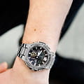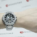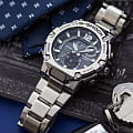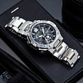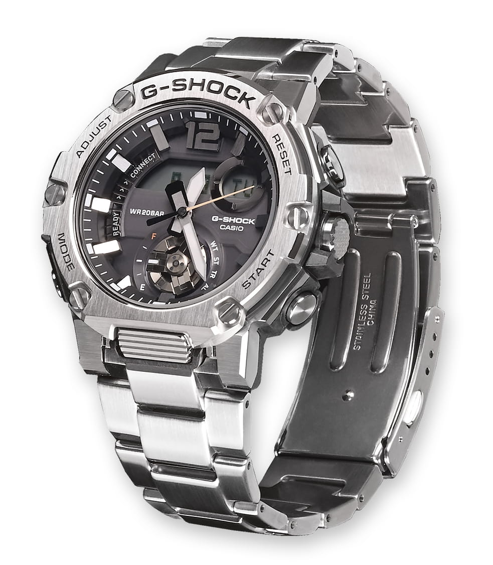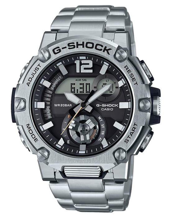 Корпус имеет структуру Carbon Core GuardCarbon Core Guard Новейшая структура корпуса, разработанная Casio. Полиуретановая пластина дополнительно усилена карбоновыми вставками, что придаёт специальную защиту от механических повреждений. Карбон отличается лёгкостью и прочностью., что говорит о повышенной ударопрочности. БезельБезельВнешний ободок, закрепляющий стекло. В спортивных часах так называется поворотное кольцо с делениями на циферблате, выполняет роль таймера – замеряет отрезки времени на шкале. Неподвижный безель – элемент декора. Однонаправленно вращающийся безель на дайверских часах позволяет фиксировать моменты погружения и выныривания на поверхность. и браслет изготовлены из стали 316L. Японский кварцевый механизм отличается высокой точностью хода 15 +/- секунд в месяц. Часы оснащены инновационной технологией , синхронизация со смартфоном происходит с помощью BluetoothBluetoothСовременная технология, позволяющая синхронизировать часы с телефоном и переносить данные. Часы с Bluetooth расширяют возможности вашего смартфона и делают его использование ещё более удобным.. Возможности: двойная автоматическая подсветка, мировое времяМировое время Полезное часовое усложнение, отображающее время в основных городах и известных областях по всему миру, оно связано с часовыми поясами, удобно для путешественников и бизнесменов. , будильник, хронографХронографФункция позволяет измерять отрезки времени с особой точностью: часы, минуты, секунды. Верным признаком хронографа является наличие на циферблате 3 дополнительных окошек-счётчиков., календарь, таймер.