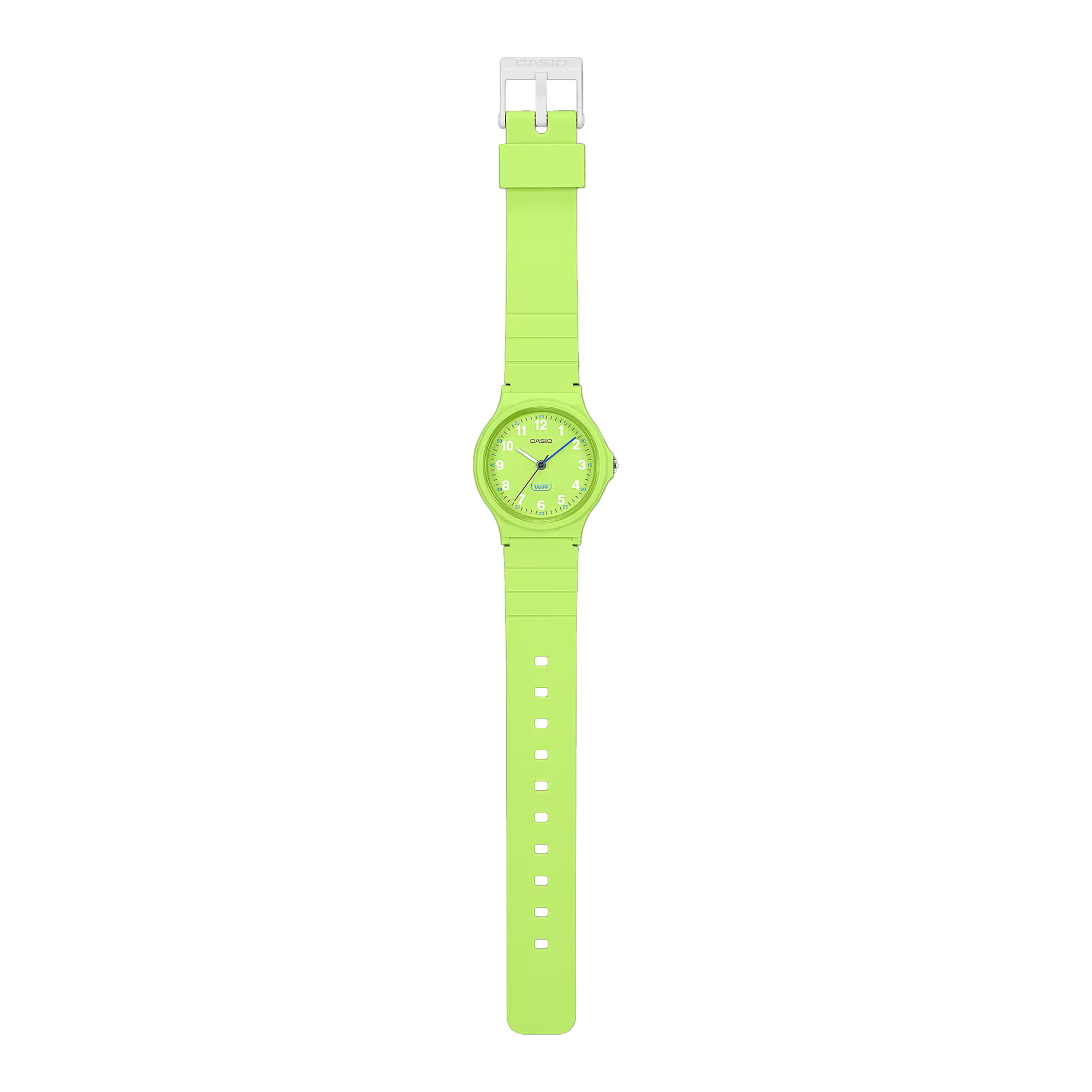 Комфортные наручные часы от Casio выполнены из высокопрочных полимерных материалов. На зеленом циферблате традиционной формы расположены отчетливые арабские цифры. Тип механизма - кварцевый. Срок службы батарейки составляет 3 года. Благодаря небольшому весу в 17 грамм, аксессуар не будет создавать ощущения тяжести на руке.