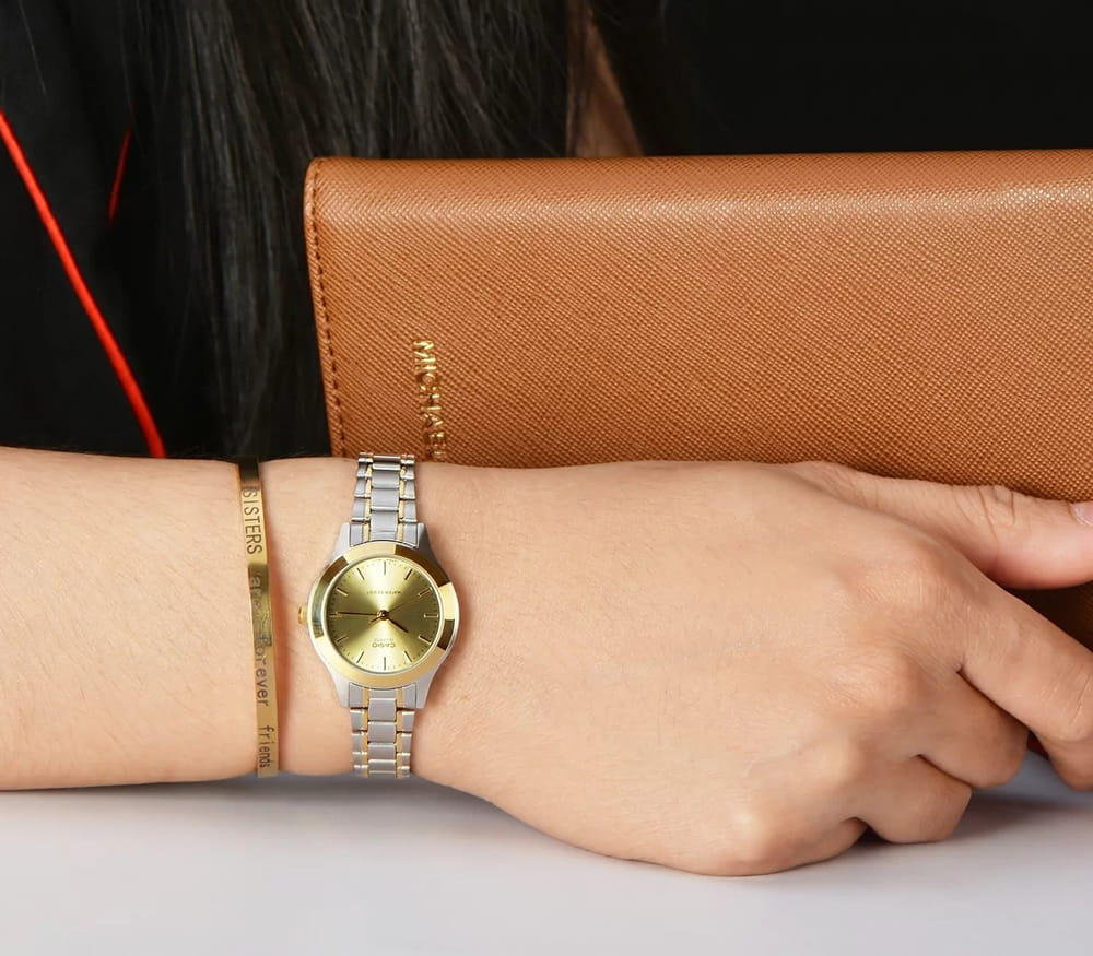 Японские кварцевые женские часы из коллекции LTP с минеральным стекломМинеральное стеклоМинеральное стекло представляет собой искусственно выращенный минерал кварца. Такое стекло отличается особой устойчивостью к повреждениям и царапинам. Уступает по некоторым качествам сапфировому стеклу. Casio Collection LTP-1128G-9A изящно смотрятся на запястье, они привлекают классическим исполнением и правильной геометрией. Минималистичная модель станет отличным решением для любого случая: на работу, переговоры с деловыми партнёрами, прогулку с друзьями или праздничный вечер. Отсутствуют лишние детали, что позволяет часам быть актуальными на долгие годы. Корпус и браслет выполнен из нержавеющей стали с частичным IP-покрытиемIP-покрытиеМетод ионного напыления. Демонстрирует повышенную устойчивость к истиранию, окислению и химическим веществам. Под воздействием высокого давления и температуры около 1500°C молекулы металла надёжно соединяются с частицами корпуса часов.. Стальной браслет на раскладной застёжкеРаскладная застёжкаТакой тип застёжки используется только на браслетах из металла. Она никогда не раскрывается полностью, происходит разделение на 2 и более частей. Раскладывающая застёжка снизит вероятность потери часов к минимуму.. Циферблат с метками в виде штрихов выполнен по технологии Sunray (солнечные лучи)