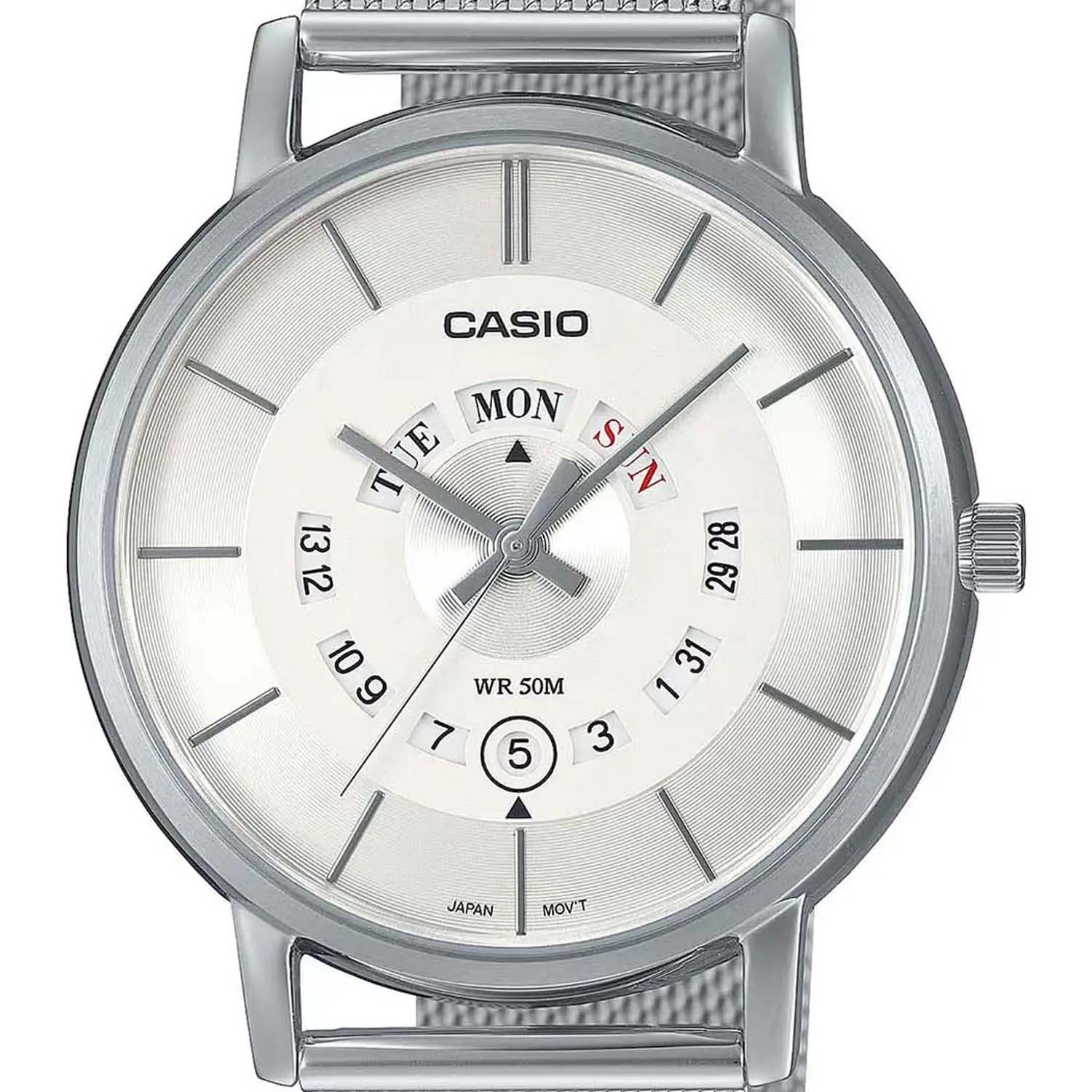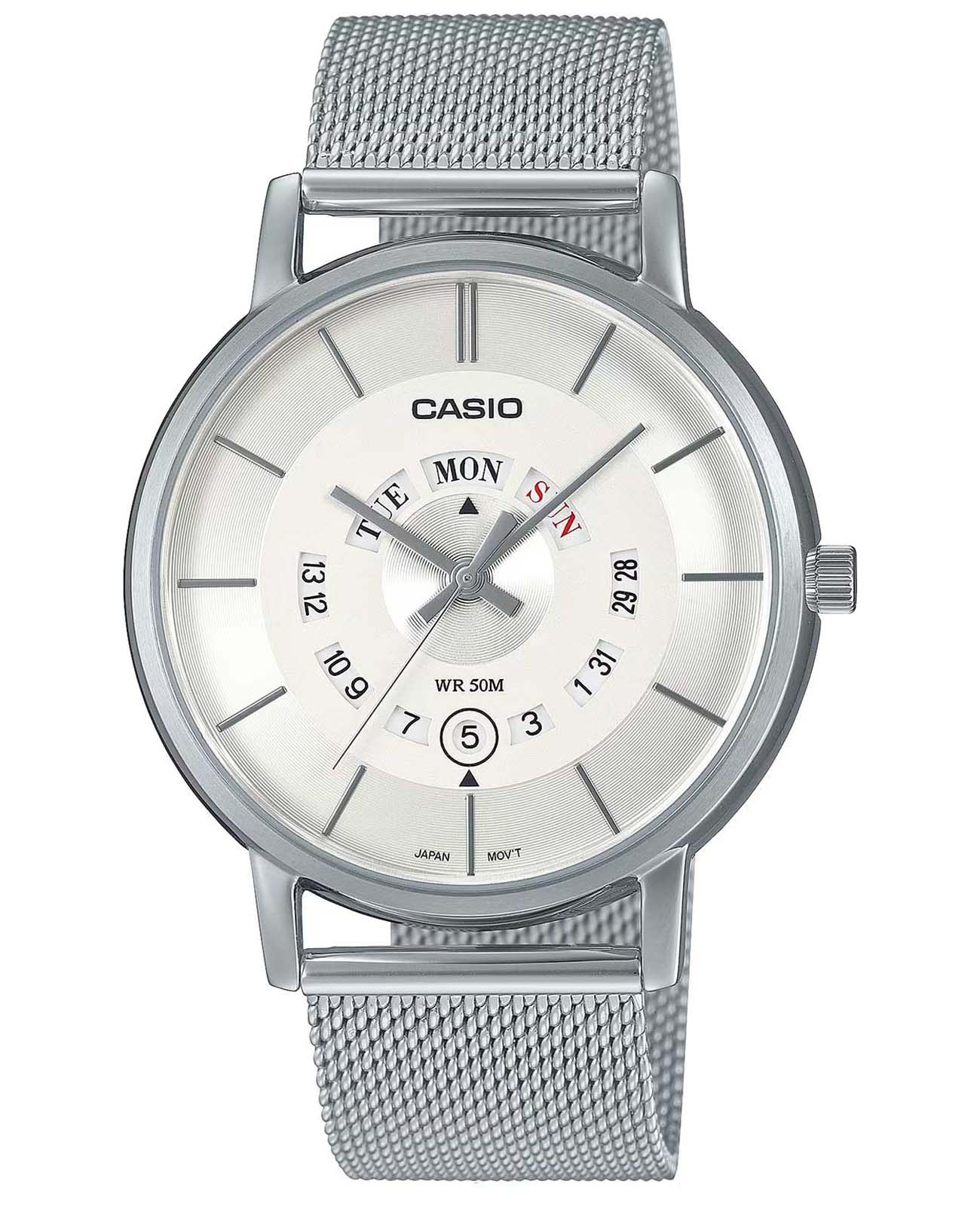 Японские мужские часы Casio Collection MTP-B135M-7A с минеральным стекломМинеральное стеклоМинеральное стекло представляет собой искусственно выращенный минерал кварца. Такое стекло отличается особой устойчивостью к повреждениям и царапинам. Уступает по некоторым качествам сапфировому стеклу. изящно смотрятся на запястье, они привлекают классическим исполнением и правильной геометрией. Минималистичная модель станет отличным решением для любого случая: на работу, переговоры с деловыми партнёрами, прогулку с друзьями или праздничный вечер. Отсутствуют лишние детали, что позволяет часам быть актуальными на долгие годы. Корпус и браслет выполнены из нержавеющей стали. Модель комплектуется надёжным механизмом, точность хода которого составляет +/- 20 сек/мес. Раскладная застёжкаРаскладная застёжкаТакой тип застёжки используется только на браслетах из металла. Она никогда не раскрывается полностью, происходит разделение на 2 и более частей. Раскладывающая застёжка снизит вероятность потери часов к минимуму.