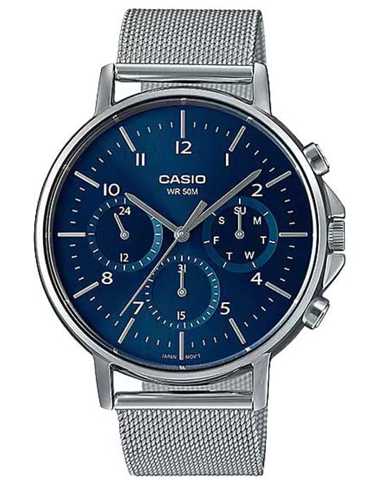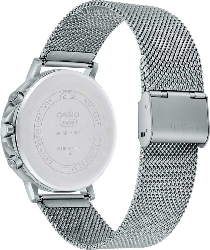 Японские мужские часы с минеральным стекломМинеральное стеклоМинеральное стекло представляет собой искусственно выращенный минерал кварца. Такое стекло отличается особой устойчивостью к повреждениям и царапинам. Уступает по некоторым качествам сапфировому стеклу. Casio Collection MTP-E321M-2A с элегантным дизайном будут прекрасно смотреться на запястье стильного мужчины. 12-ти и 24-х часовой формат времени, число и день недели вынесены на отдельные циферблаты. Метки в виде штрихов и арабских цифр. Заводная головка с защитой. Браслет с раскладной застёжкойРаскладная застёжкаТакой тип застёжки используется только на браслетах из металла. Она никогда не раскрывается полностью, происходит разделение на 2 и более частей. Раскладывающая застёжка снизит вероятность потери часов к минимуму.. Батарея рассчитана на 3 года. Ремешок с классической застежкой.