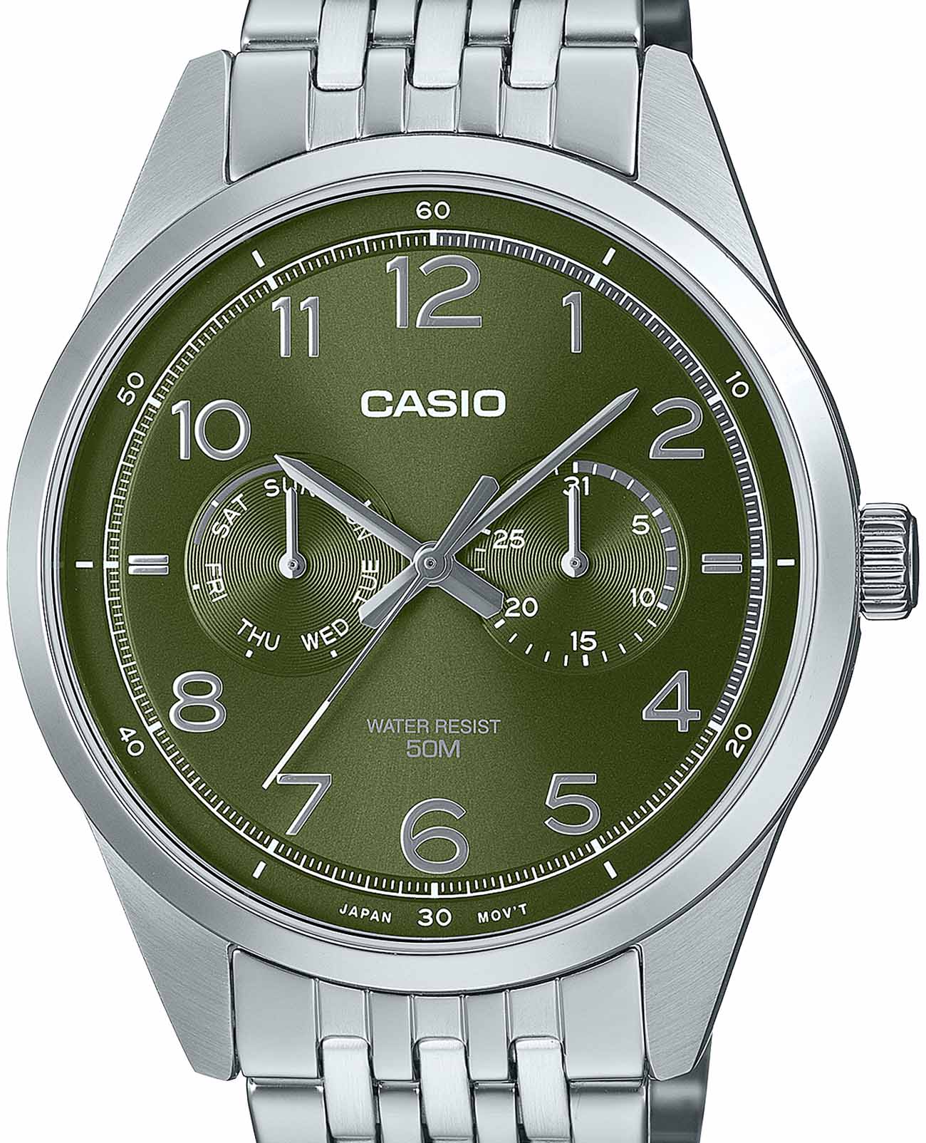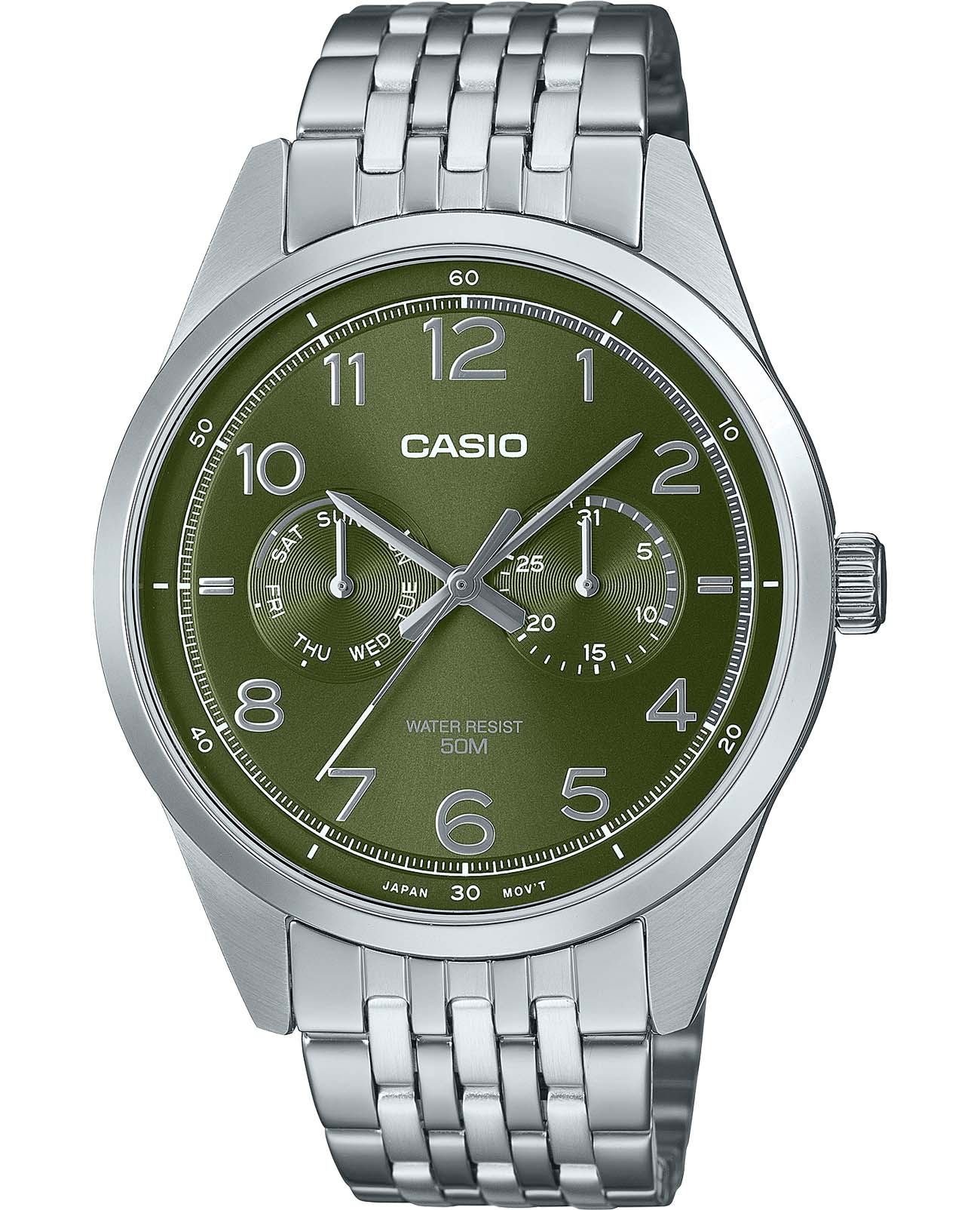 Японские мужские часы с минеральным стекломМинеральное стеклоМинеральное стекло представляет собой искусственно выращенный минерал кварца. Такое стекло отличается особой устойчивостью к повреждениям и царапинам. Уступает по некоторым качествам сапфировому стеклу. Casio Collection MTP-E340D-3AV, кварцевый механизм с высокой точностью. Корпус часов изготовлен из нержавеющей стали. Циферблат выполнен по технологии Sunray (солнечные лучи). Метки в виде цифр. Заводная головка с защитой. Батарейка рассчитана на 3 года. Класс водозащиты: 50 метров, позволит защитить корпус от случайных брызг или капель дождя. Стальной браслет на раскладной застёжкеРаскладная застёжкаТакой тип застёжки используется только на браслетах из металла. Она никогда не раскрывается полностью, происходит разделение на 2 и более частей. Раскладывающая застёжка снизит вероятность потери часов к минимуму..
