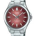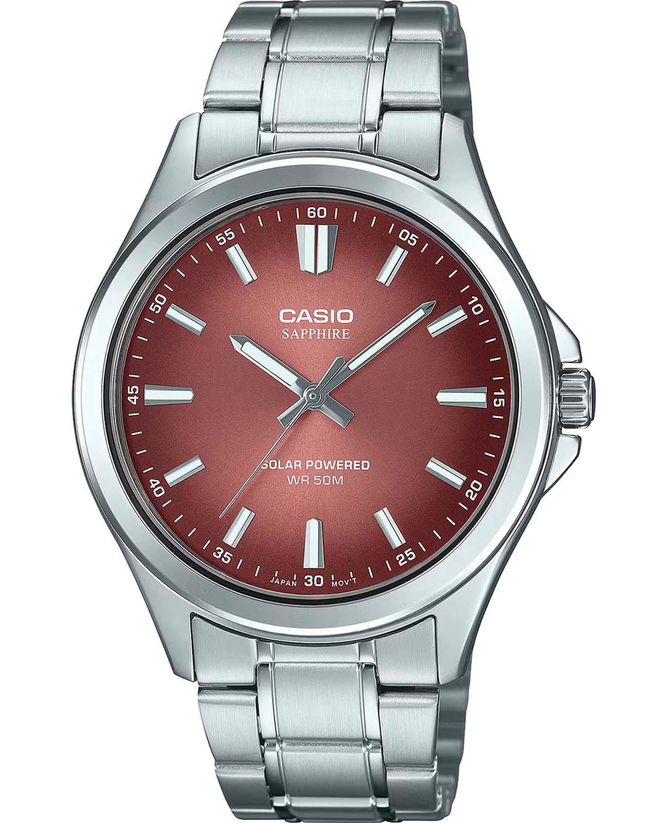 Мужские кварцевые часы Casio Collection — это современный и практичный аксессуар с питанием от солнечной энергии. Корпус размером 41,7 мм и толщиной 9,5 мм выполнен из нержавеющей стали. Циферблат красного цвета оформлен штрихами и стрелками. Циферблат защищён сапфировым стекломСапфировое стеклоПрочный и надёжный материал из кристалла сапфира синтетического происхождения, характеризующийся особой твёрдостью и устойчивостью к царапинам и повреждениям. с антибликовым покрытиемАнтибликовое покрытиеСлой оксида металла в 0,13-0,3 микрон, благодаря которому стекло часов не бликует и не отражает свет. Антибликовое покрытие уменьшает отражение света в 10 раз, обеспечивая отличную читаемость показателей циферблата.. Механизм — японский кварцевый калибр Miyota с центральной секундной стрелкой. Часы оснащены стальным браслетом из нержавеющей стали на раскладной застёжкеРаскладная застёжкаТакой тип застёжки используется только на браслетах из металла. Она никогда не раскрывается полностью, происходит разделение на 2 и более частей. Раскладывающая застёжка снизит вероятность потери часов к минимуму.. Заводная головка с защитой повышает надёжность. Водонепроницаемость 50 м позволяет использовать часы при мытье рук или в дождь. Идеальный выбор для тех, кто ценит японское качество и универсальный дизайн.