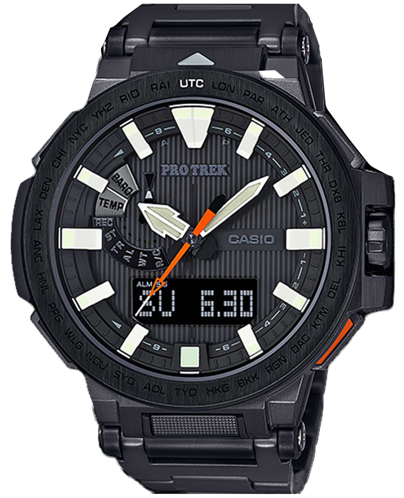 Casio Pro Trek PRX-8000YT-1JF- модель, которая на сегодняшний день считается одной из лучших для занятий профессиональным альпинизмом Сверхнадежные часы отличаются не только премиальным дизайном, богатым набором функций, но и превосходной считываемостью информации, поэтому спокойно могут быть использованы альпинистами даже на высоте 8 километров Самые ключевые детали корпуса этой модели выполнены из высокопрочного сплава титана, который для дополнительной стойкости покрыт слоем карбида титана Корона часов, безель и все кнопки обработаны покрытием DLC (углеродное алмазное вещество) Циферблат со стрелками с двойной люминесцентной обработкой для лучшей видимости в темноте покрыт сверхпрочным сапфировым стеклом PRX-8000YT-1JF имеют максимальную защиту, поэтому не боятся ни ударов, ни вибрации, ни погружения в воду (до 100 метров), ни перепадов температур (до -10°C), да и трудно найти что-то такое, что могло бы их сильно повредить Конечно, при желании можно разбить любые защищенные часы, но в альпинизме, где всякое случается, модель PRX-8000T – это самый надежный помощник, который точно не подведет. Главная функциональная особенность этих часов – это наличие сверхточного датчика Triple Sensor Ver 3. СекундомерСекундомерСекундоме́р — прибор, способный измерять интервалы времени с точностью до долей секунды. с точностью показаний 1/100с и временем измерения 24ч. Сплит-хронографСплит-хронографИспользуется для измерения продолжительности нескольких временных отрезков, начинающихся одновременно, а заканчивающихся в разное время.. ТаймерТаймерОтсчитывает секунды в обратном направлении в заданном интервале времени. обратного отсчета от 1с до 1ч. Мировое времяМировое время Полезное часовое усложнение, отображающее время в основных городах и известных областях по всему миру, оно связано с часовыми поясами, удобно для путешественников и бизнесменов. – 29 городов (29 часовых поясов), всемирное координированное время (UTC). Функция включения/отключения летнего времени. Функция автоматической коррекции положения стрелок проверяет положение стрелок каждый час и корректирует его в случае необходимости. Технология Triple Sensor позволяет точно и легко определять сторону света, температуру и атмосферное давление. Термометр от -10° до +60°С с точностью 0,1°C. Барометр - измерение атмосферного давления от 260 до 1100 гПа (от 195 до 825 мм рт. ст.). Встроенный цифровой компас. Диапазон измерения от 0° до 359° с точностью 1°. Высотомер - встроенный датчик барометрического давления с возможностью вывода результатов в единицах высоты над уровнем моря (от -700 до 10000 метров).