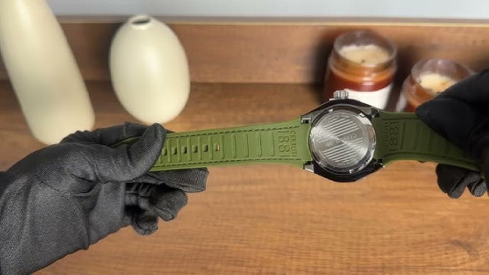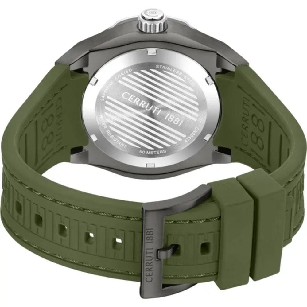 Cerruti 1881 CIWGN0042902 — выразительные мужские часы с характером, созданные в духе современной урбанистики. Массивный корпус из нержавеющей стали с серым матовым PVD-покрытиемPVDУльтратонкое покрытие наносится в технике вакуумного напыления, сочетает в себе нитрид титана особой прочности со слоем золота или оксида хрома. Несёт в себе декоративную или защитную функцию. и геометричным безелемБезельВнешний ободок, закрепляющий стекло. В спортивных часах так называется поворотное кольцо с делениями на циферблате, выполняет роль таймера – замеряет отрезки времени на шкале. Неподвижный безель – элемент декора. Однонаправленно вращающийся безель на дайверских часах позволяет фиксировать моменты погружения и выныривания на поверхность. подчёркивает силу и уверенность дизайна. Глубокий зелёный циферблат с горизонтальной текстурой дополняют чёткие метки и стрелки с люминесцентным покрытиемЛюминесцентное покрытиеПозволяет считывать показания времени в темноте. Производители наносят на стрелки, часовые индексы, безель или поверхность циферблата светонакопительный состав, дающий холодное свечение., обеспечивающие отличную читаемость даже в сумерках. Функциональное оформление включает окно даты на позиции «3 часов», подчёркивающую практичный характер модели. Прочное минеральное стеклоМинеральное стеклоМинеральное стекло представляет собой искусственно выращенный минерал кварца. Такое стекло отличается особой устойчивостью к повреждениям и царапинам. Уступает по некоторым качествам сапфировому стеклу. защищает циферблат, а эластичный силиконовый ремешок в тон циферблату обеспечивает комфорт и современный спортивный акцент. Cerruti 1881 — стильный аксессуар для мужчин, ценящих надёжность, функциональность и безупречное чувство стиля.