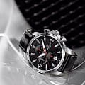 Брендовый аксессуар показывает время с абсолютной точностью благодаря швейцарскому автоматическому механизму ETA C01.211 с запасом хода на 40 часов. Ремешок выполнен из натуральной кожи, для изготовления корпуса выбрали сталь 316L. Стрелки и метки дополнены люминесцентной подсветкойЛюминесцентное покрытиеПозволяет считывать показания времени в темноте. Производители наносят на стрелки, часовые индексы, безель или поверхность циферблата светонакопительный состав, дающий холодное свечение.. Функции: секундомер, календарь, тахиметрТахиметрРазмеченная шкала, располагается на ободке или безеле часов. Тахиметр позволяет рассчитать скорость на определённом участке пути, расстояние измеряется в километрах или милях..