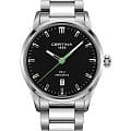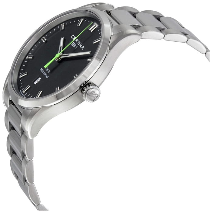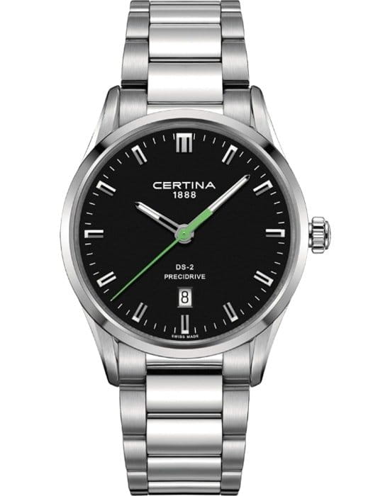 Наручные часы не имеют лишних деталей, всё выглядит строго и лаконично. Яркой деталью является зелёная секундная стрелка, облегчающая читаемость данных. За высокую точность хода в ответе швейцарский кварцевый механизм ETA F06.411Precidrive™Precidrive™Инновационный кварцевый механизм Certina. Часы, оснащённые этим швейцарским калибром, приравниваются к точности к сертифицированным хронометрам, точность хода составляет +/-10 секунд в год.. Корпус и браслет изготовлены из стали 316L с антикоррозионными свойствами. Концепция Двойной Надёжности Double SecurityDS ConceptDouble Security Concept, обозначает двойную надёжность и безупречную точность часов Certina. Двойная система защиты подразумевает обеспечение максимальной устойчивости к ударам и высоких показателей водонепроницаемости.. Сапфировое стекло с односторонним покрытием «антиблик». Водостойкость 100 метров. Люминесцентная подсветкаЛюминесцентное покрытиеПозволяет считывать показания времени в темноте. Производители наносят на стрелки, часовые индексы, безель или поверхность циферблата светонакопительный состав, дающий холодное свечение.. Стальная . Окошко текущего числа, функция EOLEOLПредставляет собой систему, уведомляющую владельца часов о необходимости замены элемента питания. За 2 недели до полного разряда батарейки секундная стрелка перестаёт ходить чётко и начинает перепрыгивать на 3-4 деления.. Диаметр корпуса: 40 мм.