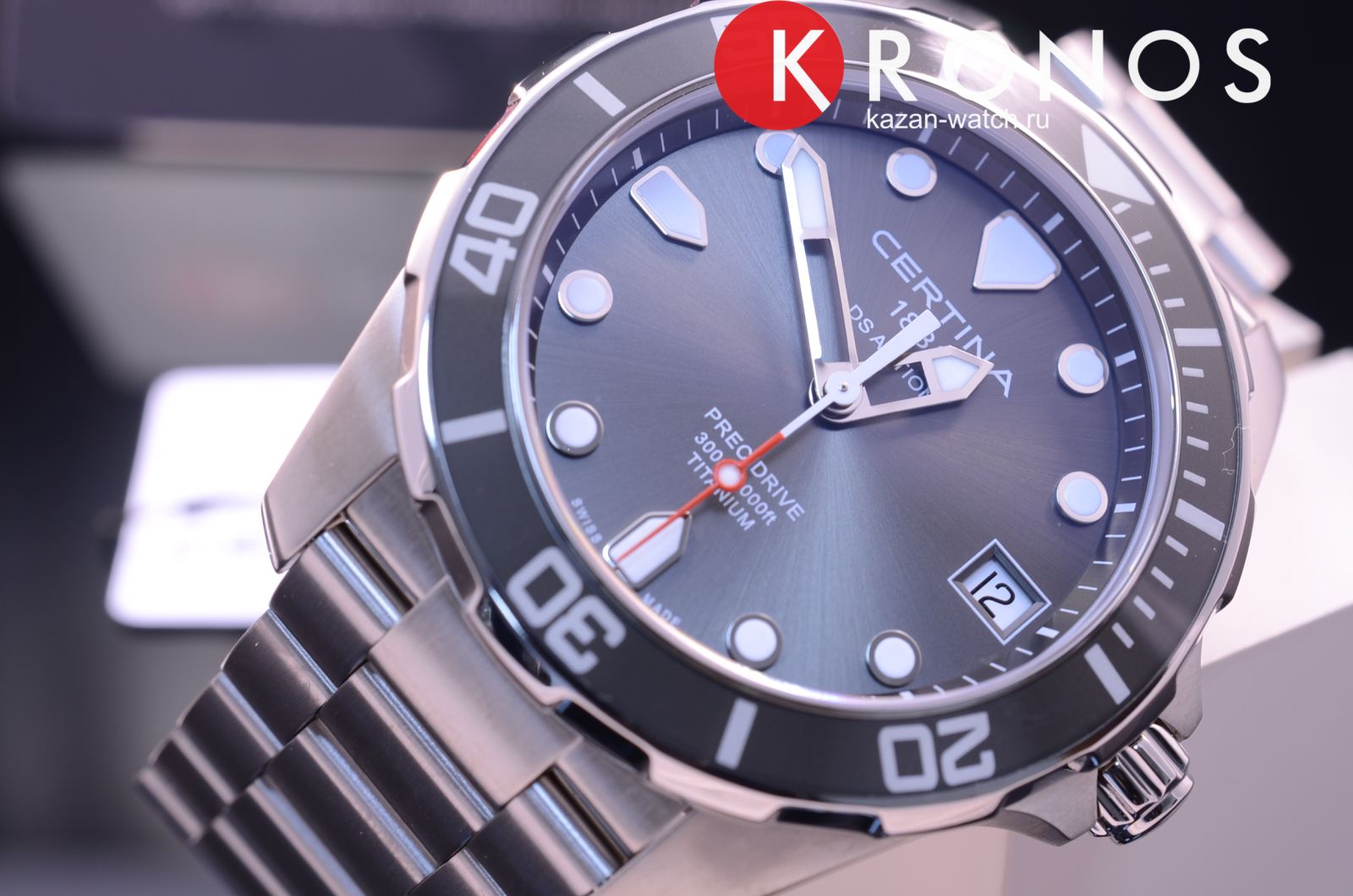 Наручные часы представляют собой настоящий шедевр, безупречно всё: от продуманного дизайна до высокого качества исполнения. Модель выполнена из титана, отличающегося устойчивостью к воздействию магнитных полей и морской воды. Швейцарский кварцевый механизм ETA F07.411 Precidrive™Precidrive™Инновационный кварцевый механизм Certina. Часы, оснащённые этим швейцарским калибром, приравниваются к точности к сертифицированным хронометрам, точность хода составляет +/-10 секунд в год. демонстрирует максимальную точность хода. Сапфировое стекло с антибликовой поверхностью. Односторонне вращающийся безельБезельВнешний ободок, закрепляющий стекло. В спортивных часах так называется поворотное кольцо с делениями на циферблате, выполняет роль таймера – замеряет отрезки времени на шкале. Неподвижный безель – элемент декора. Однонаправленно вращающийся безель на дайверских часах позволяет фиксировать моменты погружения и выныривания на поверхность.. Реализация концепции Double SecurityDS ConceptDouble Security Concept, обозначает двойную надёжность и безупречную точность часов Certina. Двойная система защиты подразумевает обеспечение максимальной устойчивости к ударам и высоких показателей водонепроницаемости.. Водонепроницаемость при давлении до 30 бар. Застёжка с фиксатором и удлинением для дайверовУдлинение для дайверовЗастёжка с удлинением для дайверов представляет собой безопасное крепление, которое позволяет надевать часы поверх гидрокостюма. Гибкая застёжка удлиняется на 1-2 миллиметра.. Яркая люминесцентная подсветкаЛюминесцентное покрытиеПозволяет считывать показания времени в темноте. Производители наносят на стрелки, часовые индексы, безель или поверхность циферблата светонакопительный состав, дающий холодное свечение.. Окошко даты, индикатор EOLEOLПредставляет собой систему, уведомляющую владельца часов о необходимости замены элемента питания. За 2 недели до полного разряда батарейки секундная стрелка перестаёт ходить чётко и начинает перепрыгивать на 3-4 деления.. Диаметр корпуса: 41 мм.