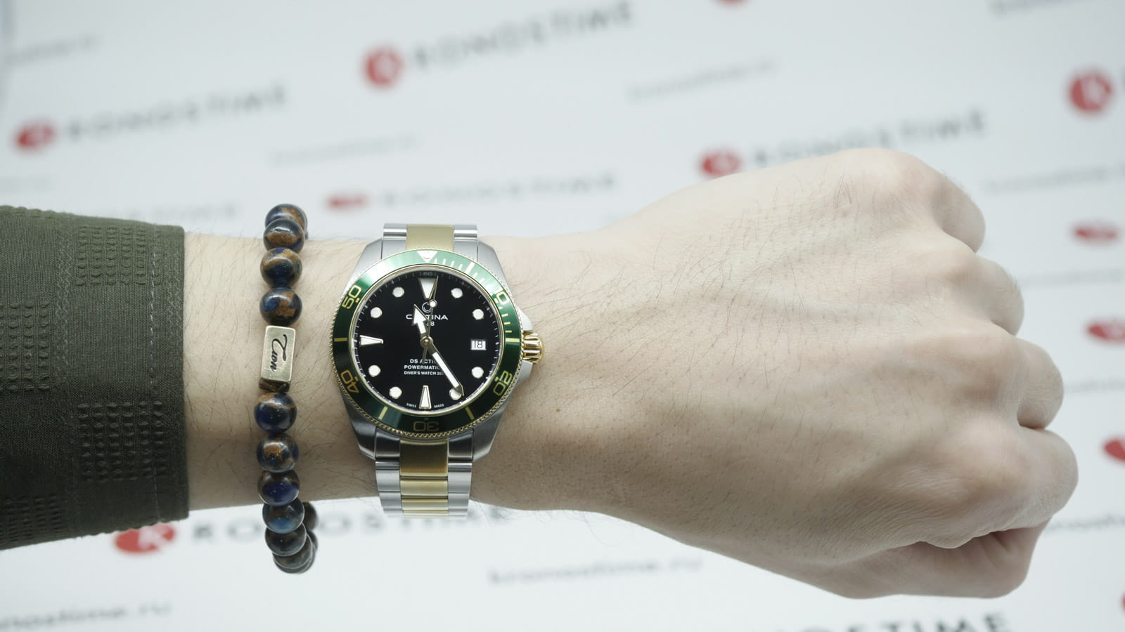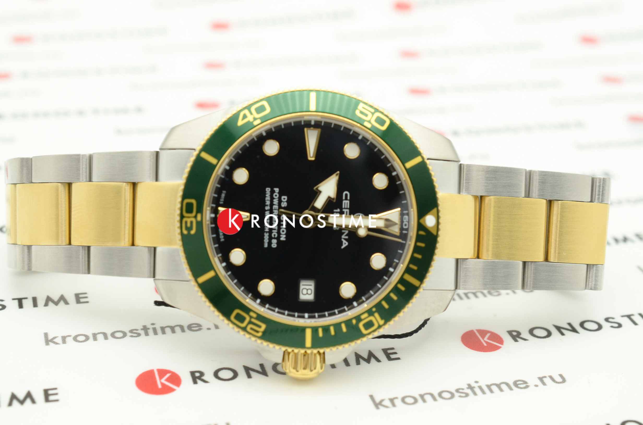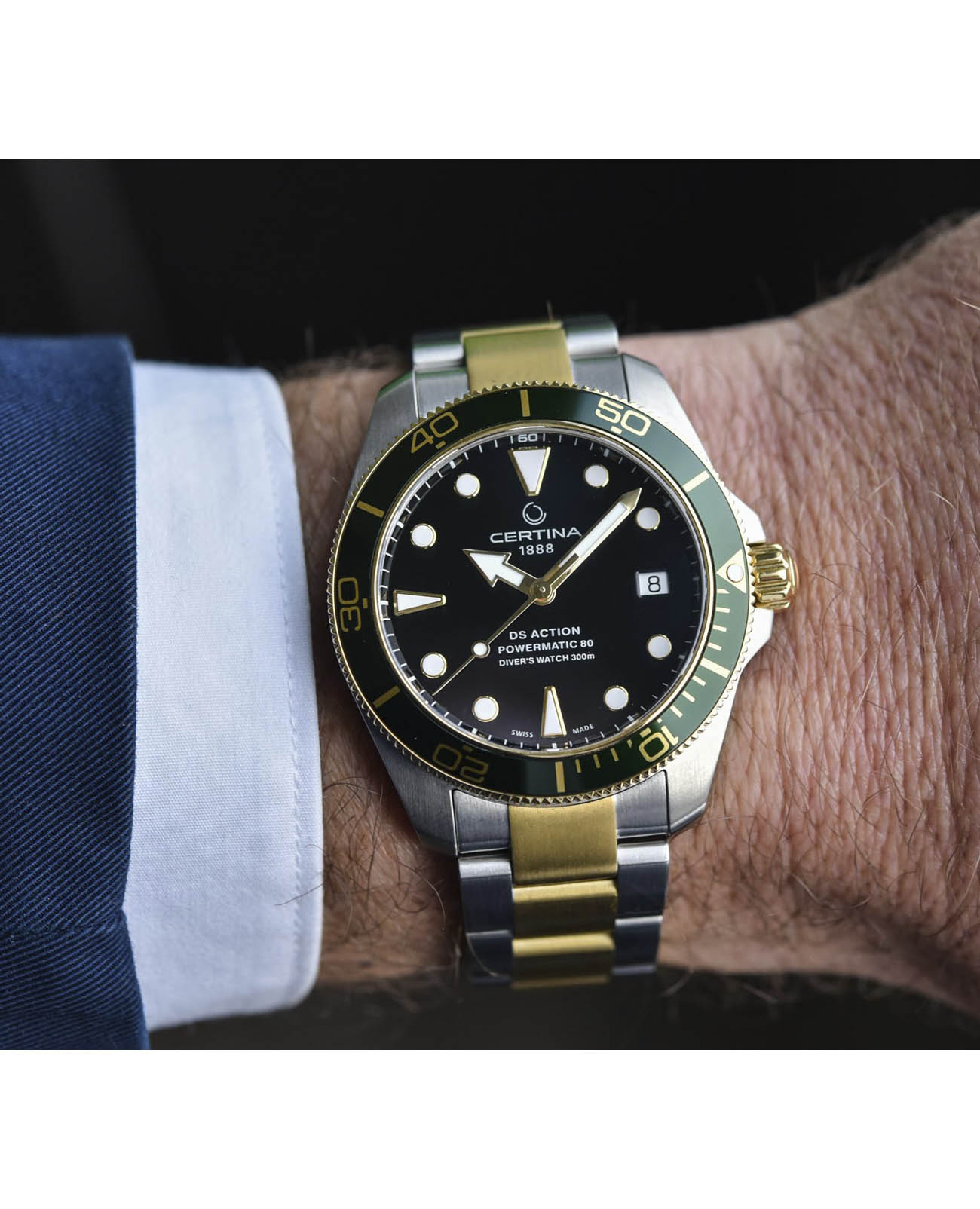 Швейцарские мужские механические часы Certina DS Action Diver 80 C0328072205101 из коллекции DS Action отражают непревзойдённый стиль с дайверским характером. Модель имеет яркий акцент в виде комбинированного циферблата. Крупная индикация времени позволяет считывать показания с циферблата в любой ситуации. Автоматический швейцарский калибр ETA Powermatic 80Powermatic 80Эксклюзивный калибр от швейцарской компании ETA с увеличенным запасом хода до 80 часов за счёт удлинённой заводной пружины. Характеризуется улучшенной системой спуска со сниженным трением. с резервом хода на 80 часов. Концепция DS ConceptDS ConceptDouble Security Concept, обозначает двойную надёжность и безупречную точность часов Certina. Двойная система защиты подразумевает обеспечение максимальной устойчивости к ударам и высоких показателей водонепроницаемости.. Сапфировое стекло. Алюминиевый вращающийся безельБезельВнешний ободок, закрепляющий стекло. В спортивных часах так называется поворотное кольцо с делениями на циферблате, выполняет роль таймера – замеряет отрезки времени на шкале. Неподвижный безель – элемент декора. Однонаправленно вращающийся безель на дайверских часах позволяет фиксировать моменты погружения и выныривания на поверхность.. Водонепроницаемость 300 метров. Люминесцентная подсветкаЛюминесцентное покрытиеПозволяет считывать показания времени в темноте. Производители наносят на стрелки, часовые индексы, безель или поверхность циферблата светонакопительный состав, дающий холодное свечение.. Стальной браслет с застёжкой, имеющей удлинение для дайверовУдлинение для дайверовЗастёжка с удлинением для дайверов представляет собой безопасное крепление, которое позволяет надевать часы поверх гидрокостюма. Гибкая застёжка удлиняется на 1-2 миллиметра.. Апертура даты. Диаметр корпуса: 38 мм. Производство и сборка: Швейцария.