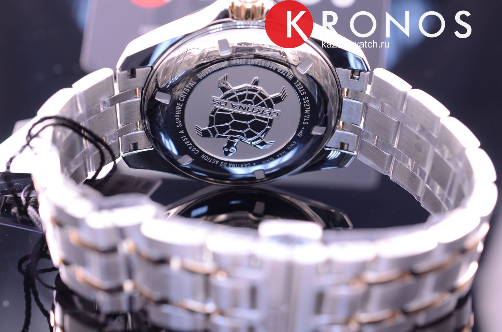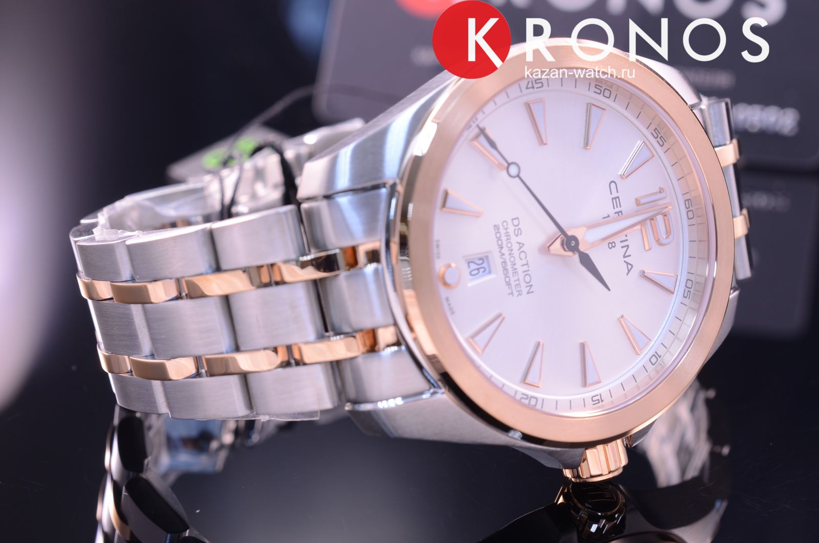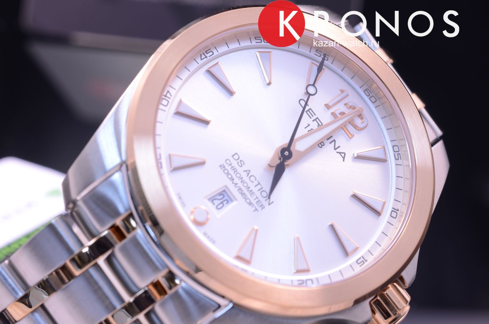Биколорная модель уже не первый сезон остаётся на вершине трендов, аксессуар на вашем запястье позволит создавать стильные образы. Серебристый циферблат «солнечные лучи» имеет крупную индикацию времени, отличительным элементом стала оригинальная секундная стрелка. Безупречная точность хронометра отмечена сертификатом COSCСертификат COSCОфициальный сертификат, подтверждающий то, что часы ходят с особо высокой точностью. Для получения документа часы подвергаются тестовым испытаниям, разработанным швейцарским институтом тестирования хронометров COSC. Допустимая норма для механических часов -4/+6 секунд в день, для кварцевых моделей +/- 0,07 секунд в день.. Швейцарский кварцевый механизм Precidrive™Precidrive™Инновационный кварцевый механизм Certina. Часы, оснащённые этим швейцарским калибром, приравниваются к точности к сертифицированным хронометрам, точность хода составляет +/-10 секунд в год.. Корпус и браслет из стали 316L, устойчивой к коррозии. PVD-покрытиеPVDУльтратонкое покрытие наносится в технике вакуумного напыления, сочетает в себе нитрид титана особой прочности со слоем золота или оксида хрома. Несёт в себе декоративную или защитную функцию. цвета розового золота. Стрелки и метки с люминесцентным покрытиемЛюминесцентное покрытиеПозволяет считывать показания времени в темноте. Производители наносят на стрелки, часовые индексы, безель или поверхность циферблата светонакопительный состав, дающий холодное свечение.. Концепция Двойной Надёжности DS ConceptDS ConceptDouble Security Concept, обозначает двойную надёжность и безупречную точность часов Certina. Двойная система защиты подразумевает обеспечение максимальной устойчивости к ударам и высоких показателей водонепроницаемости.. Антибликовое покрытие стекла из сапфира. Завинчивающаяся задняя крышка и заводная головка. Водонепроницаемость 200 метров. Индикация числа, функция EOLEOLПредставляет собой систему, уведомляющую владельца часов о необходимости замены элемента питания. За 2 недели до полного разряда батарейки секундная стрелка перестаёт ходить чётко и начинает перепрыгивать на 3-4 деления.. Диаметр корпуса: 41,8 мм.