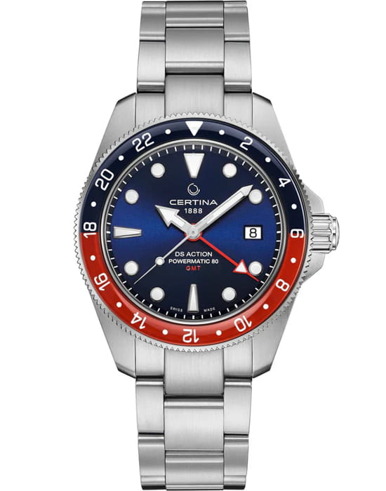 Мужские швейцарские механические часы с автоподзаводом Certina DS Action Gmt Powermatic 80 C032.929.11.041.00, механический механизм (автоматический калибр) с высокой точностью. Сапфировое стеклоСапфировое стеклоПрочный и надёжный материал из кристалла сапфира синтетического происхождения, характеризующийся особой твёрдостью и устойчивостью к царапинам и повреждениям. устойчивое к появлению царапин, обладающее высокой прозрачностью. Корпус изготовлен из нержавеющей стали.  БезельБезельВнешний ободок, закрепляющий стекло. В спортивных часах так называется поворотное кольцо с делениями на циферблате, выполняет роль таймера – замеряет отрезки времени на шкале. Неподвижный безель – элемент декора. Однонаправленно вращающийся безель на дайверских часах позволяет фиксировать моменты погружения и выныривания на поверхность. из стали с сапфировым стеклом. Стрелки и метки с люминесцентным покрытиемЛюминесцентное покрытиеПозволяет считывать показания времени в темноте. Производители наносят на стрелки, часовые индексы, безель или поверхность циферблата светонакопительный состав, дающий холодное свечение.. Окошко даты находится в положении 3 часа. Класс водозащиты: 200 метров, позволит плавать, нырять и заниматься другими водными видами спорта. Стальной браслет на раскладной застёжкеРаскладная застёжкаТакой тип застёжки используется только на браслетах из металла. Она никогда не раскрывается полностью, происходит разделение на 2 и более частей. Раскладывающая застёжка снизит вероятность потери часов к минимуму..