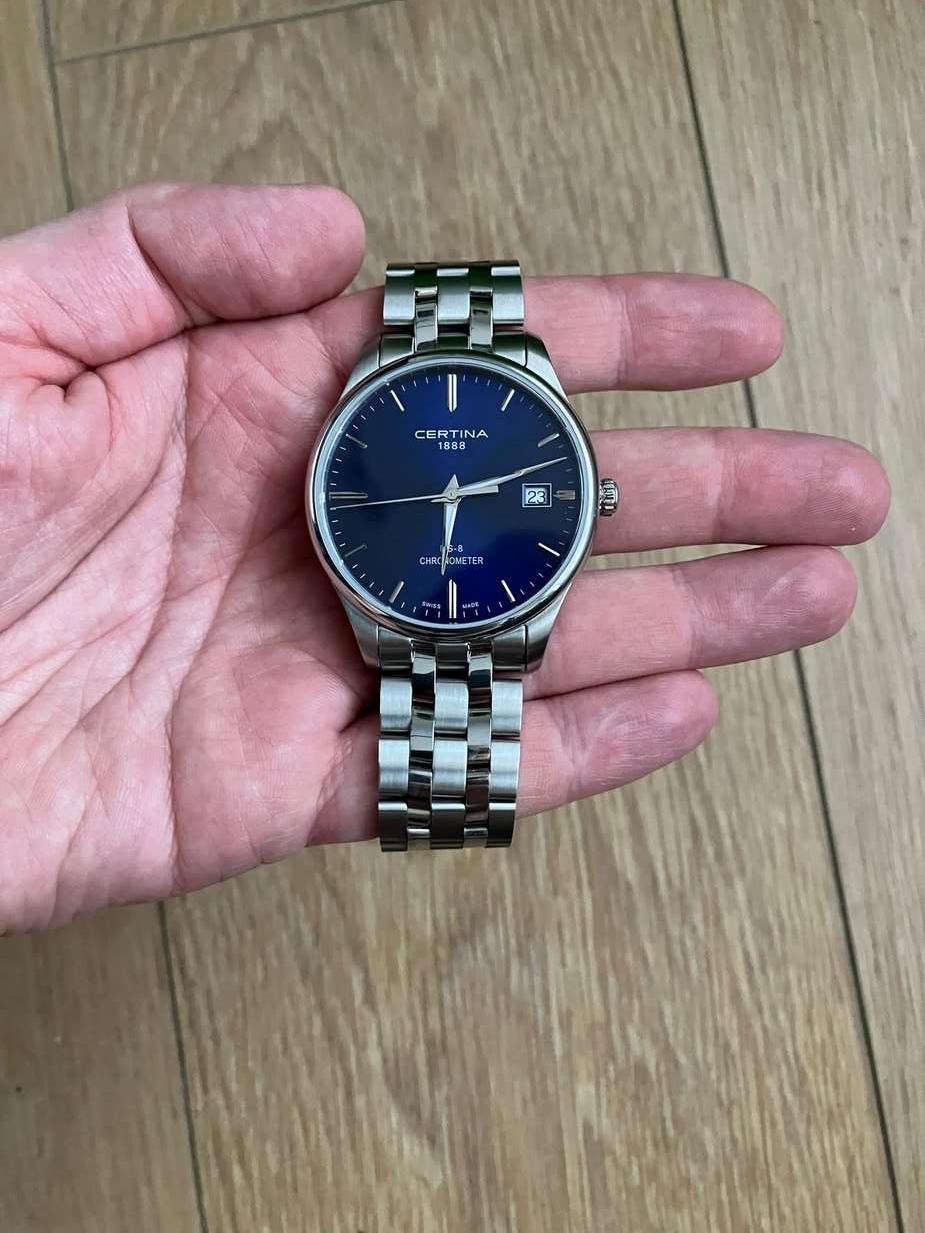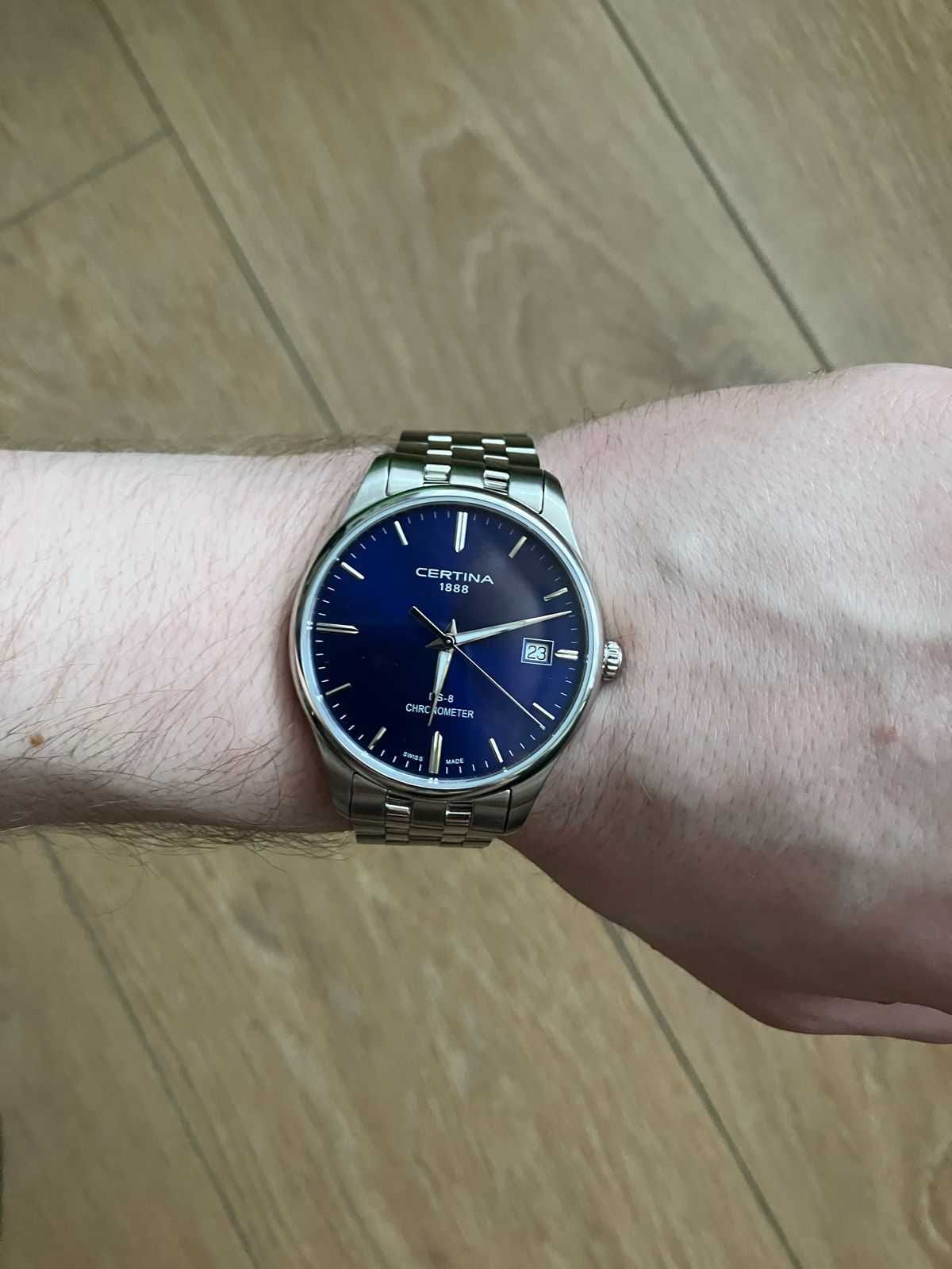 Металлический блеск нержавеющей стали 316L идеально сочетается с повседневным или деловым стилем в одежде, яркой деталью стал синий циферблат. Часы в универсальном исполнении измеряют время с абсолютной точностью, что подтверждено официальным сертификатом COSCСертификат COSCОфициальный сертификат, подтверждающий то, что часы ходят с особо высокой точностью. Для получения документа часы подвергаются тестовым испытаниям, разработанным швейцарским институтом тестирования хронометров COSC. Допустимая норма для механических часов -4/+6 секунд в день, для кварцевых моделей +/- 0,07 секунд в день.. Швейцарский кварцевый механизм ETA F07.412 Precidrive™Precidrive™Инновационный кварцевый механизм Certina. Часы, оснащённые этим швейцарским калибром, приравниваются к точности к сертифицированным хронометрам, точность хода составляет +/-10 секунд в год.. Повышенные ударопрочные свойства - концепция Двойной Надёжности DS ConceptDS ConceptDouble Security Concept, обозначает двойную надёжность и безупречную точность часов Certina. Двойная система защиты подразумевает обеспечение максимальной устойчивости к ударам и высоких показателей водонепроницаемости.. Сапфировое стекло с односторонней антибликовой обработкой. Водонепроницаемость 100 метров. Прямоугольная апертура даты. Индикатор EOLEOLПредставляет собой систему, уведомляющую владельца часов о необходимости замены элемента питания. За 2 недели до полного разряда батарейки секундная стрелка перестаёт ходить чётко и начинает перепрыгивать на 3-4 деления.. Диаметр корпуса: 40,2 мм.