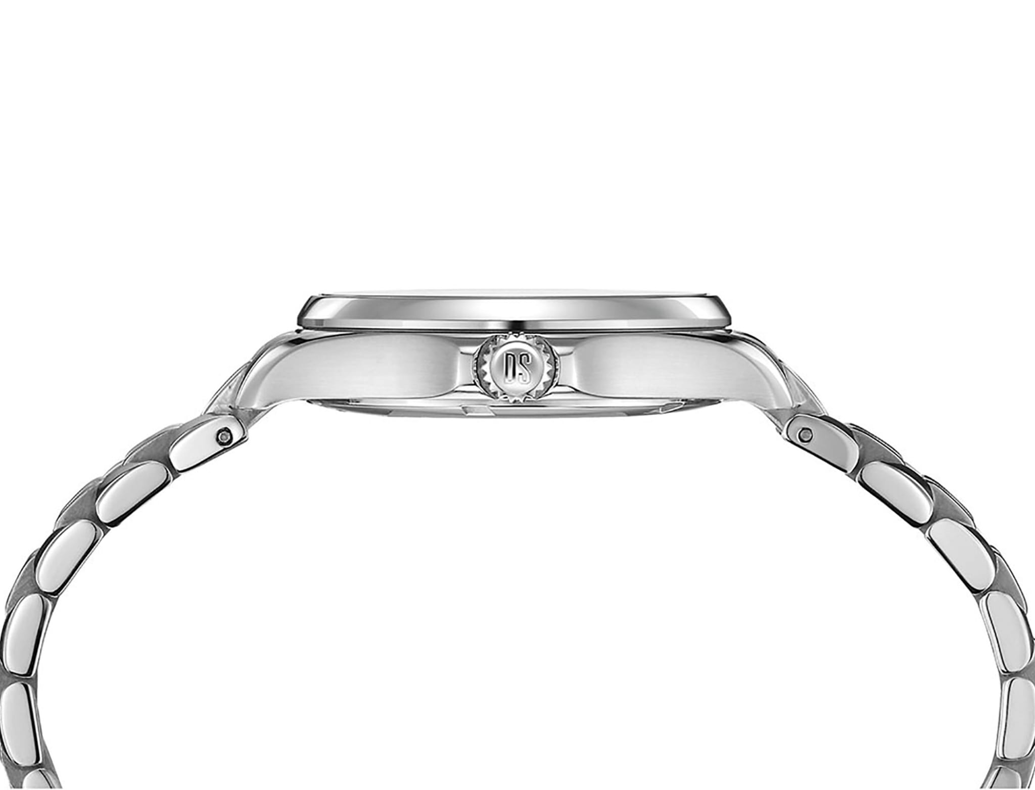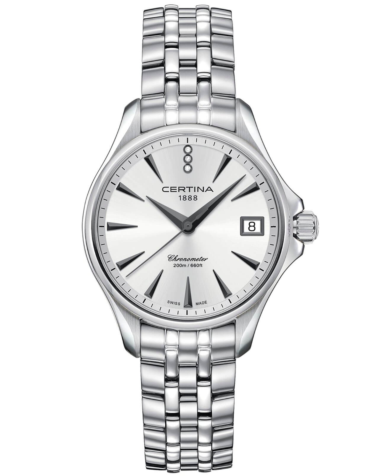 Брендовая модель с серебристым блеском является идеальным решением для торжественного мероприятия или вечеринки. Минималистичный циферблат декорирован 3 бриллиантами оттенка Top Wesselton, стиля добавляет узор по окружности. Наручные часы за безупречную точность хода швейцарского кварцевого калибра ETA F06.411 отмечены сертификатом хронометра COSCСертификат COSCОфициальный сертификат, подтверждающий то, что часы ходят с особо высокой точностью. Для получения документа часы подвергаются тестовым испытаниям, разработанным швейцарским институтом тестирования хронометров COSC. Допустимая норма для механических часов -4/+6 секунд в день, для кварцевых моделей +/- 0,07 секунд в день.. Закручивающаяся заводная головка и задняя крышка. Концепция DS ConceptDS ConceptDouble Security Concept, обозначает двойную надёжность и безупречную точность часов Certina. Двойная система защиты подразумевает обеспечение максимальной устойчивости к ударам и высоких показателей водонепроницаемости.. Сапфировое стекло с односторонним антибликовым покрытием. Водостойкость 200 метров. . Стальной ударопрочный корпусУдаропрочный корпусМеханизм заключён в корпус, выполненный из современных материалов, устойчивых к ударам, механическим повреждениям и падению с высоты: инновационный пластик, карбон, нержавеющая сталь, титан. и браслет. Окошко даты, индикатор EOLEOLПредставляет собой систему, уведомляющую владельца часов о необходимости замены элемента питания. За 2 недели до полного разряда батарейки секундная стрелка перестаёт ходить чётко и начинает перепрыгивать на 3-4 деления.. Диаметр корпуса: 33,8 мм.