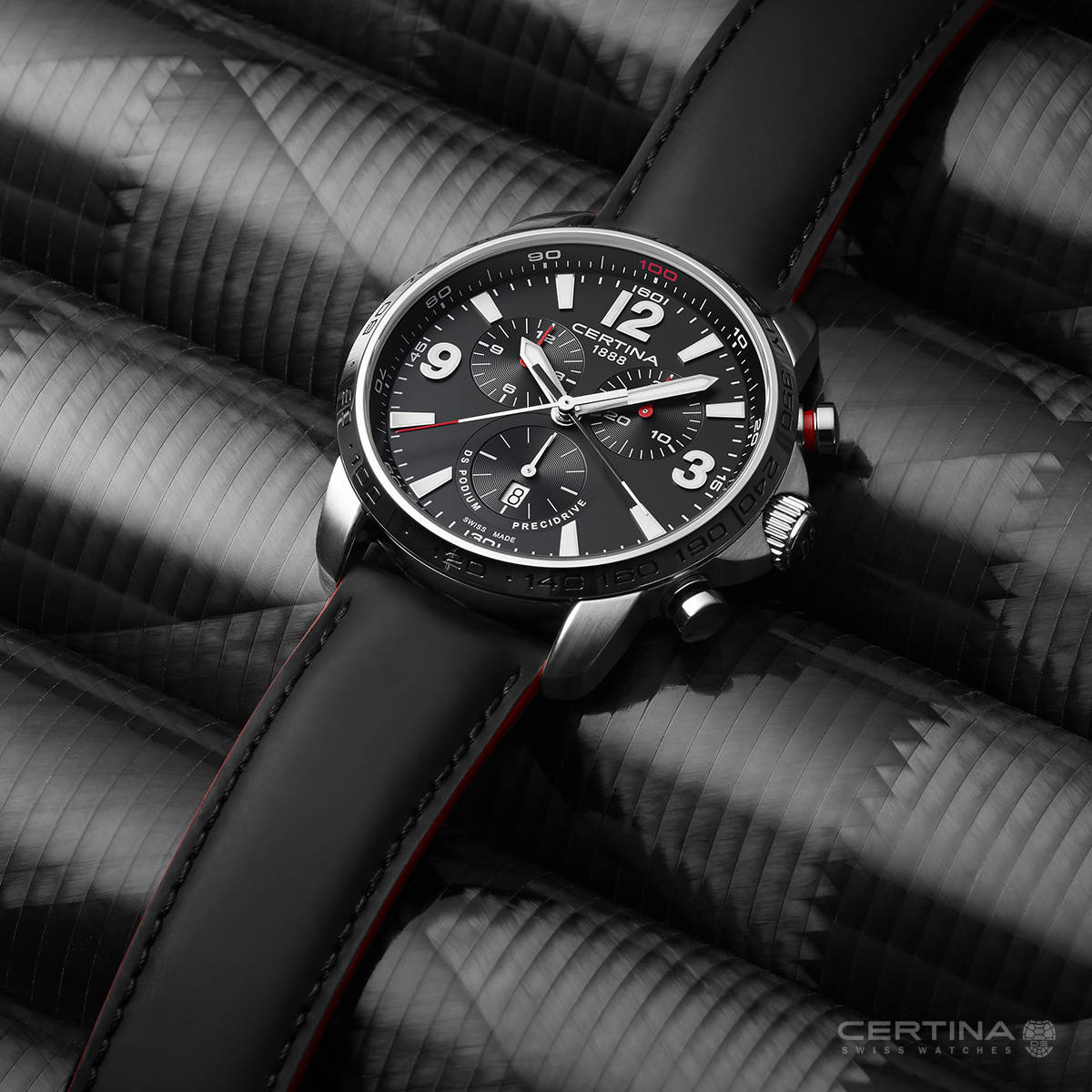 Брендовый хронографХронографФункция позволяет измерять отрезки времени с особой точностью: часы, минуты, секунды. Верным признаком хронографа является наличие на циферблате 3 дополнительных окошек-счётчиков. в чёрно-серебристом исполнении дополнен красными элементами, придающими общему виду динамичность. Наручные часы отличаются повышенной устойчивостью к высоким нагрузкам благодаря реализации фирменной концепции Двойной Надёжности DS ConceptDS ConceptDouble Security Concept, обозначает двойную надёжность и безупречную точность часов Certina. Двойная система защиты подразумевает обеспечение максимальной устойчивости к ударам и высоких показателей водонепроницаемости.. Швейцарский кварцевый механизм с высокой точностью хода ETA 251.264 AA Precidrive™Precidrive™Инновационный кварцевый механизм Certina. Часы, оснащённые этим швейцарским калибром, приравниваются к точности к сертифицированным хронометрам, точность хода составляет +/-10 секунд в год.. Повышенная водонепроницаемость WR 200. Завинчивающаяся заводная головка с защитой, закручивающаяся задняя крышка с гравировкой. Двухстороннее антибликовое покрытие сапфирового стекла. БезельБезельВнешний ободок, закрепляющий стекло. В спортивных часах так называется поворотное кольцо с делениями на циферблате, выполняет роль таймера – замеряет отрезки времени на шкале. Неподвижный безель – элемент декора. Однонаправленно вращающийся безель на дайверских часах позволяет фиксировать моменты погружения и выныривания на поверхность. со шкалой тахиметраТахиметрРазмеченная шкала, располагается на ободке или безеле часов. Тахиметр позволяет рассчитать скорость на определённом участке пути, расстояние измеряется в километрах или милях.. Яркая люминесцентная подсветкаЛюминесцентное покрытиеПозволяет считывать показания времени в темноте. Производители наносят на стрелки, часовые индексы, безель или поверхность циферблата светонакопительный состав, дающий холодное свечение.. Кожаный ремешок из натурального материала. Механизм индикации часовых поясов, отображение даты, измерение времени с точностью до 1/100 секунды. . Диаметр корпуса: 44 мм.