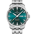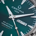 Брендовая модель имеет изумрудный циферблат с контрастными стрелками и часовой разметкой, что обеспечивает хорошую читаемость показателей в любых условиях. Стальной браслет надёжно обхватывает запястье, а предотвращает случайное расстёгивание. Часы работают за счёт швейцарского пружинного механизма ETA Powermatic 80Powermatic 80Эксклюзивный калибр от швейцарской компании ETA с увеличенным запасом хода до 80 часов за счёт удлинённой заводной пружины. Характеризуется улучшенной системой спуска со сниженным трением., его запас хода увеличен до 80 часов. Соблюдение DS ConceptDS ConceptDouble Security Concept, обозначает двойную надёжность и безупречную точность часов Certina. Двойная система защиты подразумевает обеспечение максимальной устойчивости к ударам и высоких показателей водонепроницаемости.. Корпус из нержавеющей стали 316L. Стекло из сапфира с покрытием «антиблик». Водостойкость 200 метров. Подсветка SuperLumiNovaЛюминесцентное покрытиеПозволяет считывать показания времени в темноте. Производители наносят на стрелки, часовые индексы, безель или поверхность циферблата светонакопительный состав, дающий холодное свечение.. Завинчивающаяся задняя крышка. Защищённая заводная головка. Календарь с индикацией числа и дня недели. Диаметр корпуса: 41 мм.