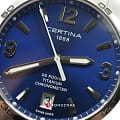 Наручные часы в спортивном стиле дополнены классическими элементами, имеют спокойную расцветку. Синий циферблат представлен в минималистичном оформлении, арабские цифры, индексы имеют контрастный оттенок. Модель оснащена швейцарским кварцевым механизмом ETA F07.412 Precidrive™Precidrive™Инновационный кварцевый механизм Certina. Часы, оснащённые этим швейцарским калибром, приравниваются к точности к сертифицированным хронометрам, точность хода составляет +/-10 секунд в год.. Безупречная точность калибра отмечена официальным сертификатом хронометра COSCСертификат COSCОфициальный сертификат, подтверждающий то, что часы ходят с особо высокой точностью. Для получения документа часы подвергаются тестовым испытаниям, разработанным швейцарским институтом тестирования хронометров COSC. Допустимая норма для механических часов -4/+6 секунд в день, для кварцевых моделей +/- 0,07 секунд в день.. Аксессуар удобен в эксплуатации, сохраняет ударопрочность и водонепроницаемость 100 метров благодаря концепции Double SecurityDS ConceptDouble Security Concept, обозначает двойную надёжность и безупречную точность часов Certina. Двойная система защиты подразумевает обеспечение максимальной устойчивости к ударам и высоких показателей водонепроницаемости.. Корпус и браслет выполнены из гипоаллергенного титана. Заводная головка с системой блокировки. Яркая люминесцентная подсветкаЛюминесцентное покрытиеПозволяет считывать показания времени в темноте. Производители наносят на стрелки, часовые индексы, безель или поверхность циферблата светонакопительный состав, дающий холодное свечение.. Индикатор EOLEOLПредставляет собой систему, уведомляющую владельца часов о необходимости замены элемента питания. За 2 недели до полного разряда батарейки секундная стрелка перестаёт ходить чётко и начинает перепрыгивать на 3-4 деления., апертура даты. Диаметр корпуса: 40 мм.