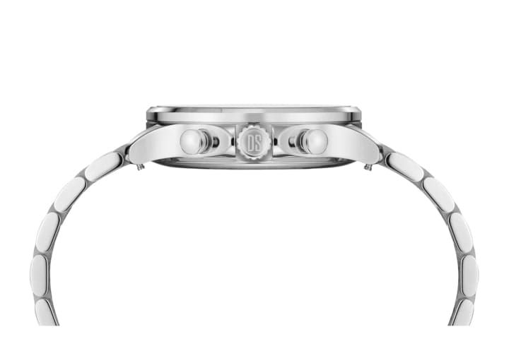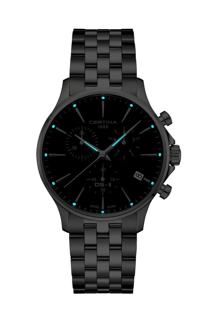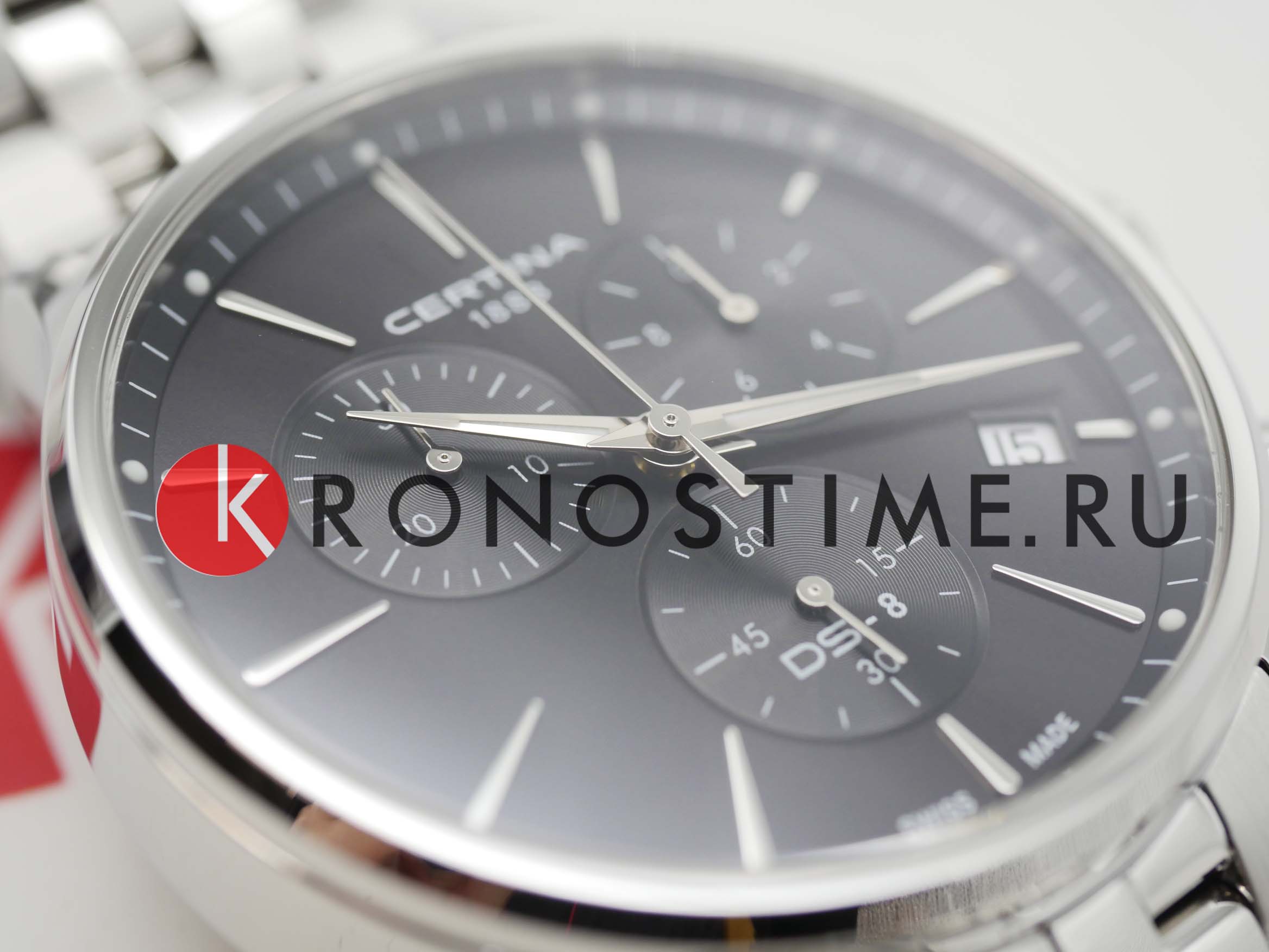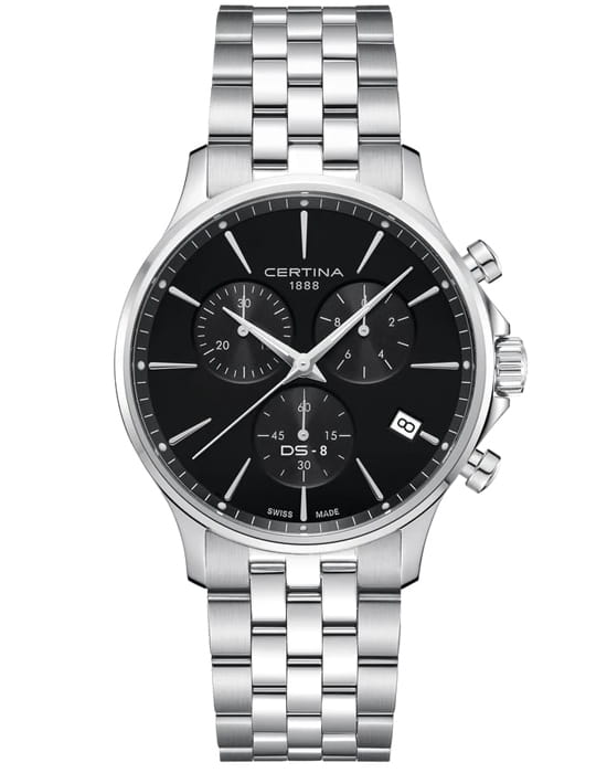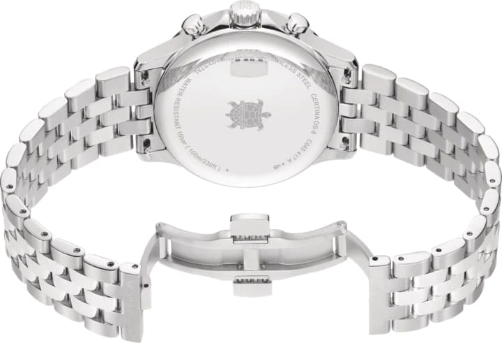 Высокая точность хода швейцарского кварцевого калибра ETA G15.212 AA Precidrive™Precidrive™Инновационный кварцевый механизм Certina. Часы, оснащённые этим швейцарским калибром, приравниваются к точности к сертифицированным хронометрам, точность хода составляет +/-10 секунд в год. отмечена сертификатом COSCСертификат COSCОфициальный сертификат, подтверждающий то, что часы ходят с особо высокой точностью. Для получения документа часы подвергаются тестовым испытаниям, разработанным швейцарским институтом тестирования хронометров COSC. Допустимая норма для механических часов -4/+6 секунд в день, для кварцевых моделей +/- 0,07 секунд в день.. Сапфировое стеклоСапфировое стеклоПрочный и надёжный материал из кристалла сапфира синтетического происхождения, характеризующийся особой твёрдостью и устойчивостью к царапинам и повреждениям. с покрытием «антиблик». ХронографХронографФункция позволяет измерять отрезки времени с особой точностью: часы, минуты, секунды. Верным признаком хронографа является наличие на циферблате 3 дополнительных окошек-счётчиков., секундомер, дата, EOLEOLПредставляет собой систему, уведомляющую владельца часов о необходимости замены элемента питания. За 2 недели до полного разряда батарейки секундная стрелка перестаёт ходить чётко и начинает перепрыгивать на 3-4 деления.. Концепция Двойной Надёжности DSDS ConceptDouble Security Concept, обозначает двойную надёжность и безупречную точность часов Certina. Двойная система защиты подразумевает обеспечение максимальной устойчивости к ударам и высоких показателей водонепроницаемости.. Стальной браслет на застёжке-бабочке с кнопкамиЗастёжка "бабочка"Такой вид застёжки дополняется предохранителями, помогающими избежать случайного раскрытия браслета. Обладают изящным исполнением. .