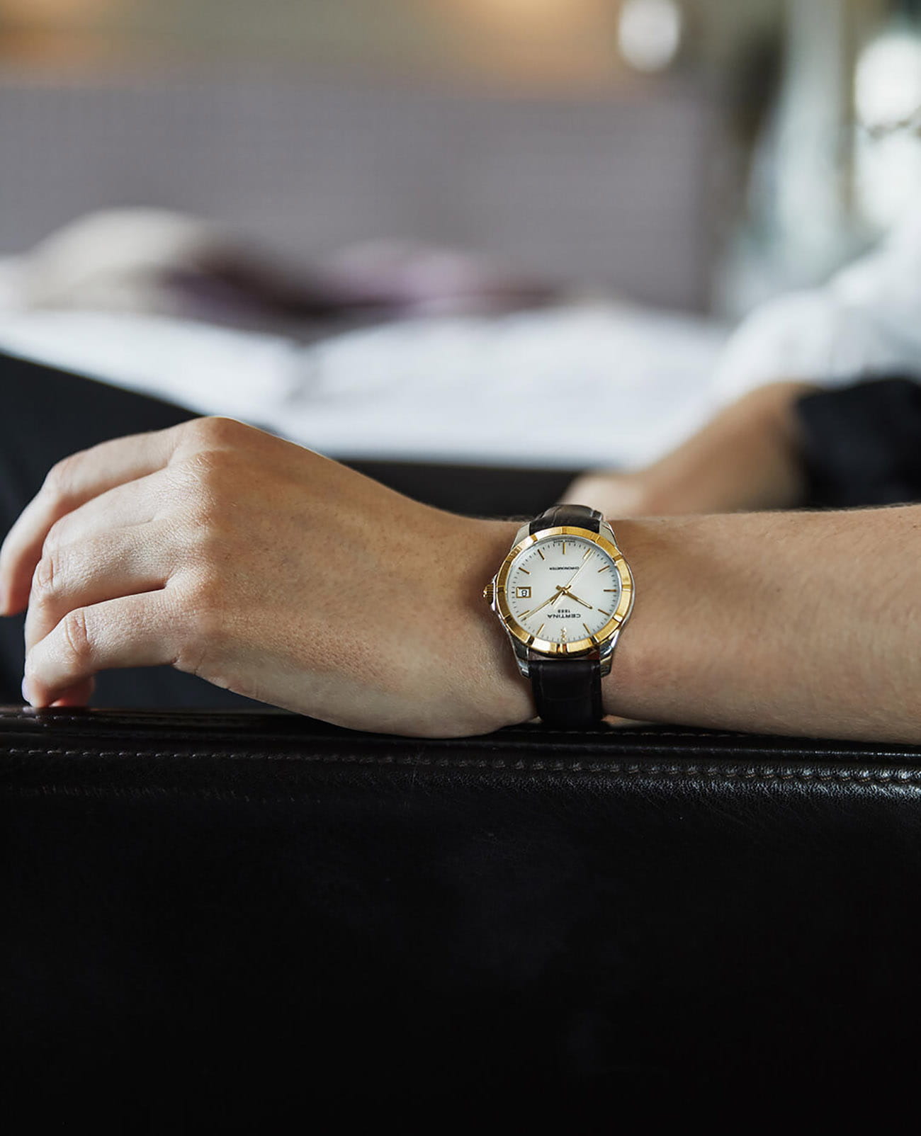 Женские швейцарские часы Certina C902.251.46.016.00 представляют собой образец элегантности и высокой точности. Стильный аксессуар для делового образа оснащён фигурным безелемБезельВнешний ободок, закрепляющий стекло. В спортивных часах так называется поворотное кольцо с делениями на циферблате, выполняет роль таймера – замеряет отрезки времени на шкале. Неподвижный безель – элемент декора. Однонаправленно вращающийся безель на дайверских часах позволяет фиксировать моменты погружения и выныривания на поверхность., выполненным из 18-ти каратного жёлтого золота18-каратное золотоОбозначение по каратной системе пробирования, оно показывает, сколько драгоценного металла содержится в изделии. 18 карат - в составе 75% чистого золота, соответствует 750 пробе.