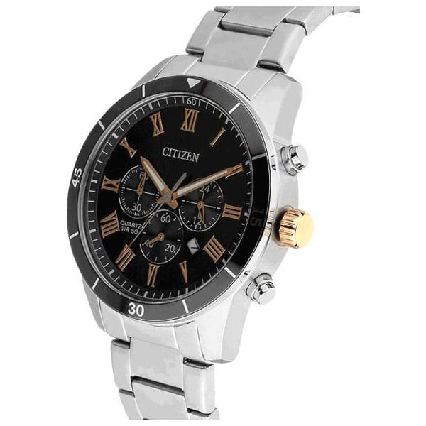 Citizen Chronograph AN8168-51H часы-хронографХронографФункция позволяет измерять отрезки времени с особой точностью: часы, минуты, секунды. Верным признаком хронографа является наличие на циферблате 3 дополнительных окошек-счётчиков. с секундомеромСекундомерСекундоме́р — прибор, способный измерять интервалы времени с точностью до долей секунды. спортивного дизайна с высоким уровнем водозащиты. Корпус из нержавеющей стали диаметром 44 мм идеально сбалансирован. Минеральное стеклоМинеральное стеклоМинеральное стекло представляет собой искусственно выращенный минерал кварца. Такое стекло отличается особой устойчивостью к повреждениям и царапинам. Уступает по некоторым качествам сапфировому стеклу. обеспечивает отличную защиту циферблата от царапин. Часы работают на основе кварцевого механизма. Стальной браслет на раскладной застёжкеРаскладная застёжкаТакой тип застёжки используется только на браслетах из металла. Она никогда не раскрывается полностью, происходит разделение на 2 и более частей. Раскладывающая застёжка снизит вероятность потери часов к минимуму. идеально дополняют дизайн часов, обеспечивая комфортное ношение. Стрелки и метки на циферблате имеют люминесцентное покрытиеЛюминесцентное покрытиеПозволяет считывать показания времени в темноте. Производители наносят на стрелки, часовые индексы, безель или поверхность циферблата светонакопительный состав, дающий холодное свечение. позволяющее легко определять время даже в темноте. БезельБезельВнешний ободок, закрепляющий стекло. В спортивных часах так называется поворотное кольцо с делениями на циферблате, выполняет роль таймера – замеряет отрезки времени на шкале. Неподвижный безель – элемент декора. Однонаправленно вращающийся безель на дайверских часах позволяет фиксировать моменты погружения и выныривания на поверхность. с IP-покрытиемIP-покрытиеМетод ионного напыления. Демонстрирует повышенную устойчивость к истиранию, окислению и химическим веществам. Под воздействием высокого давления и температуры около 1500°C молекулы металла надёжно соединяются с частицами корпуса часов. и минутной шкалой. Циферблат с метками в виде штрихов выполнен по технологии Sunray (солнечные лучи). 12-ти и 24-х часовой формат времени отображается на отдельном циферблате. Окошко даты находится между часовыми отметками 4 и 5. Заводная головка с защитой. Часы обладают впечатляющей водонепроницаемостью до 50WR, что делает их идеальными для повседневной носки.