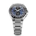 Японские наручные часы Citizen AT8238-84L сочетают в себе передовые технологии, надежность и стильный современный дизайн. Корпус и браслет выполнены из высокопрочного материала Super Titanium, который в пять раз тверже и на 40% легче стали, а также отличается высокой устойчивостью к царапинам и коррозии, а на безельБезельВнешний ободок, закрепляющий стекло. В спортивных часах так называется поворотное кольцо с делениями на циферблате, выполняет роль таймера – замеряет отрезки времени на шкале. Неподвижный безель – элемент декора. Однонаправленно вращающийся безель на дайверских часах позволяет фиксировать моменты погружения и выныривания на поверхность. нанесено черное IP-покрытиеIP-покрытиеМетод ионного напыления. Демонстрирует повышенную устойчивость к истиранию, окислению и химическим веществам. Под воздействием высокого давления и температуры около 1500°C молекулы металла надёжно соединяются с частицами корпуса часов.. Диаметр корпуса составляет 43,5 мм, толщина — 10 мм, а вес — всего 90 грамм, что обеспечивает легкость и комфорт при ежедневном ношении. Часы оснащены кварцевым хронографомХронографФункция позволяет измерять отрезки времени с особой точностью: часы, минуты, секунды. Верным признаком хронографа является наличие на циферблате 3 дополнительных окошек-счётчиков. на солнечной батарее с системой Eco-Drive, не требующей замены батарейки, и калибром Citizen H800, обеспечивающим до 6 месяцев работы без подзарядки и защиту от перезаряда. Особенностью модели является автоматическая синхронизация времени по радиосигналу в четырех регионах мира, охватывающая 26 часовых зон, а также функция мирового времениМировое время Полезное часовое усложнение, отображающее время в основных городах и известных областях по всему миру, оно связано с часовыми поясами, удобно для путешественников и бизнесменов. и вечного календаряВечный календарьКлассическое часовое усложнение, представляющее собой календарь, рассчитанный на несколько лет вперёд (стандартно – до 2099 года). Определяет текущую дату, день недели, месяц., рассчитанного до 2100 года. На синем циферблате расположены центральные часовая и минутная стрелки с люминесцентным покрытиемЛюминесцентное покрытиеПозволяет считывать показания времени в темноте. Производители наносят на стрелки, часовые индексы, безель или поверхность циферблата светонакопительный состав, дающий холодное свечение. для отличной читаемости в темноте, а также апертура даты в позиции 3 часов и отдельный малый циферблат для секундной стрелки. Часы поддерживают 12/24-часовой формат времени, оснащены секундомеромСекундомерСекундоме́р — прибор, способный измерять интервалы времени с точностью до долей секунды. с точностью 1/20 секунды и максимальным временем измерения 60 минут, а также индикатором окончания ресурса элемента питания EOLEOLПредставляет собой систему, уведомляющую владельца часов о необходимости замены элемента питания. За 2 недели до полного разряда батарейки секундная стрелка перестаёт ходить чётко и начинает перепрыгивать на 3-4 деления.. Устойчивое к царапинам сапфировое стеклоСапфировое стеклоПрочный и надёжный материал из кристалла сапфира синтетического происхождения, характеризующийся особой твёрдостью и устойчивостью к царапинам и повреждениям. с антибликовым покрытиемАнтибликовое покрытиеС
