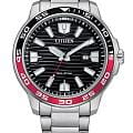 Часы Citizen AW1527-86E – это стильная и надежная модель японского производства, идеально подходящая для активного образа жизни. Корпус выполнен из высококачественной нержавеющей стали, в то время как на безельБезельВнешний ободок, закрепляющий стекло. В спортивных часах так называется поворотное кольцо с делениями на циферблате, выполняет роль таймера – замеряет отрезки времени на шкале. Неподвижный безель – элемент декора. Однонаправленно вращающийся безель на дайверских часах позволяет фиксировать моменты погружения и выныривания на поверхность. нанесено черное и красное PVD-покрытиеPVDУльтратонкое покрытие наносится в технике вакуумного напыления, сочетает в себе нитрид титана особой прочности со слоем золота или оксида хрома. Несёт в себе декоративную или защитную функцию., браслет также стальной. Черный циферблат украшен метками в виде штрихов и оснащен календарем с окошком даты. Защиту от повреждений обеспечивает прочное минеральное стеклоМинеральное стеклоМинеральное стекло представляет собой искусственно выращенный минерал кварца. Такое стекло отличается особой устойчивостью к повреждениям и царапинам. Уступает по некоторым качествам сапфировому стеклу., а водонепроницаемость до 100 метров позволяет не снимать часы во время плавания и занятий спортом. Внутри установлен надежный кварцевый механизм Citizen J810 с инновационной системой Eco-Drive, которая питается от солнечной энергии и не требует замены батарейки, обеспечивая запас хода до 240 дней. Стрелки и часовые метки с люминесцентным покрытиемЛюминесцентное покрытиеПозволяет считывать показания времени в темноте. Производители наносят на стрелки, часовые индексы, безель или поверхность циферблата светонакопительный состав, дающий холодное свечение. обеспечивают отличную читаемость даже в темноте. Функция индикации заряда EOLEOLПредставляет собой систему, уведомляющую владельца часов о необходимости замены элемента питания. За 2 недели до полного разряда батарейки секундная стрелка перестаёт ходить чётко и начинает перепрыгивать на 3-4 деления. подскажет, когда потребуется подзарядка. Корпус диаметром 45,9 мм, толщина 11,8 мм, ширина браслета 22 мм, вес модели составляет 160 граммов. Завинчивающаяся задняя крышка украшена фирменной гравировкой Eco-Drive, а заводная головка оснащена защитой. Надежная раскладная застёжкаРаскладная застёжкаТакой тип застёжки используется только на браслетах из металла. Она никогда не раскрывается полностью, происходит разделение на 2 и более частей. Раскладывающая застёжка снизит вероятность потери часов к минимуму. браслета с системой блокировки гарантирует комфортное и безопасное ношение.