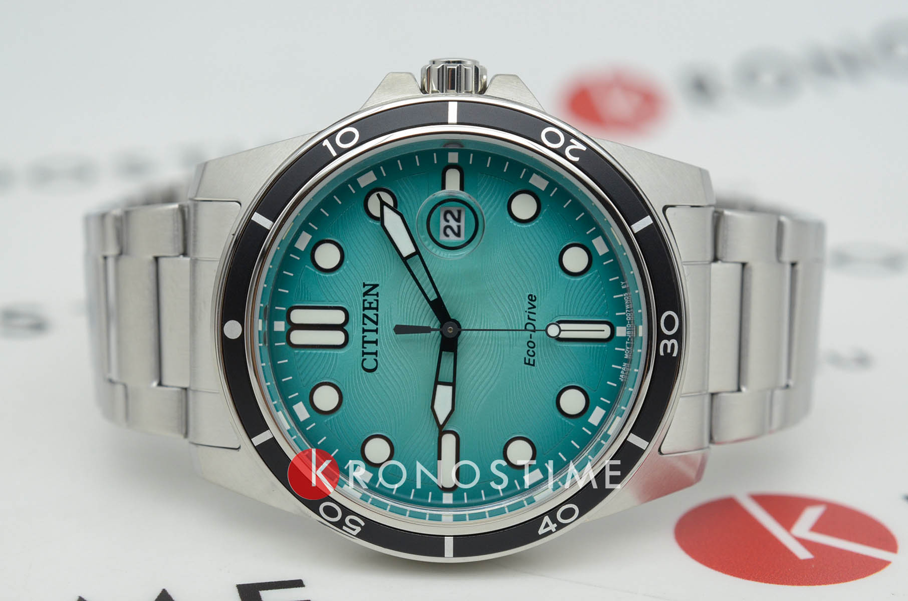 Citizen AW1816-89L — это стильные и практичные часы японского производства, которые станут отличным повседневным аксессуаром для активных мужчин. Модель оснащена современным кварцевым механизмом Citizen J810 и инновационной системой Eco-Drive, работающей на солнечной энергии, благодаря чему часы не требуют замены батарейки, а запас хода достигает 240 дней. Корпус диаметром 41,5 мм и толщиной 11,8 мм выполнен из прочной нержавеющей стали, а на безельБезельВнешний ободок, закрепляющий стекло. В спортивных часах так называется поворотное кольцо с делениями на циферблате, выполняет роль таймера – замеряет отрезки времени на шкале. Неподвижный безель – элемент декора. Однонаправленно вращающийся безель на дайверских часах позволяет фиксировать моменты погружения и выныривания на поверхность. нанесено черное IP-покрытиеIP-покрытиеМетод ионного напыления. Демонстрирует повышенную устойчивость к истиранию, окислению и химическим веществам. Под воздействием высокого давления и температуры около 1500°C молекулы металла надёжно соединяются с частицами корпуса часов., что обеспечивает надежность и долговечность. Бирюзовый циферблат украшен метками в виде точек и штрихов, а стрелки и метки с люминесцентным покрытиемЛюминесцентное покрытиеПозволяет считывать показания времени в темноте. Производители наносят на стрелки, часовые индексы, безель или поверхность циферблата светонакопительный состав, дающий холодное свечение. гарантируют отличную видимость времени даже в темноте. Окошко даты с увеличительным стеклом расположено в положении 3 часа, а заводная головка с защитой и завинчивающаяся задняя крышка повышают уровень безопасности и герметичности. Часы оснащены функцией индикации заряда EOLEOLПредставляет собой систему, уведомляющую владельца часов о необходимости замены элемента питания. За 2 недели до полного разряда батарейки секундная стрелка перестаёт ходить чётко и начинает перепрыгивать на 3-4 деления. и системой предотвращения перезарядки для дополнительного удобства. Минеральное стеклоМинеральное стеклоМинеральное стекло представляет собой искусственно выращенный минерал кварца. Такое стекло отличается особой устойчивостью к повреждениям и царапинам. Уступает по некоторым качествам сапфировому стеклу. эффективно защищает циферблат от царапин. Водозащита 100WR позволяет носить часы во время плавания и занятий водными видами спорта. Стальной браслет с раскладной застёжкойРаскладная застёжкаТакой тип застёжки используется только на браслетах из металла. Она никогда не раскрывается полностью, происходит разделение на 2 и более частей. Раскладывающая застёжка снизит вероятность потери часов к минимуму. обеспечивает комфорт и надежную фиксацию на руке, а вес модели составляет 138 грамм, что делает часы удобными для ежедневного ношения.