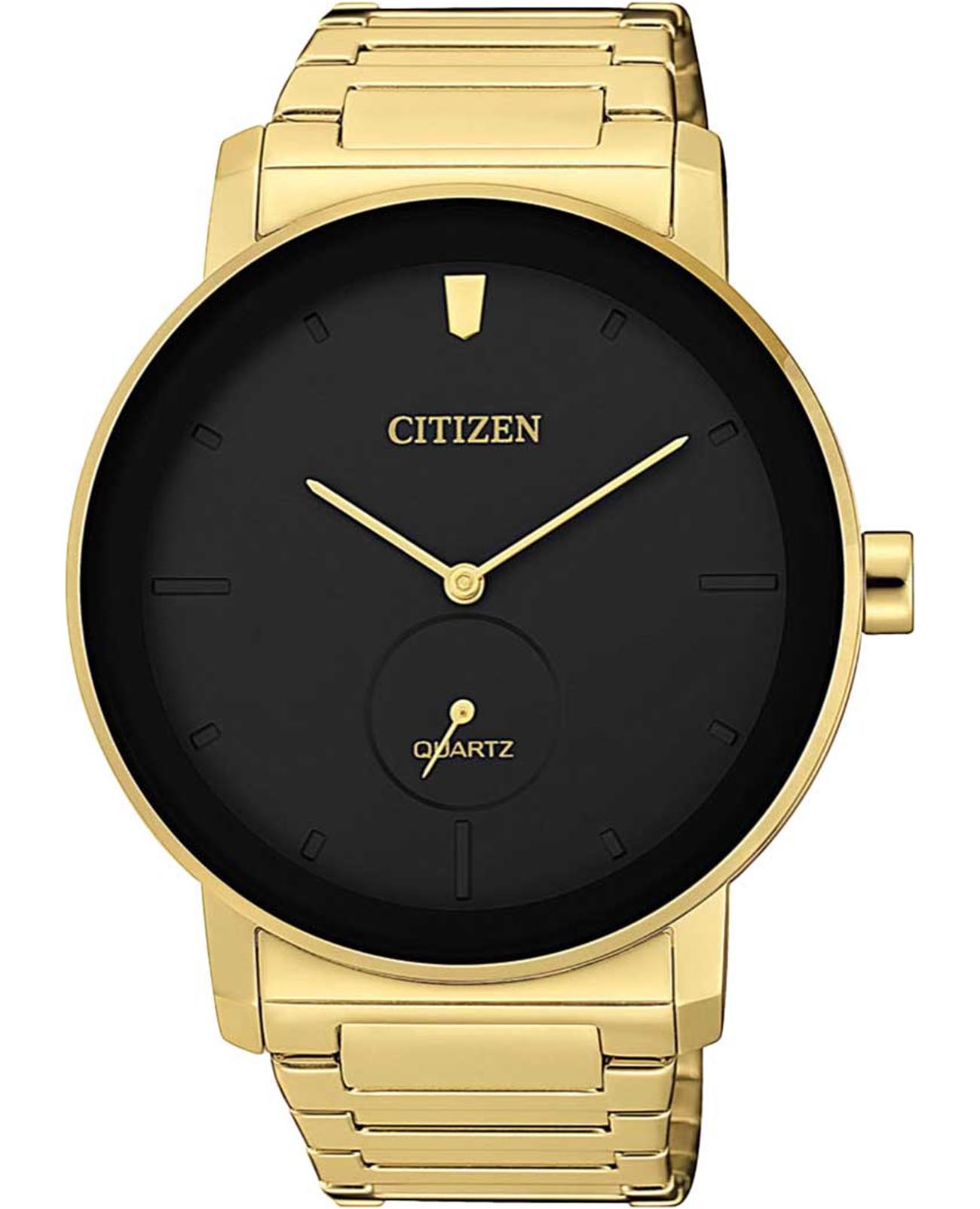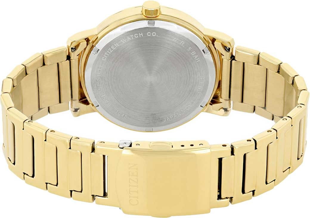 Часы Citizen BE9182-57E — это стильная модель, сочетающая японское качество и современный дизайн. Круглый корпус диаметром 42 мм выполнен из прочной нержавеющей стали с износостойким золотистым IP-покрытиемIP-покрытиеМетод ионного напыления. Демонстрирует повышенную устойчивость к истиранию, окислению и химическим веществам. Под воздействием высокого давления и температуры около 1500°C молекулы металла надёжно соединяются с частицами корпуса часов., что обеспечивает долговечность и привлекательный внешний вид. Черный циферблат украшен лаконичными метками в виде штрихов, а секундная стрелка вынесена на отдельный малый циферблат, подчеркивая оригинальность оформления. Механизм работает на точном японском кварцевом калибре Citizen 1045, что гарантирует надежность и стабильность хода. Стальной браслет также с IP-покрытиемIP-покрытиеМетод ионного напыления. Демонстрирует повышенную устойчивость к истиранию, окислению и химическим веществам. Под воздействием высокого давления и температуры около 1500°C молекулы металла надёжно соединяются с частицами корпуса часов. и оснащен удобной раскладной застёжкойРаскладная застёжкаТакой тип застёжки используется только на браслетах из металла. Она никогда не раскрывается полностью, происходит разделение на 2 и более частей. Раскладывающая застёжка снизит вероятность потери часов к минимуму., обеспечивая комфорт при ежедневном ношении. Минеральное стеклоМинеральное стеклоМинеральное стекло представляет собой искусственно выращенный минерал кварца. Такое стекло отличается особой устойчивостью к повреждениям и царапинам. Уступает по некоторым качествам сапфировому стеклу. защищает циферблат от мелких повреждений, а водозащита 50WR позволяет не снимать часы при мытье рук или во время дождя. Вес модели составляет 120 грамм, что делает её приятной и заметной на запястье.