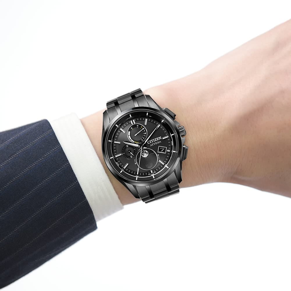 Часы Citizen BY1006-62E — это гармоничное сочетание современного японского стиля, передовых технологий и высокого уровня надежности. Модель выполнена в прочном и легком корпусе из инновационного суперлегкого титана Super Titanium Duratect TIC с черным DLC-покрытиемDLC-покрытиеDiamond like carbon - одно из лучших видов покрытия, представляющее собой углерод с алмазными свойствами. На поверхность материала наносятся распавшиеся молекулы углерода, превращающиеся в плёнку из алмазоподобных связей, которая перенимает твёрдость алмаза. диаметром 41,5 мм и толщиной 10,8 мм, дополненном браслетом шириной 22 мм с удобной раскладной застёжкойРаскладная застёжкаТакой тип застёжки используется только на браслетах из металла. Она никогда не раскрывается полностью, происходит разделение на 2 и более частей. Раскладывающая застёжка снизит вероятность потери часов к минимуму.. Кварцевый механизм калибра Citizen H874 оснащен системой Eco-Drive, которая работает на солнечной энергии, не требуя замены батарейки, и обеспечивает запас хода до 180 дней. Часы отличаются высокой точностью хода — отклонение составляет всего +/- 15 секунд в месяц. Среди функциональных особенностей — автоматическая настройка времени по радиосигналу для Германии, Японии, США и Китая, вечный календарь, функция мирового времениМировое время Полезное часовое усложнение, отображающее время в основных городах и известных областях по всему миру, оно связано с часовыми поясами, удобно для путешественников и бизнесменов. , 12/24-часовой формат, автоматическое переключение летнего и зимнего времени, а также уникальный полностью автоматизированный радиоуправляемый механизм определения фаз Луны с возможностью отображения как для северного, так и южного полушария. На черном циферблате расположена апертура даты в положении 4 часа, все стрелки с люминесцентным покрытиемЛюминесцентное покрытиеПозволяет считывать показания времени в темноте. Производители наносят на стрелки, часовые индексы, безель или поверхность циферблата светонакопительный состав, дающий холодное свечение. для отличной читаемости в любое время суток. Устойчивое к царапинам сапфировое стеклоСапфировое стеклоПрочный и надёжный материал из кристалла сапфира синтетического происхождения, характеризующийся особой твёрдостью и устойчивостью к царапинам и повреждениям. с антибликовым покрытиемАнтибликовое покрытиеСлой оксида металла в 0,13-0,3 микрон, благодаря которому стекло часов не бликует и не отражает свет. Антибликовое покрытие уменьшает отражение света в 10 раз, обеспечивая отличную читаемость показателей циферблата. надежно защищает циферблат. Водозащита уровня WR 100 позволяет использовать часы при плавании без погружения.