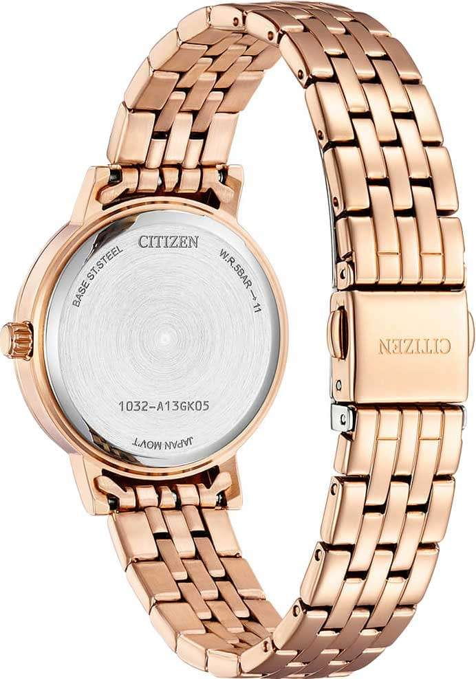 Часы Citizen EL3108-53D представляют собой элегантную модель, выполненную в Японии, сочетающую в себе современные технологии и утончённый дизайн. Корпус и браслет изготовлены из прочной нержавеющей стали с золотистым IP-покрытиемIP-покрытиеМетод ионного напыления. Демонстрирует повышенную устойчивость к истиранию, окислению и химическим веществам. Под воздействием высокого давления и температуры около 1500°C молекулы металла надёжно соединяются с частицами корпуса часов., что обеспечивает долговечность и привлекательный внешний вид. Диаметр корпуса составляет 31 мм, а толщина — всего 7 мм, что делает часы изящными и аккуратными на запястье. Особое внимание привлекает безельБезельВнешний ободок, закрепляющий стекло. В спортивных часах так называется поворотное кольцо с делениями на циферблате, выполняет роль таймера – замеряет отрезки времени на шкале. Неподвижный безель – элемент декора. Однонаправленно вращающийся безель на дайверских часах позволяет фиксировать моменты погружения и выныривания на поверхность., украшенный мерцающими кристаллами, которые придают часам особый шарм и изысканность. Надёжный кварцевый механизм гарантирует точность хода, а водозащита уровня WR 50 позволяет не снимать часы при мытье рук или во время дождя. Перламутровый циферблат украшен часовыми индексами в виде точек и цифр, а также оснащён центральными стрелками часов, минут и секунд для удобного считывания времени и кристаллами. Минеральное стеклоМинеральное стеклоМинеральное стекло представляет собой искусственно выращенный минерал кварца. Такое стекло отличается особой устойчивостью к повреждениям и царапинам. Уступает по некоторым качествам сапфировому стеклу. устойчиво к появлению мелких царапин, сохраняя прозрачность и презентабельный вид. Стальной браслет с золотистым IP-покрытиемIP-покрытиеМетод ионного напыления. Демонстрирует повышенную устойчивость к истиранию, окислению и химическим веществам. Под воздействием высокого давления и температуры около 1500°C молекулы металла надёжно соединяются с частицами корпуса часов. и раскладной застёжкойРаскладная застёжкаТакой тип застёжки используется только на браслетах из металла. Она никогда не раскрывается полностью, происходит разделение на 2 и более частей. Раскладывающая застёжка снизит вероятность потери часов к минимуму. надежно фиксирует часы на запястье, обеспечивая комфорт при ежедневном ношении.