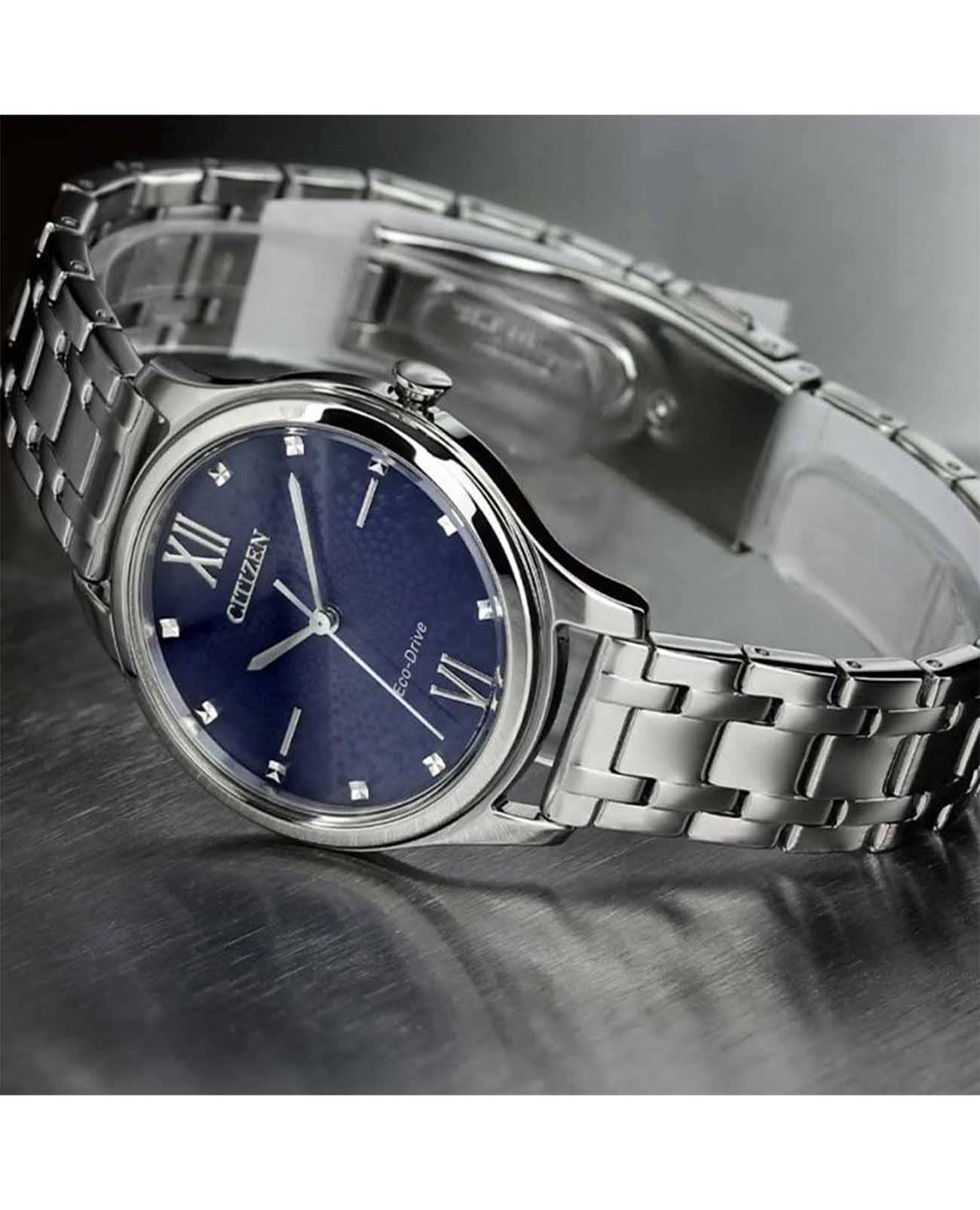 Часы Citizen EM0500-73L — это стильная модель, сочетающая в себе утонченную классику и современные технологии. Корпус и браслет изготовлены из прочной нержавеющей стали, что обеспечивает не только износостойкость, но и элегантный внешний вид. Синий циферблат отличается кристаллами и лаконичным оформлением и защищён надёжным минеральным стекломМинеральное стеклоМинеральное стекло представляет собой искусственно выращенный минерал кварца. Такое стекло отличается особой устойчивостью к повреждениям и царапинам. Уступает по некоторым качествам сапфировому стеклу., устойчивым к царапинам. Часы оснащены инновационной системой Eco-Drive, которая позволяет заряжаться от любого источника света и не требует замены батарейки, а запас энергии составляет до 180 дней. Механизм Citizen E031 гарантирует точность хода, а функция индикации заряда EOLEOLПредставляет собой систему, уведомляющую владельца часов о необходимости замены элемента питания. За 2 недели до полного разряда батарейки секундная стрелка перестаёт ходить чётко и начинает перепрыгивать на 3-4 деления. своевременно подскажет о необходимости подзарядки. Водозащита до 50 метров обеспечивает дополнительную практичность и защищает механизм от влаги при повседневном использовании. Браслет шириной 14 мм и длиной 143 мм удобно фиксируется на запястье с помощью раскладной застёжкиРаскладная застёжкаТакой тип застёжки используется только на браслетах из металла. Она никогда не раскрывается полностью, происходит разделение на 2 и более частей. Раскладывающая застёжка снизит вероятность потери часов к минимуму. с системой блокировки, что обеспечивает надёжность и комфорт в течение всего дня. Диаметр корпуса составляет 32 мм, а толщина — 7,6 мм, благодаря чему часы выглядят изящно и подходят для любого случая.