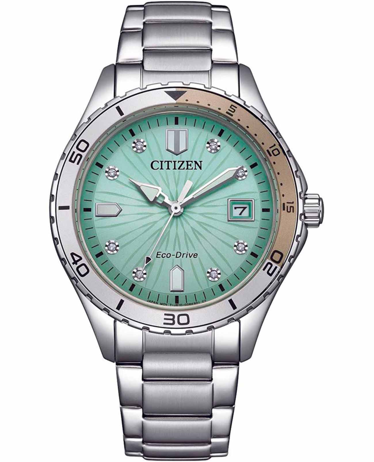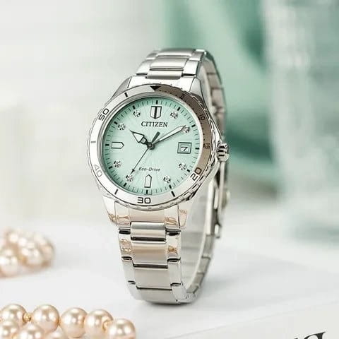 Элегантные женские часы Citizen FE6170-88L станут ярким акцентом любого образа благодаря современному дизайну и высокому качеству исполнения. Корпус диаметром 36,8 мм и толщиной 9,8 мм выполнен из прочной нержавеющей стали, что гарантирует долговечность и надежность. Особое внимание привлекает бирюзовый циферблат, украшенный сверкающими кристаллами в виде часовых меток, что придаёт модели утончённый и изысканный вид. Кварцевый механизм с калибром Citizen J810 работает на инновационной системе Eco-Drive — часы заряжаются от любого источника света, обеспечивая запас хода до 240 дней и не требуя замены батарейки. Функции индикации заряда EOLEOLПредставляет собой систему, уведомляющую владельца часов о необходимости замены элемента питания. За 2 недели до полного разряда батарейки секундная стрелка перестаёт ходить чётко и начинает перепрыгивать на 3-4 деления.  и предотвращения перезарядки обеспечивают дополнительное удобство в использовании. Окошко даты расположено на отметке 3 часа для быстрого просмотра текущего числа. Прочное минеральное стеклоМинеральное стеклоМинеральное стекло представляет собой искусственно выращенный минерал кварца. Такое стекло отличается особой устойчивостью к повреждениям и царапинам. Уступает по некоторым качествам сапфировому стеклу. защищает циферблат от случайных царапин, а водозащита уровня 100WR позволяет использовать часы даже во время плавания. А безельБезельВнешний ободок, закрепляющий стекло. В спортивных часах так называется поворотное кольцо с делениями на циферблате, выполняет роль таймера – замеряет отрезки времени на шкале. Неподвижный безель – элемент декора. Однонаправленно вращающийся безель на дайверских часах позволяет фиксировать моменты погружения и выныривания на поверхность. часов с частичным IP-покрытиемIP-покрытиеМетод ионного напыления. Демонстрирует повышенную устойчивость к истиранию, окислению и химическим веществам. Под воздействием высокого давления и температуры около 1500°C молекулы металла надёжно соединяются с частицами корпуса часов. вращается в одном направлении. Стрелки с люминесцентным покрытиемЛюминесцентное покрытиеПозволяет считывать показания времени в темноте. Производители наносят на стрелки, часовые индексы, безель или поверхность циферблата светонакопительный состав, дающий холодное свечение. обеспечивают отличную читаемость времени даже в темное время суток. Стальной браслет с раскладной застёжкойРаскладная застёжкаТакой тип застёжки используется только на браслетах из металла. Она никогда не раскрывается полностью, происходит разделение на 2 и более частей. Раскладывающая застёжка снизит вероятность потери часов к минимуму. обеспечивает комфортное и надежное крепление на запястье. Модель произведена в Японии и отличается высоким стандартом качества.