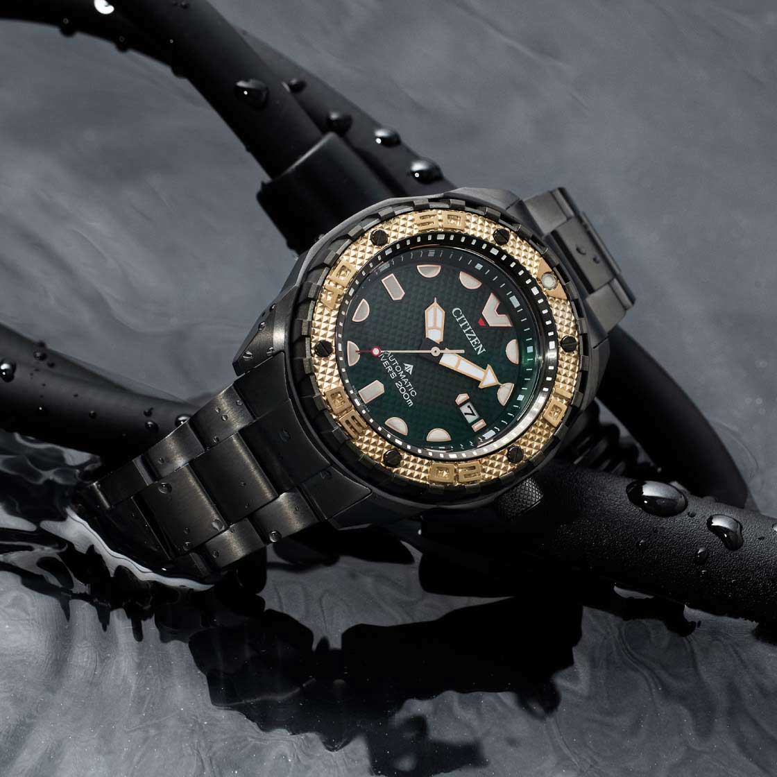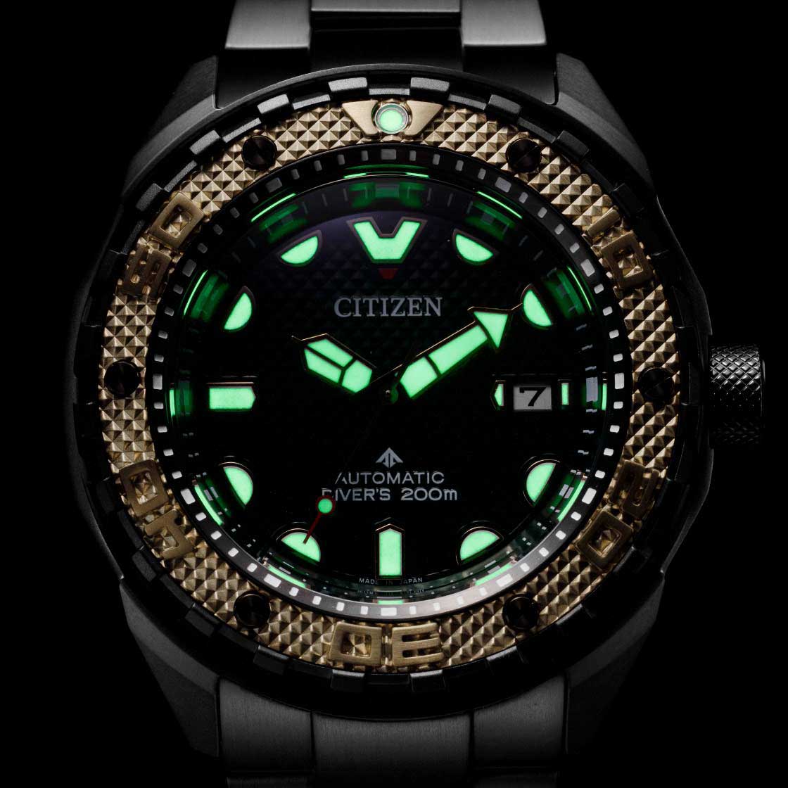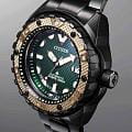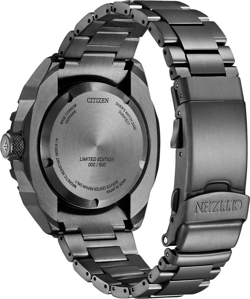Citizen Promaster NB6008-82X - спортивный характер этих часов оценят современные мужчины, которые отдают предпочтение практичным и функциональным вещам. Лимитированная серия - 500 экземпляров. Сертифицированные часы для дайвинга (ISO 6425). Корпус из титана с Duratect MRK + DLC-покрытиеDLC-покрытиеDiamond like carbon - одно из лучших видов покрытия, представляющее собой углерод с алмазными свойствами. На поверхность материала наносятся распавшиеся молекулы углерода, превращающиеся в плёнку из алмазоподобных связей, которая перенимает твёрдость алмаза. диаметром 46 мм идеально сбалансирован. Сапфировое стеклоСапфировое стеклоПрочный и надёжный материал из кристалла сапфира синтетического происхождения, характеризующийся особой твёрдостью и устойчивостью к царапинам и повреждениям. с антибликовым покрытием обеспечивает отличную защиту циферблата от царапин. Титановый браслет на раскладной застёжкеРаскладная застёжкаТакой тип застёжки используется только на браслетах из металла. Она никогда не раскрывается полностью, происходит разделение на 2 и более частей. Раскладывающая застёжка снизит вероятность потери часов к минимуму. с удлинением для дайверов идеально дополняют дизайн часов, обеспечивая комфортное ношение. Стрелки и метки на циферблате имеют люминесцентное покрытиеЛюминесцентное покрытиеПозволяет считывать показания времени в темноте. Производители наносят на стрелки, часовые индексы, безель или поверхность циферблата светонакопительный состав, дающий холодное свечение. позволяющее легко определять время даже в темноте. БезельБезельВнешний ободок, закрепляющий стекло. В спортивных часах так называется поворотное кольцо с делениями на циферблате, выполняет роль таймера – замеряет отрезки времени на шкале. Неподвижный безель – элемент декора. Однонаправленно вращающийся безель на дайверских часах позволяет фиксировать моменты погружения и выныривания на поверхность. вращается в одном направлении. Запас хода 42 часа. Часы обладают впечатляющей водонепроницаемостью до 200WR, что делает их идеальными для плавания, ныряния и погружений с аквалангом. Завинчивающаяся задняя крышка и заводная головка.
