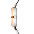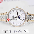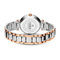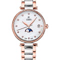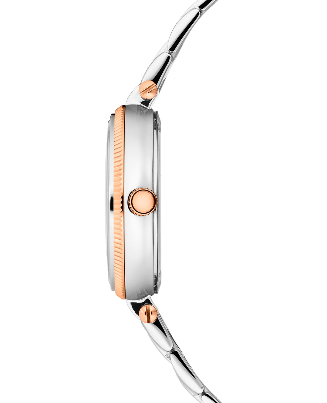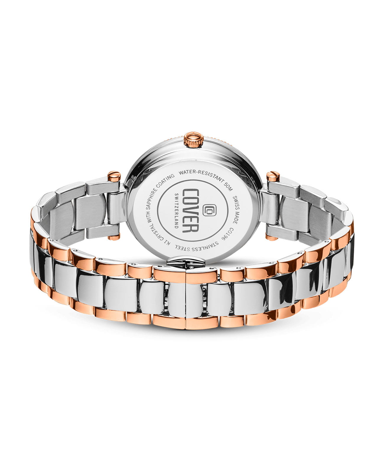 Женские наручные часы Cover CO196.03 из коллекции Fly Me To The Moon сочетают в себе элегантность и современные технологии. Модель обладает круглым корпусом диаметром 32 мм, изготовленным из нержавеющей стали с PVDPVDУльтратонкое покрытие наносится в технике вакуумного напыления, сочетает в себе нитрид титана особой прочности со слоем золота или оксида хрома. Несёт в себе декоративную или защитную функцию. покрытием цвета розового золота, что придает часам благородный вид. Браслет выполнен из стали с частичным покрытием, оснащен застежкой-бабочкойЗастёжка "бабочка"Такой вид застёжки дополняется предохранителями, помогающими избежать случайного раскрытия браслета. Обладают изящным исполнением. , обеспечивающей комфортное ношение. Молочно-белый перламутровый циферблат украшен 11 кристаллами Swarovski, выполняющими роль часовых индексов, а также имеет круглую апертуру даты на «3 часах» и индикатор фаз Луны на «6 часах». Для защиты использовано сапфировое стекло, устойчивое к царапинам. Часы работают на кварцевом механизме, гарантирующем точное время без необходимости подзаводки. Водонепроницаемость достигает 5 атмосфер (50 метров), что позволяет использовать их в повседневной жизни, включая контакт с водой, но не рекомендуется для плавания или дайвинга. Эти швейцарские часы станут прекрасным дополнением как классического, так и повседневного образа.